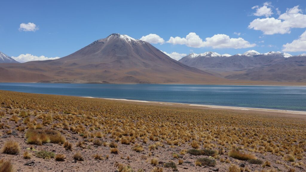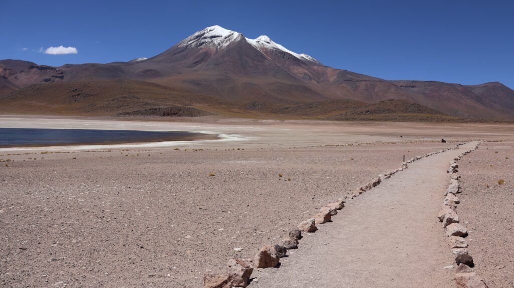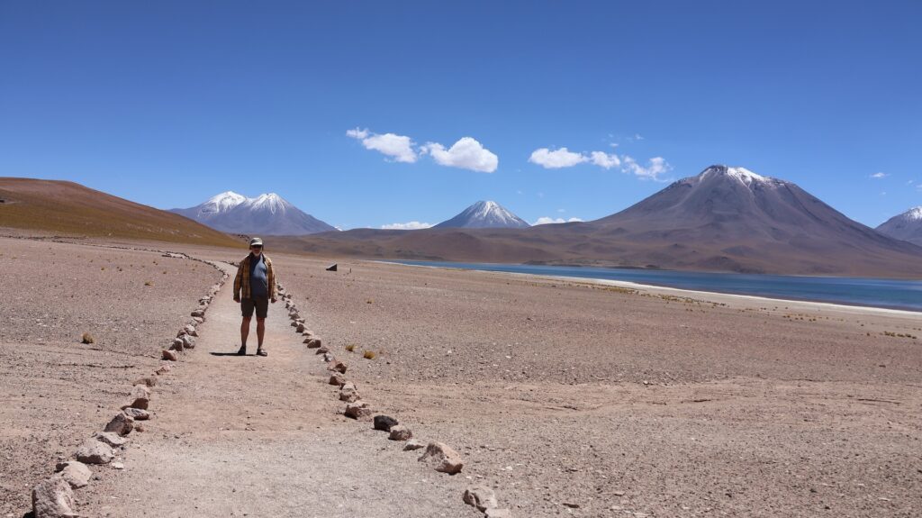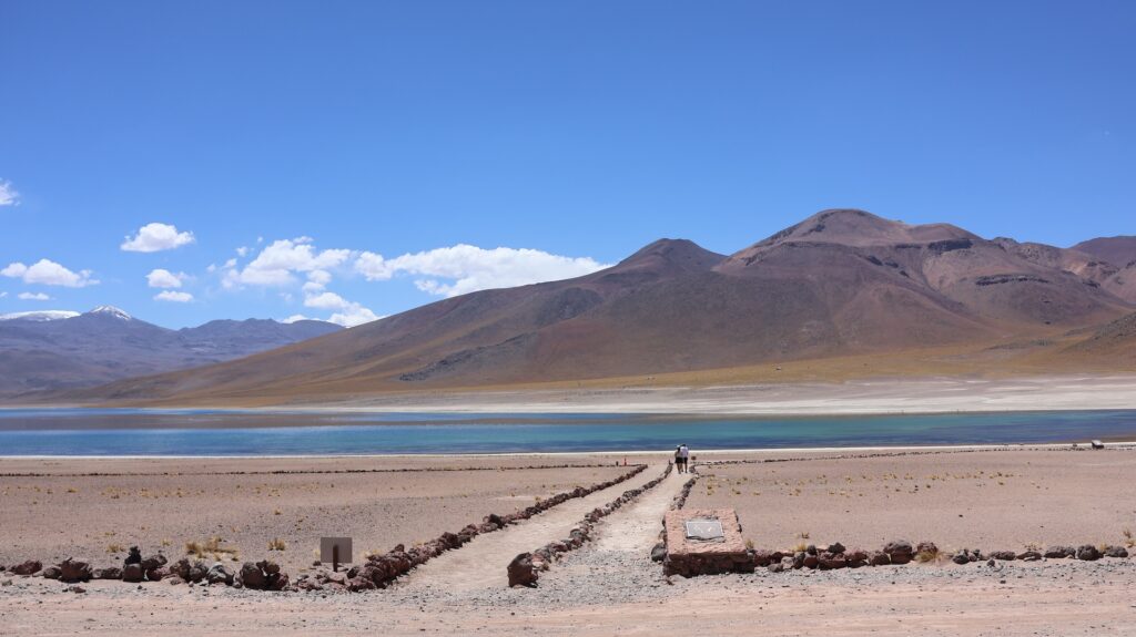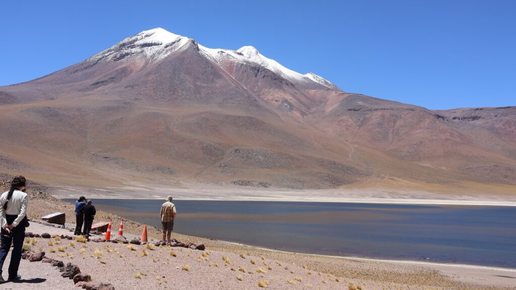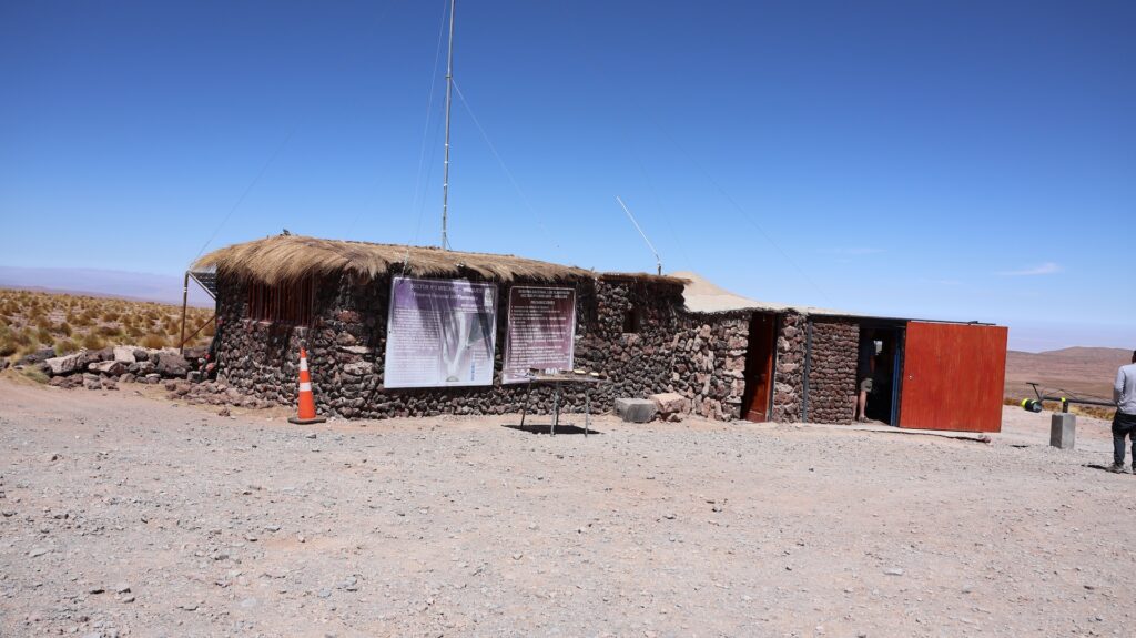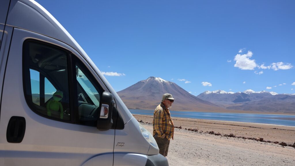 Ein Barriere und ein junger Mann hindern uns am Weiterfahren. Oh nein, das Foto gilt nicht als Eintritt. Wir sollten ein E-Mail bekommen haben! Da oben haben wir kein Internetempfang. Aber vielleicht kam ja vor unserer Abfahrt im Wäldchen ein E-Mail. Tatsächlich, wir dürfen hineinfahren. In der Hütte wird von Hand ein Billett ausgestellt!! Auf dem Dach hockt ein Vogel. Ein anderer Mann erklärt anhand einer Tafel und einer Miniaturanlage, was man darf und was nicht. Ich kann schon verstehen, dass sie diese Geldquelle schützen wollen. Pro Stunde dürfen nur eine bestimmte Anzahl Besucher hinein. Man darf nicht ans Wasser und muss überall innerhalb der Steinbegrenzung bleiben. Nebst der wunderbaren Landschaft mit den hohen Bergen, sehen wir Vicunas, eine Lama Art, Flamingos und andere Wasservögel. Allerdings sind sie weit weg. Manfred spürt die Höhe, es ist ihm schwindlig. Als er mit Aargauer Touristen redet, geht es ihm besser.