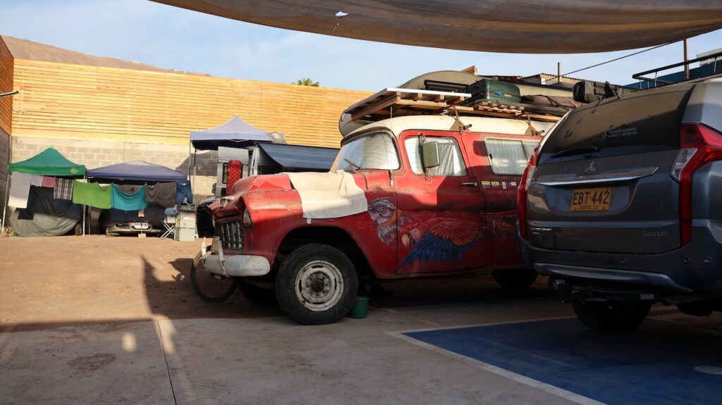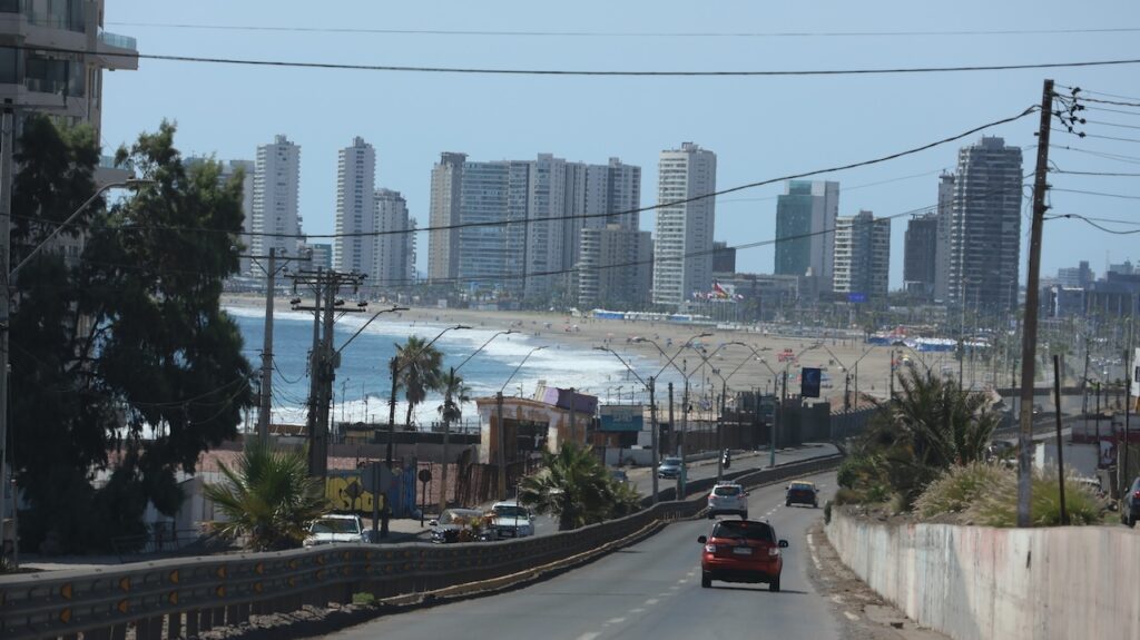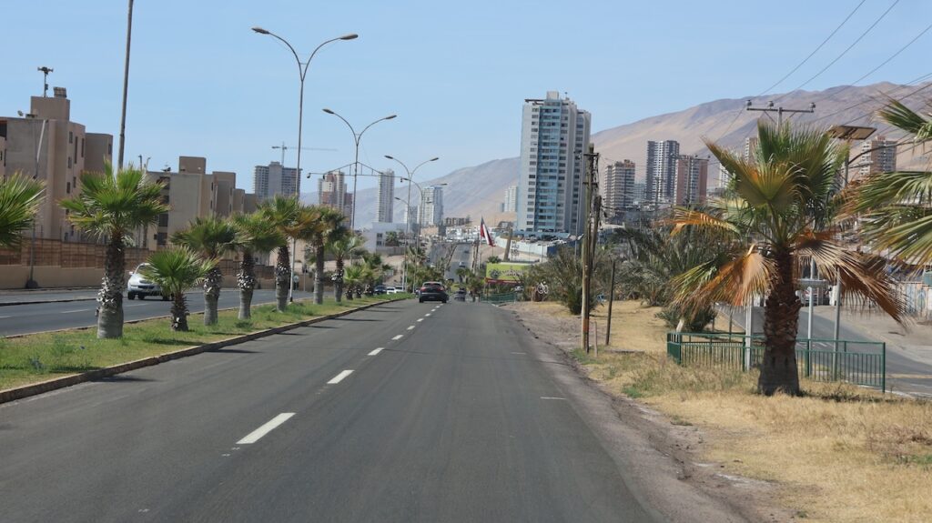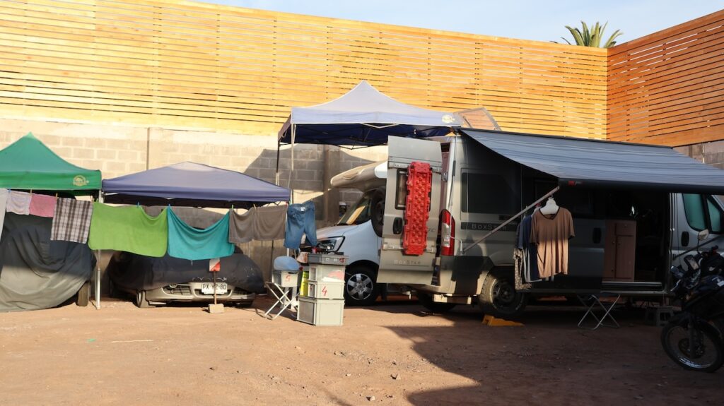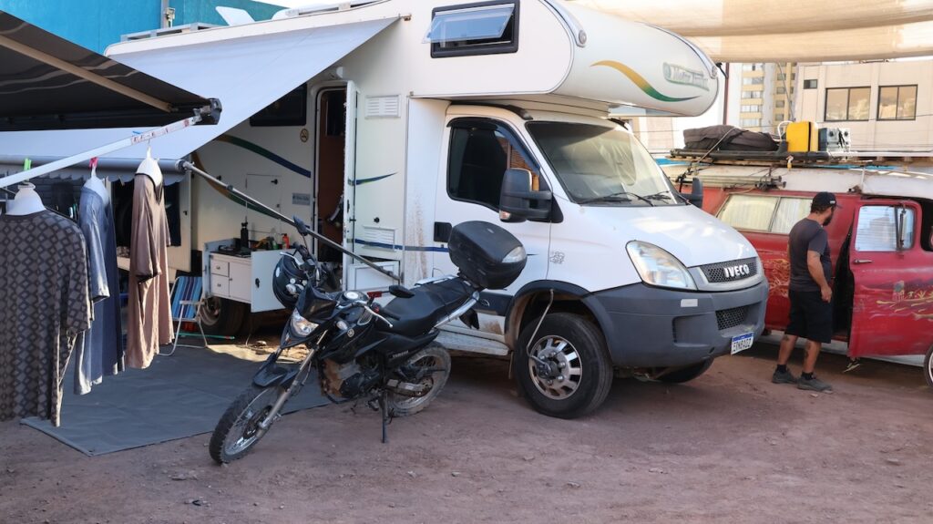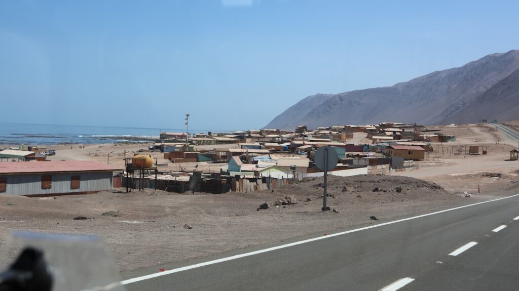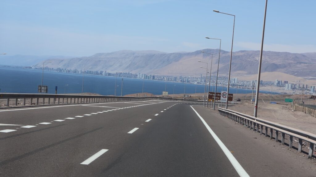 40 Kilometer vor Iquique liegt der Flughafen und da fängt auch die Autobahn in die Stadt an. 20 Kilometer vor der Stadt eine «Satellitenstadt». Dann erreichen wir Iquique. Manfred hat einen Stellplatz in der Stadt ausgesucht. Durch ein Tor fahren wir in eine Art Hinterhof. Da stehen Auto und Camper dicht aneinander. Junge Leute sind da aus Brasilien und Kolumbien. Der Eigner ist nicht da, aber die Jungen führen uns gut ein. Ich kann mit der Waschmaschine waschen. Manfred kümmert sich um das Auto. Die Bremsscheiben sind komplett «Am Arsch!» Entschuldigung, aber es ist so. Wir werden zwei Nächte hier verbringen und das Auto in Ordnung bringen. Auch müssen wir wieder mal das Gesehene einordnen und verdauen