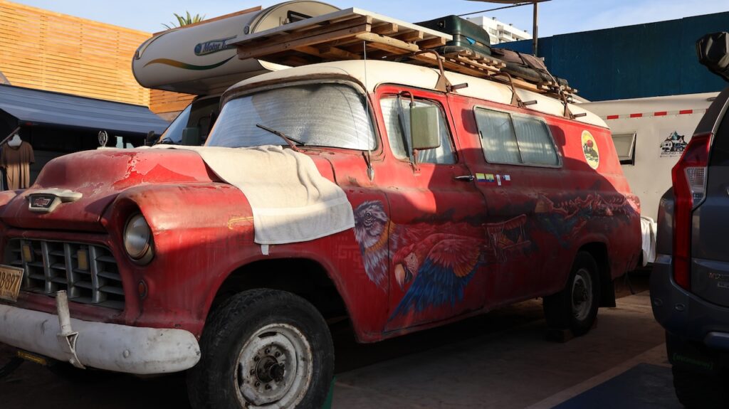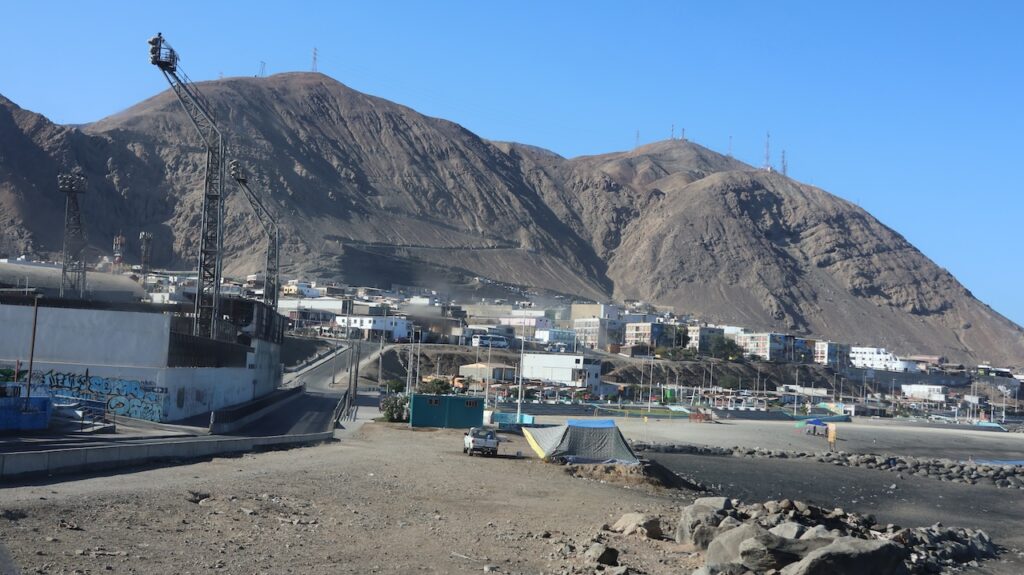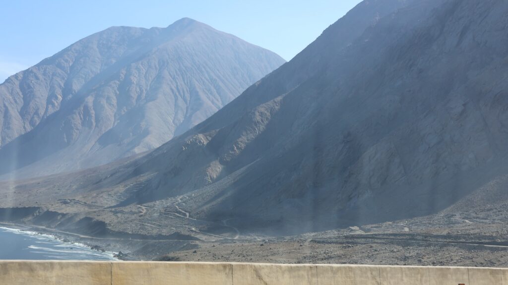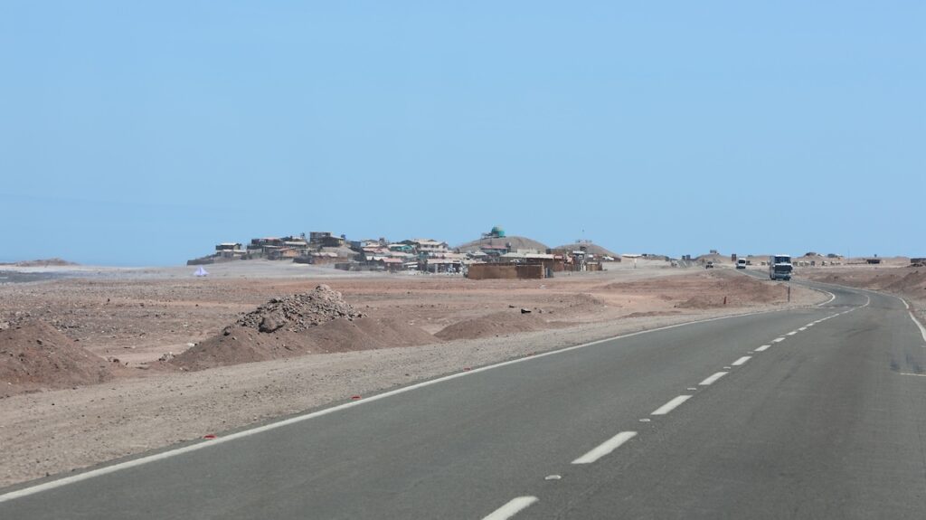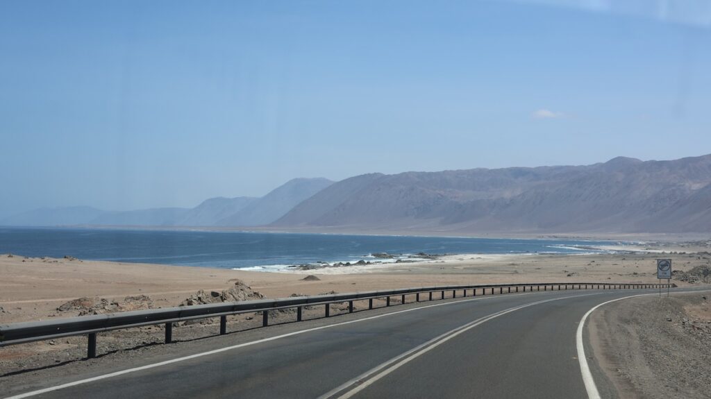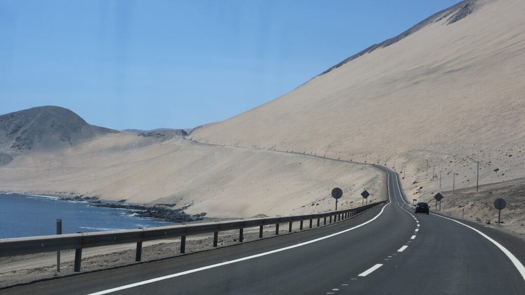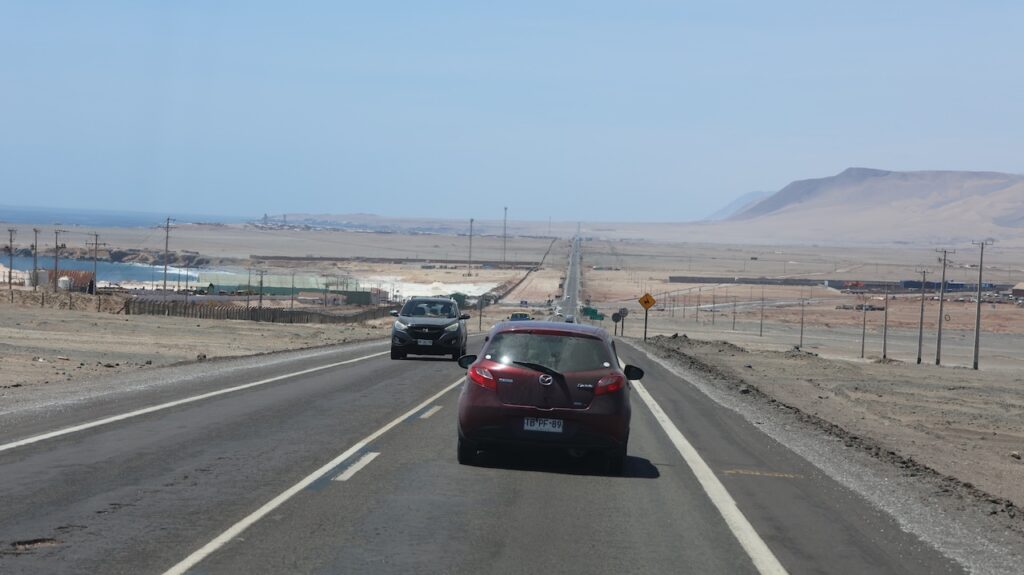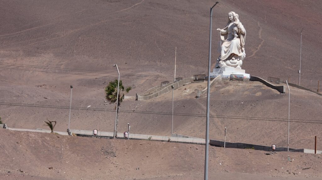 40 Kilometer vor Iquique liegt der Flughafen und da fängt auch die Autobahn in die Stadt an. 20 Kilometer vor der Stadt eine «Satellitenstadt». Dann erreichen wir Iquique. Manfred hat einen Stellplatz in der Stadt ausgesucht. Durch ein Tor fahren wir in eine Art Hinterhof. Da stehen Auto und Camper dicht aneinander. Junge Leute sind da aus Brasilien und Kolumbien. Der Eigner ist nicht da, aber die Jungen führen uns gut ein. Ich kann mit der Waschmaschine waschen. Manfred kümmert sich um das Auto. Die Bremsscheiben sind komplett «Am Arsch!» Entschuldigung, aber es ist so. Wir werden zwei Nächte hier verbringen und das Auto in Ordnung bringen. Auch müssen wir wieder mal das Gesehene einordnen und verdauen