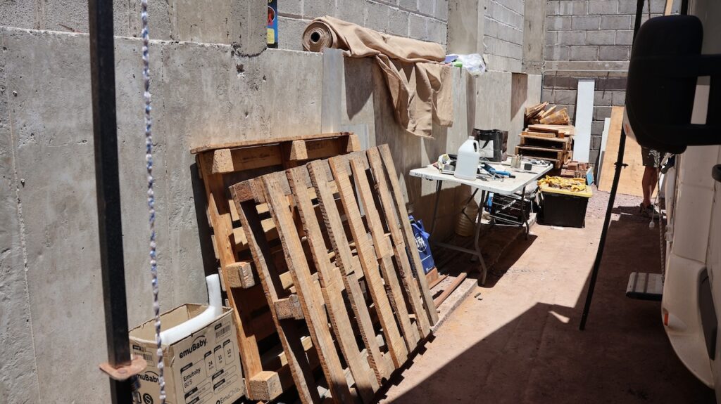 Wir haben Glück, dass wir hier gelandet sind. Der Eigner ist nett. Das Badezimmer neueren Datums und sauber. Rundherum findet Manfred Holzstücke und Paletten zum Unterlegen des Wagenhebers. Um 16 Uhr hat es Manfred geschafft. Bei 30 Grad Hitze hat er geduldig gearbeitet.