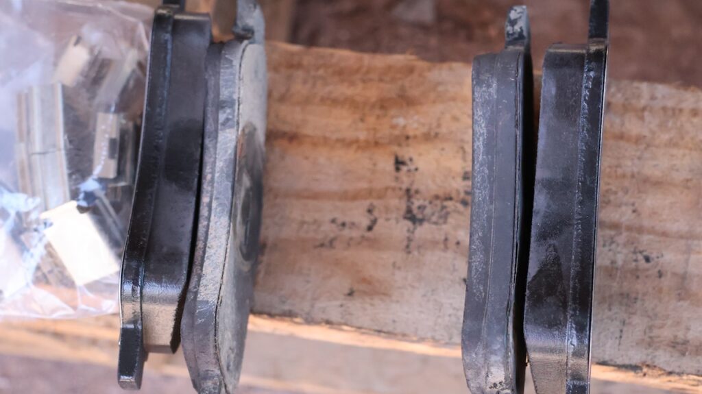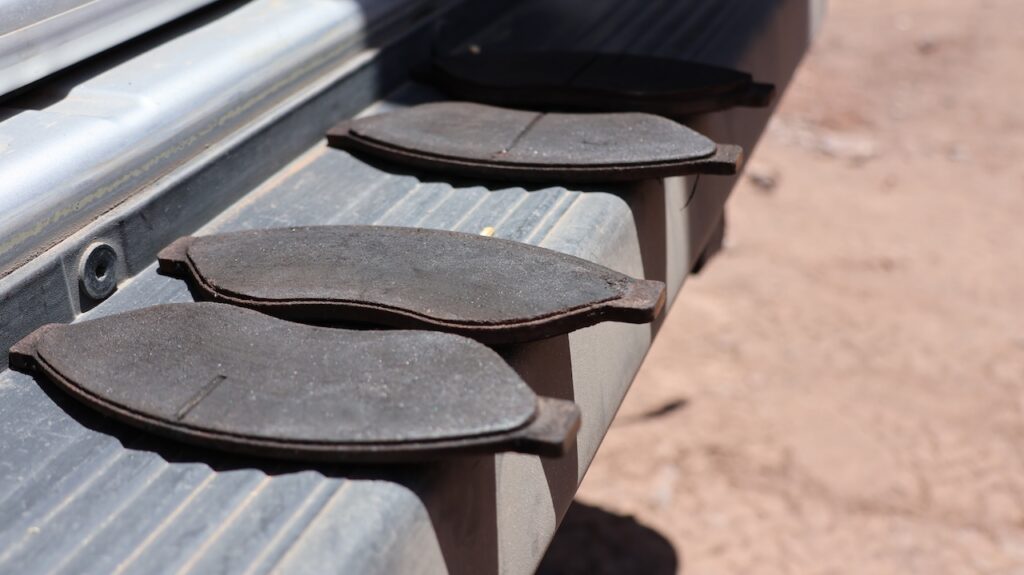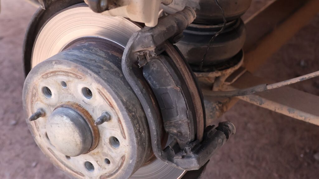Am Nachmittag bekommen die Hinterräder neue Bremsbelege. Dort läuft alles viel schneller und die Bremsbelege sind auch nicht so dünn wie an den Vorderrädern. Trotzdem will Manfred sie auswechseln. Sie haben alle rund 50’000 Kilometer gehalten.