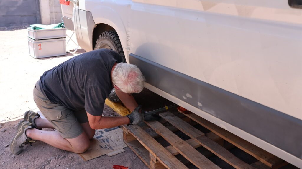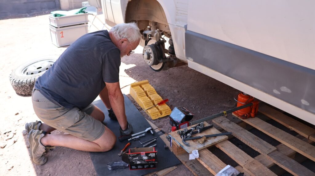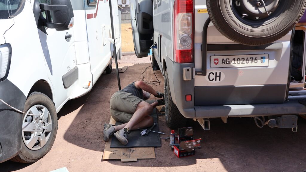 Manfred sprüht mehrere Male WD 40 an die festsitzende Schraube und wartet. Es vergehen 2 Stunden, bis sich die Schraube endlich lösen lässt. Der ganze Morgen vergeht, bis das eine Rad wieder am Camper dran ist.