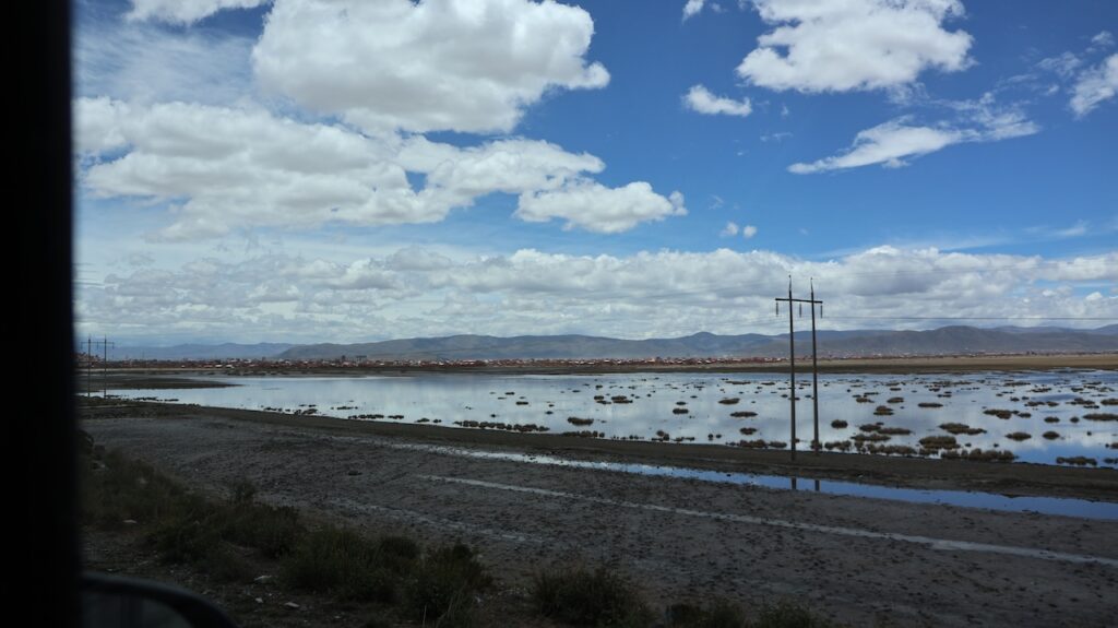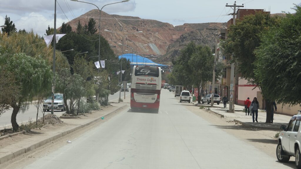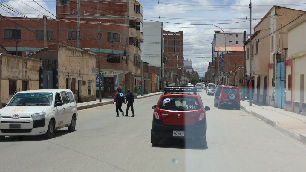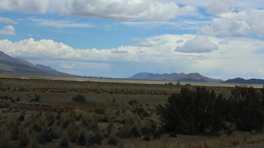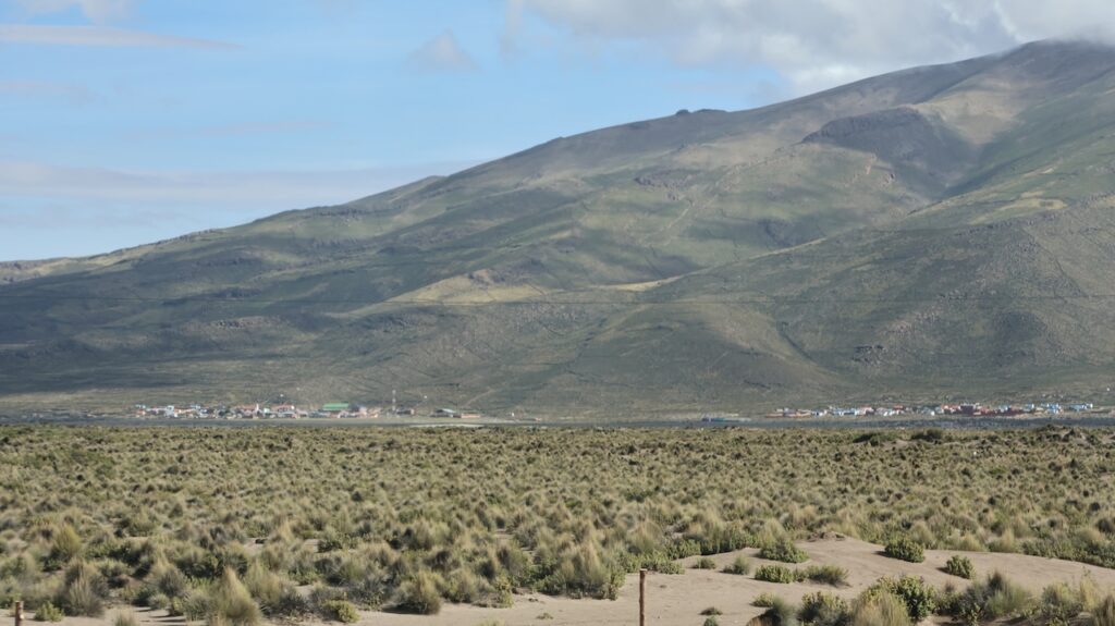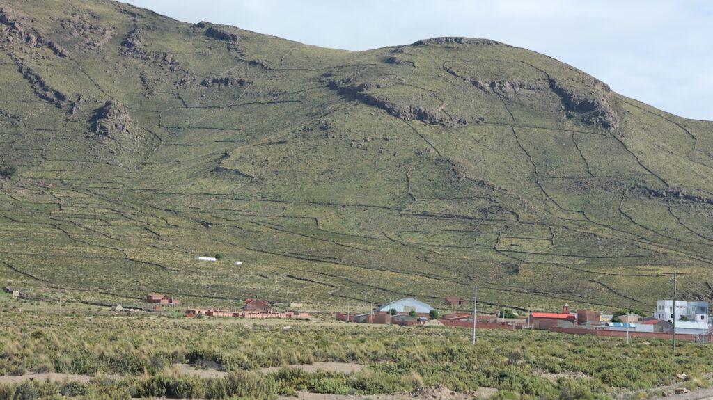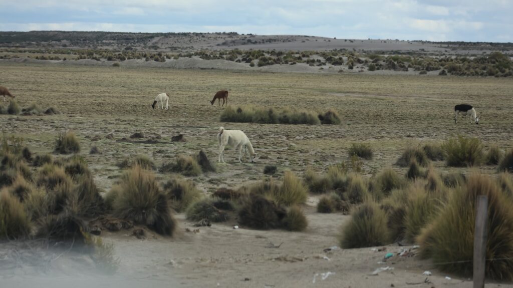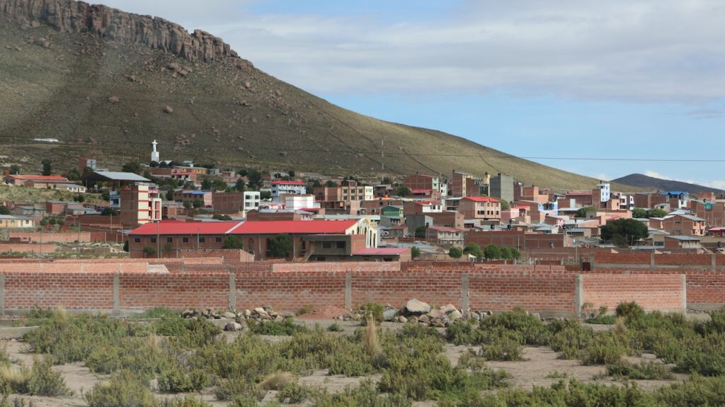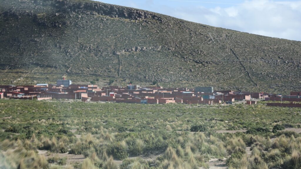 Wir machen uns auf den Weg nach Oruro. Wir bewegen uns die ganze Zeit zwischen 3600 und 3800 müM. Es sieht flach und grün aus. Sehr viele grosse Lama Herden bewegen sich auf der Ebene. Es sind auch Felder angelegt. Auf mehreren Hügeln sind mit Steinmauern Abteile errichtet worden. Es fällt uns auf, dass es hier keine Bretterhütten gibt. Alles aus Stein gebaut. Auch farbenfroh. Die Dächer sind vielfach rot oder blau und die Wände, wenn sie denn verputzt sind auch farbig bemalt.