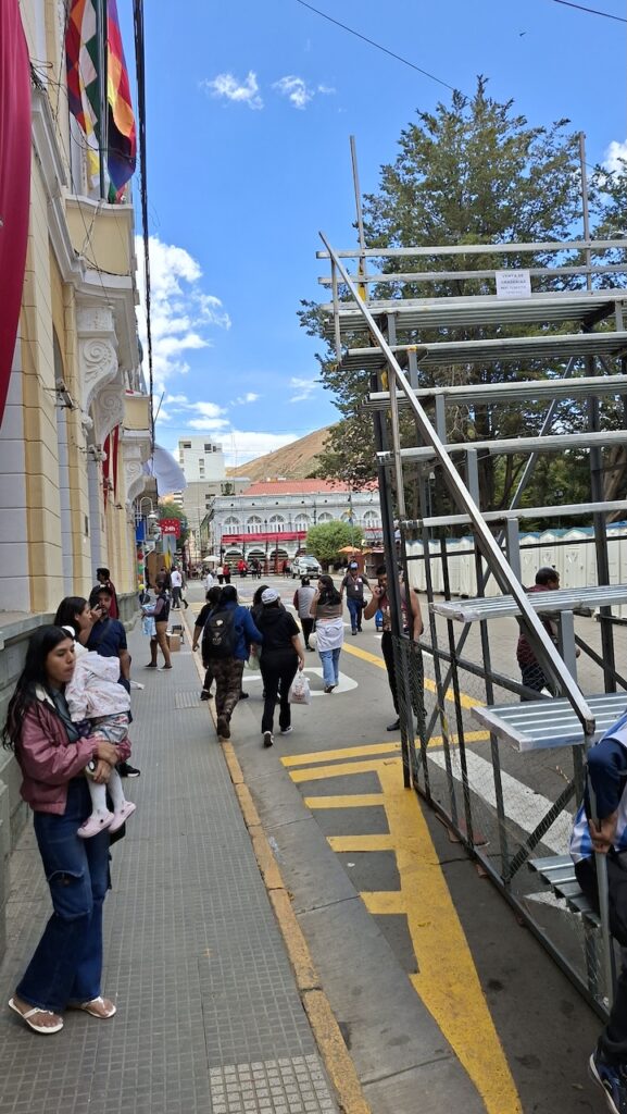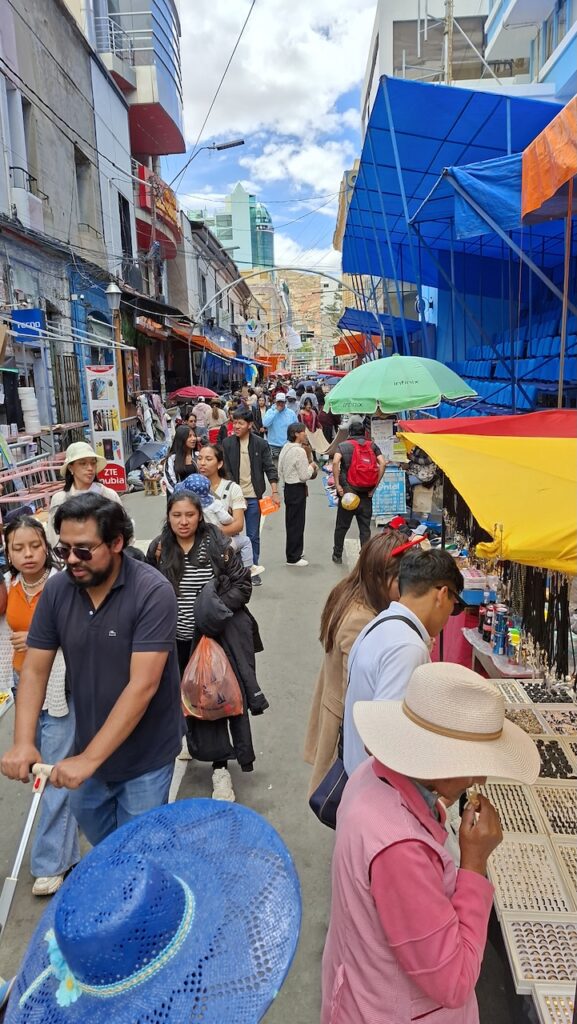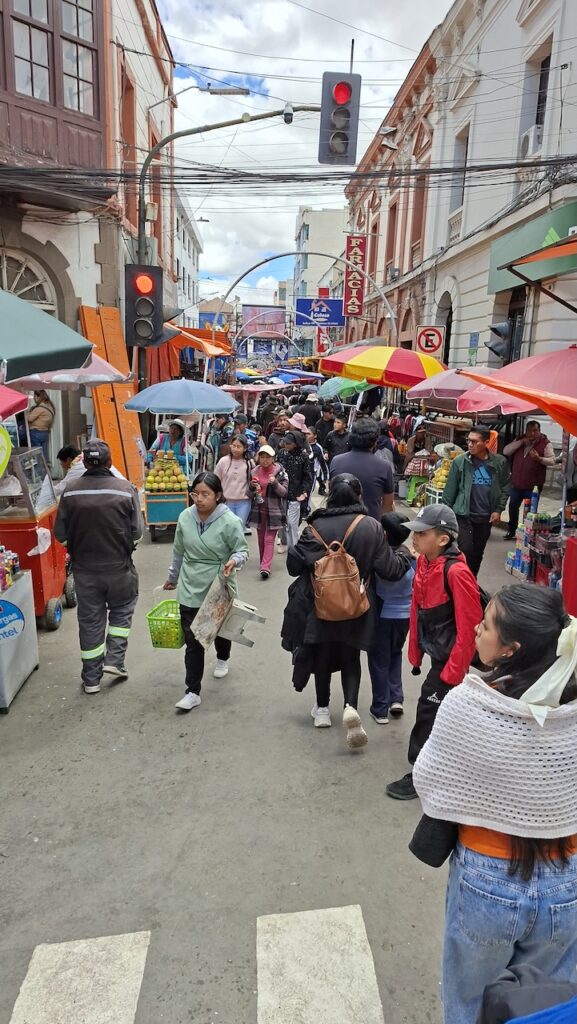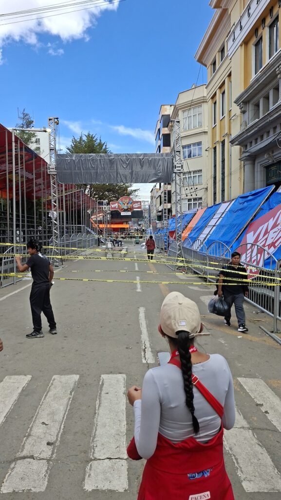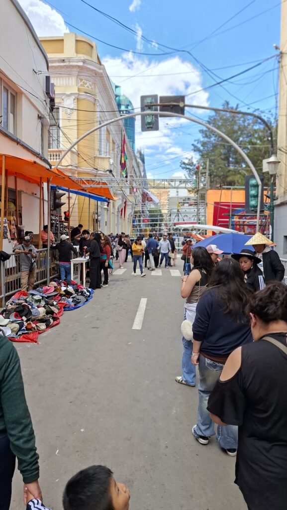 Oruro ist keine schöne Stadt. Früher wurde hier Silber abgebaut und danach Zinn. Es hat einen Mann superreich gemacht. Er hat die Arbeiter ausgebeutet und die Regierung als Geisel genommen. Sie waren auf sein Geld angewiesen und er holte das Militär, um Arbeiteraufstände niederzuschlagen. Wir sind zum falschen Zeitpunkt in der Stadt, denn sie ist zum Bersten voll. Dieses Wochenende ist Karneval in der Gegend und der in Oruro ist sehr berühmt.