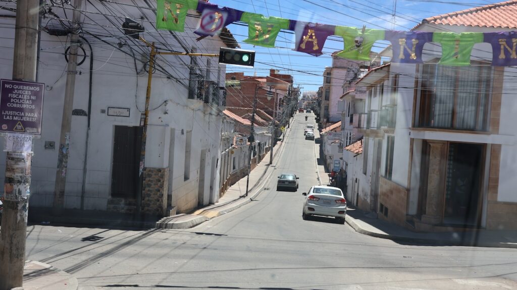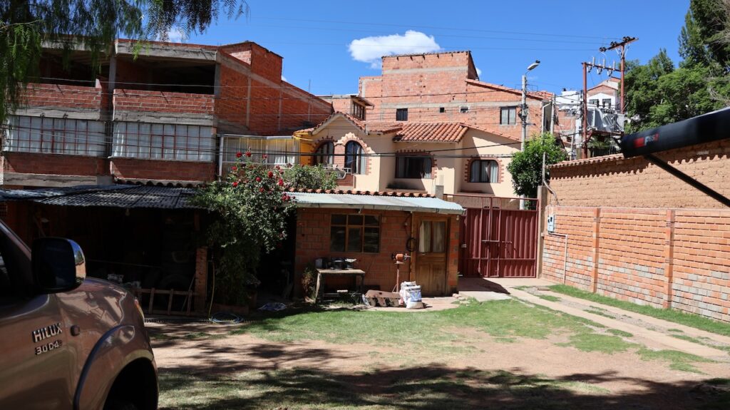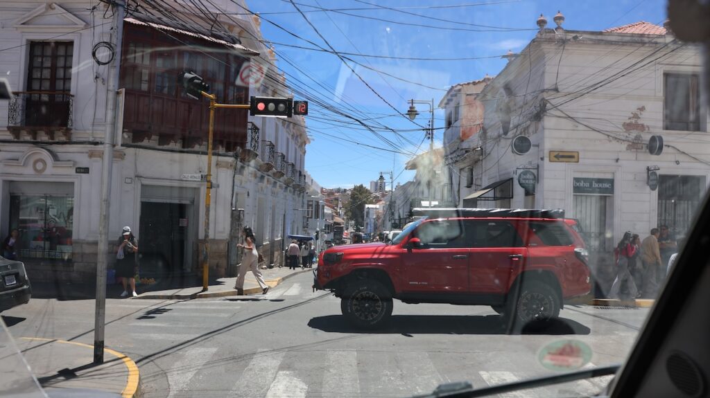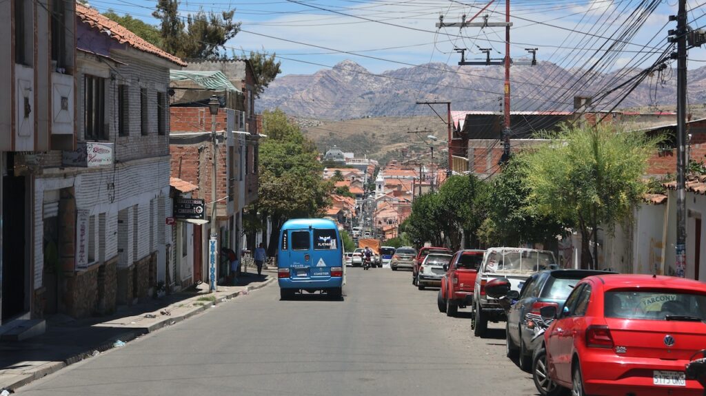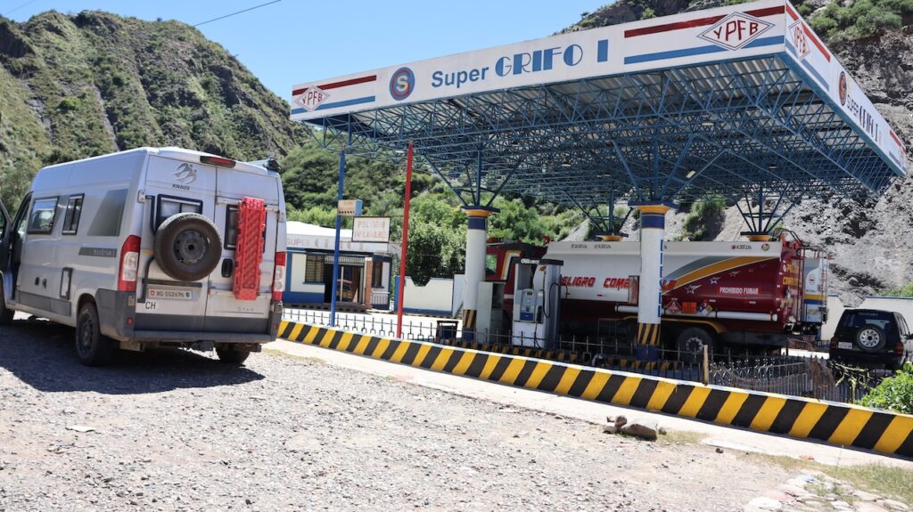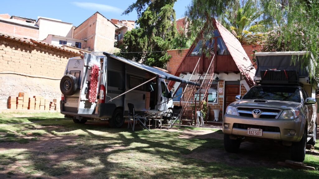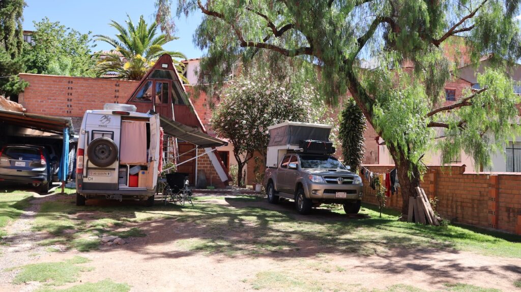 Wir erreichen Sucre gegen 12 Uhr. Manfred hat eine Adresse, wo man mitten in der Stadt privat campieren kann. Aber zuerst kommen wir nochmals an einer Tankstelle vorbei. Wir stellen uns in die Warteschlange ein. Ich sehe, dass bei der Dieselzapfsäule niemand steht. Ich laufe zum Mann, der an der Benzinzapfsäule bedient und frage ihn, ob er Diesel hat. Er nickt und zeigt hinüber. Ich winke Manfred, der zur Zapfsäule fährt. Eine Frau bedient ihn und will den Pass sehen und die Kennzeichennummer aufschreiben. Erst dann bekommen wir den Tank mit Diesel gefüllt. Wir müssen auch bar bezahlen. In Bolivien herrscht grosse Knappheit an Treibstoff. Das ist ein grosses Problem für alle Touranbieter für Touristen. Es kann sein, dass sie bis zu drei Tage auf Benzin warten müssen.