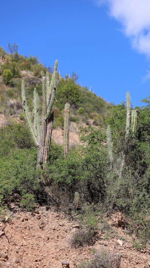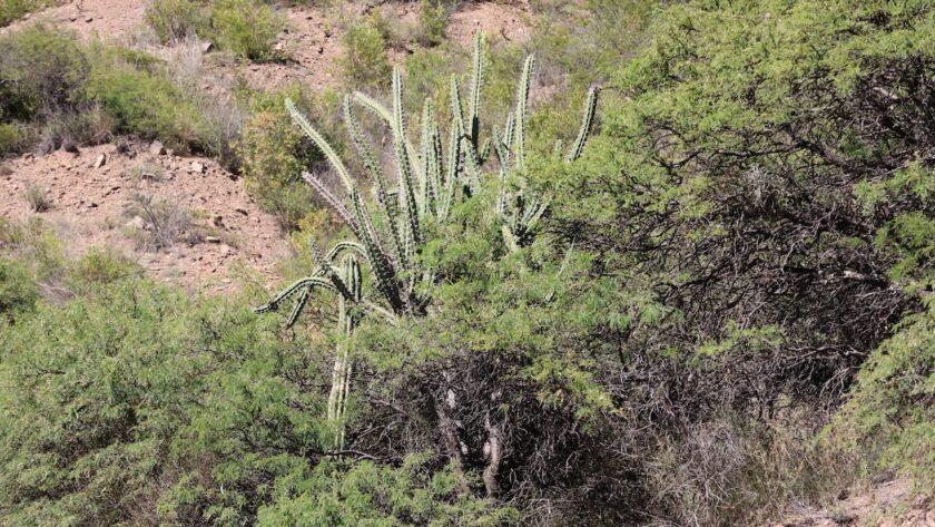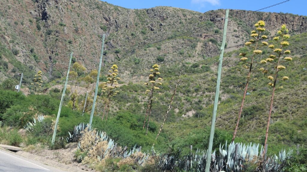 Die Hügel rings um uns glitzern in der Sonne und sind schwarz. Das Gestein sieht aus wie Schiefer. Es wachsen auch andere Kakteen an den Hängen. Die Agaven sind gerade am Blühen. Ich habe auch einige Opuntien gesichtet.