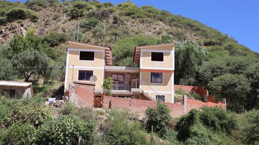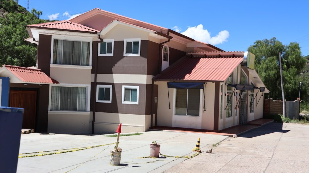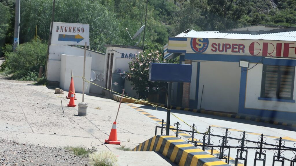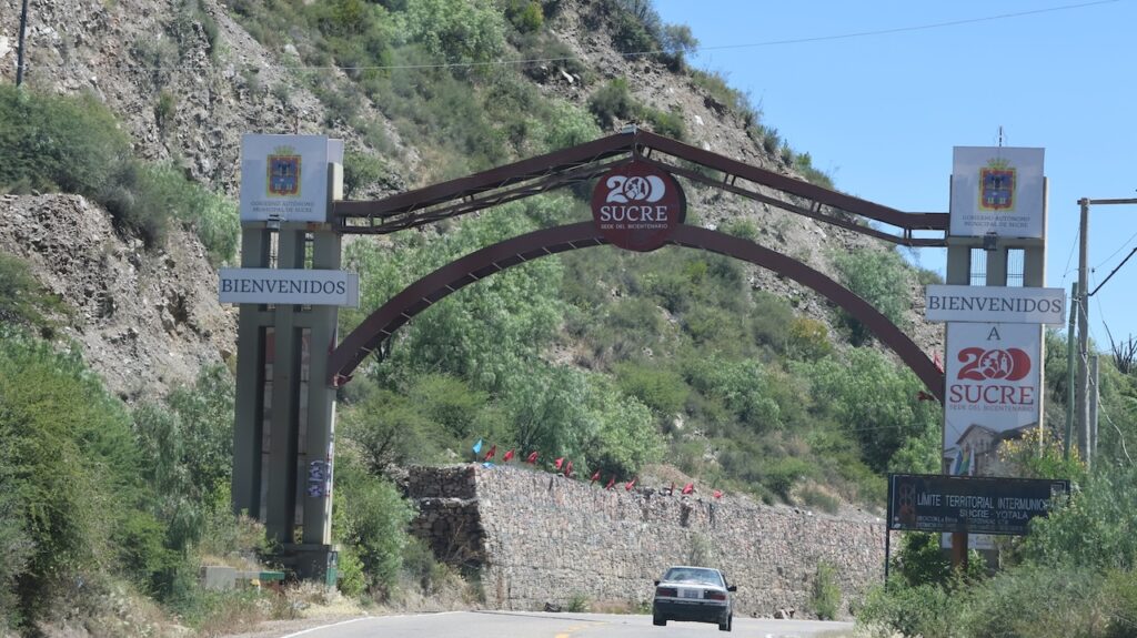 Kurz vor Sucre sehen wir eine Tankstelle. Sie ist aber geschlossen. Wir fahren auf den Parkplatz und schauen uns um. Ein Mann tritt aus dem Häuschen der Tankstelle und schaut zu uns hinüber. Dann verschwindet er wieder im Innern. Er kommt aber immer wieder heraus, solange wir dastehen. Ringsherum gibt es mal ordentlich verputzte Häuser mit Farbe an den Mauern