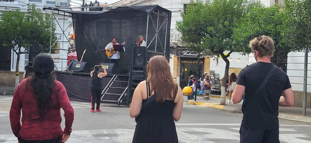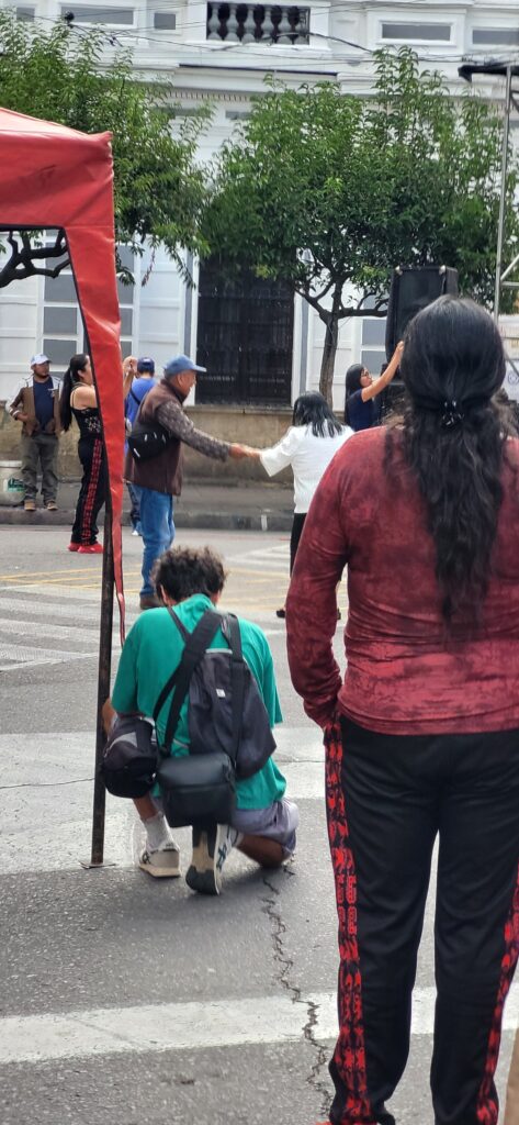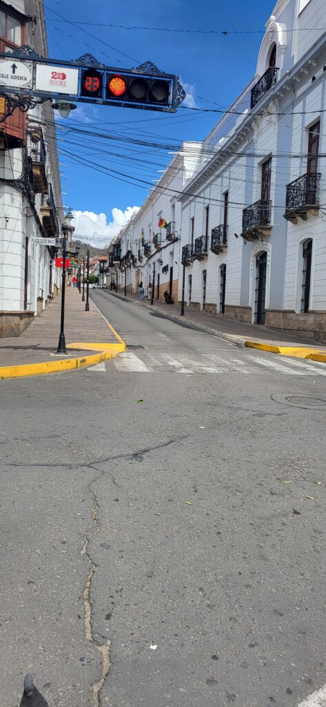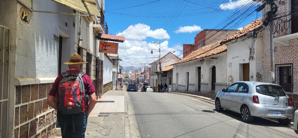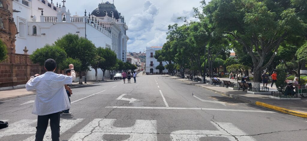 Nach dem Frühstück sind wir in die Stadt gelaufen. Wir wundern uns, dass kein Verkehr stattfindet. Wir sehen, dass der Hauptplatz total abgesperrt ist. Die Menschen hier in Sucre geniessen den Sonntag im Park. Wir geniessen ein Mittagessen im Restaurant. Das Menü besteht am Sonntag aus einem Buffet. Man kann so viel essen, wie man will. Wir staunen, wie gesittet das hier zu und her geht. Was man auf den Teller geschöpft hat, wird auch gegessen! Wenn die Gäste den Tisch verlassen, liegt nicht angebissenes Brot auf dem Tisch oder noch halbvolle Teller.