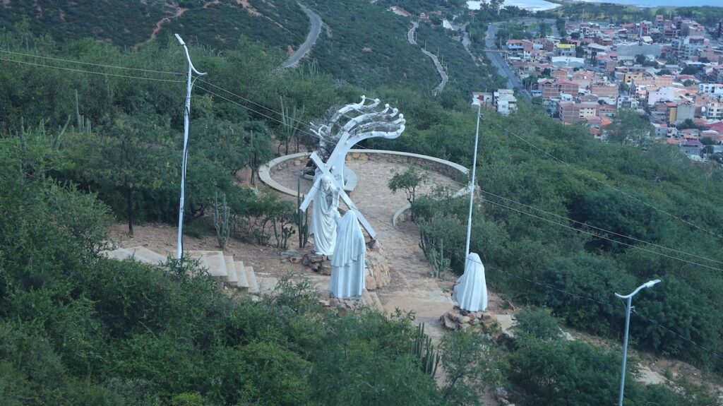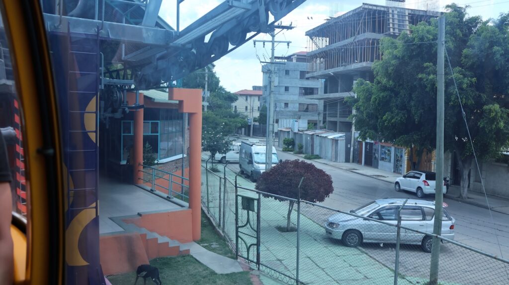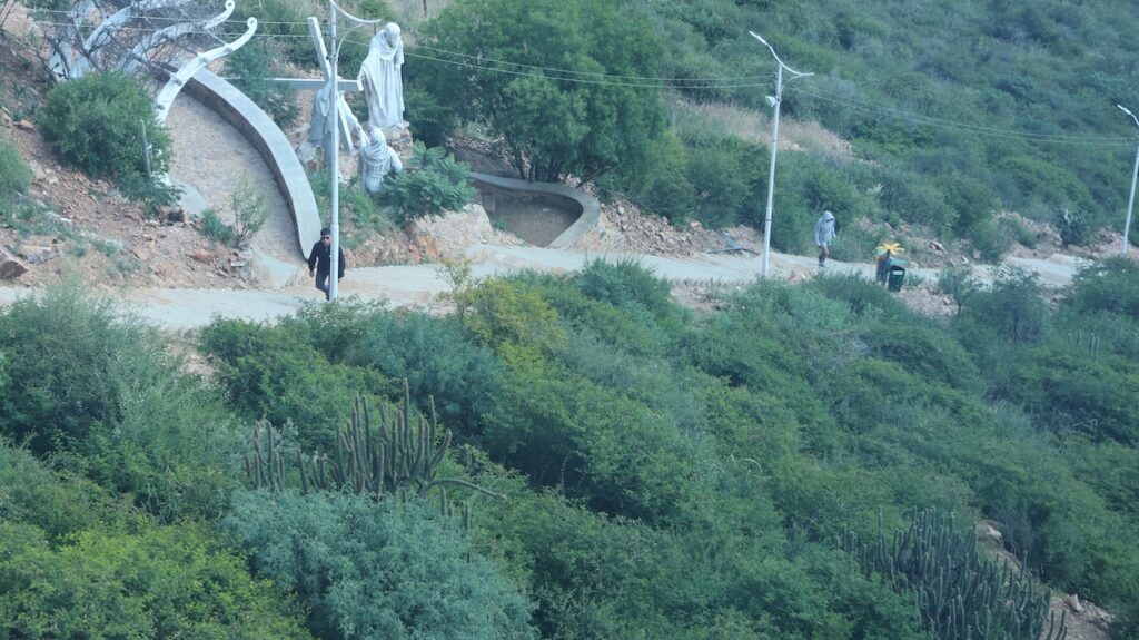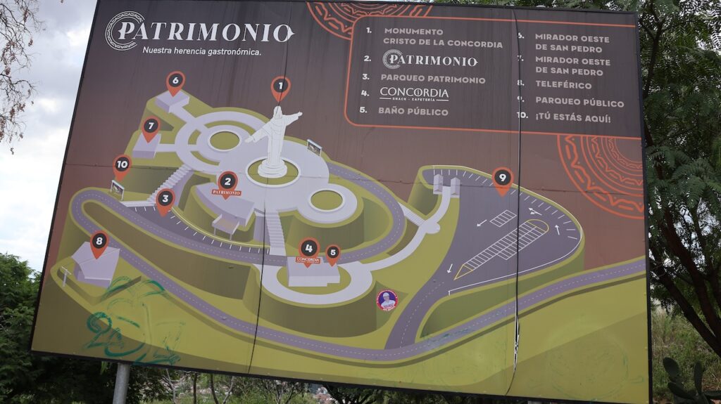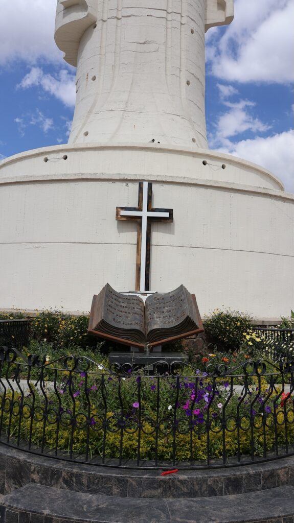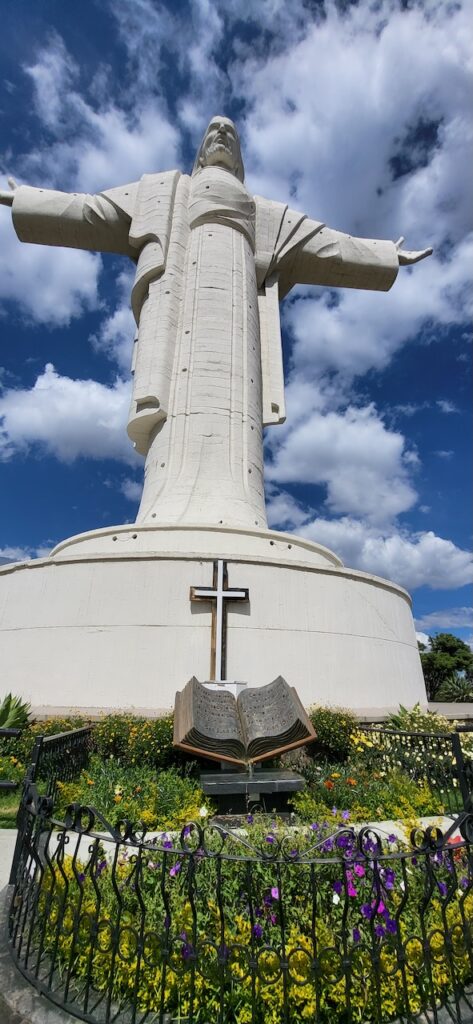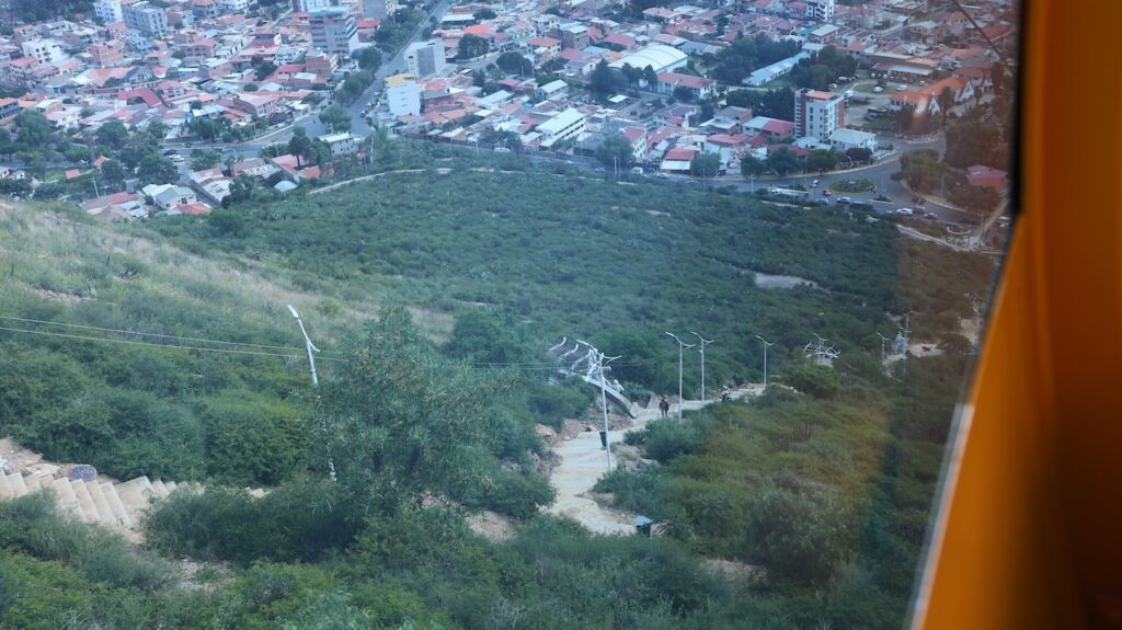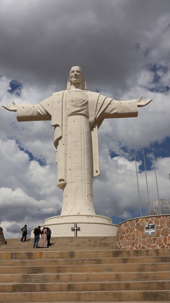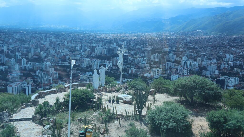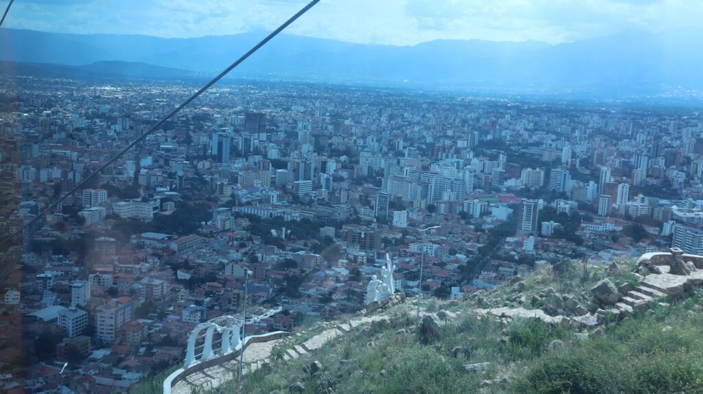 Nach dem Mittagessen sind wir mit der Gondelbahn zur Christusstatue gefahren. Sie ist der Statue in Rio nachempfunden. Die Statue ist 34.2 Meter hoch und der Sockel 6.24m. Sie ist damit 44cm höher als das Vorbild. Sie wurde 1994 fertiggestellt und wiegt 2200 Tonnen. Die Spannweite der Arme beträgt 32.87m. Früher konnte man bis zu den Armen hochsteigen und aus den Betonlöchern die Gegend bewundern. Heute ist alles aus Sicherheitsgründen abgesperrt. Trotzdem ist die Aussicht von den verschiedenen Plattformen phänomenal. Die Stadt dehnt sich riesig aus und ist die viertgrösste Boliviens. Man kann auch zu Christus hinauflaufen. Es sind 1399 Treppenstufen am steilen Hang zu bewältigen. Immer wieder stehen weisse Statuen, die den Leidensweg Christi darstellen, am Weg. Wahrscheinlich leidet auch die Person, die diese Stufen bewältigt. Wir haben etliche auf dem Leidensweg gesehen.