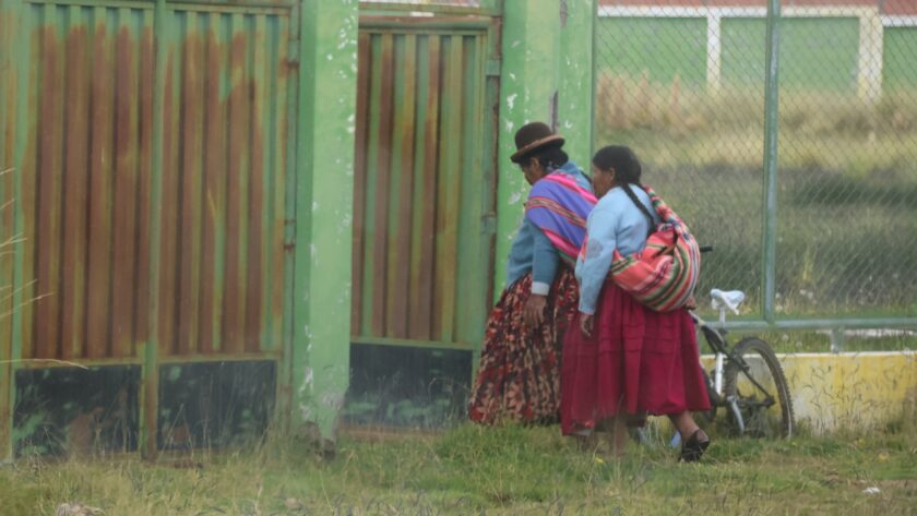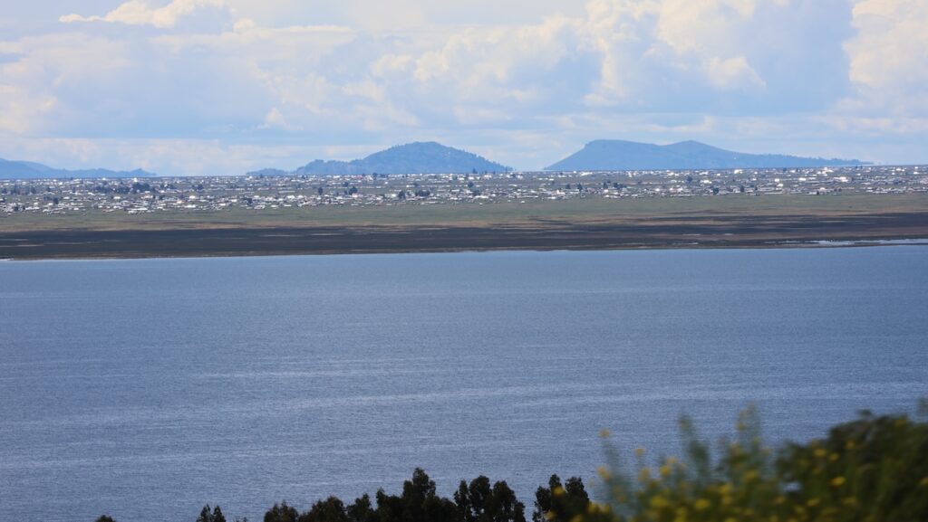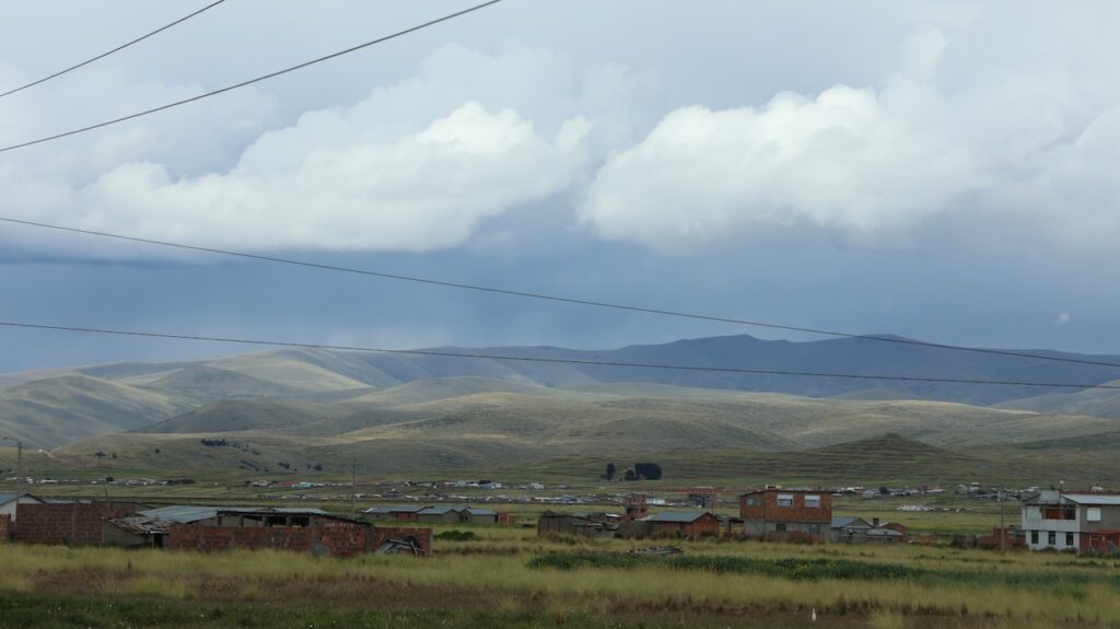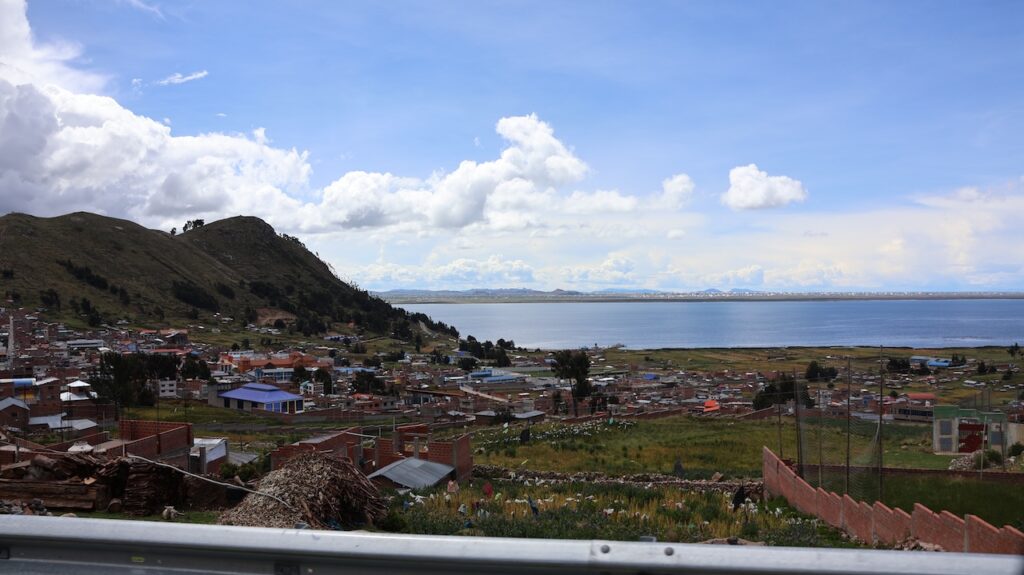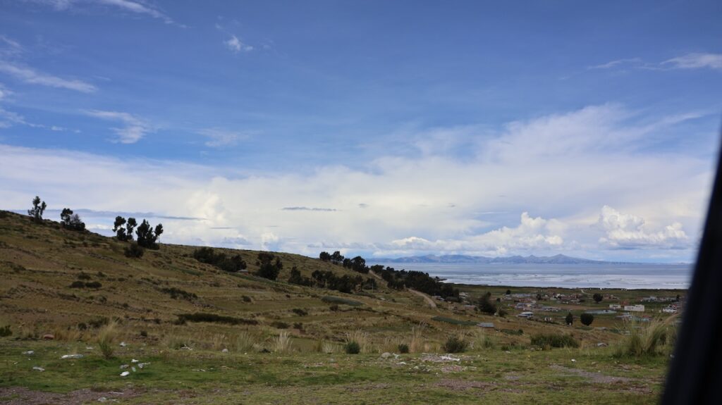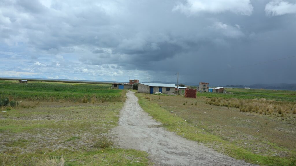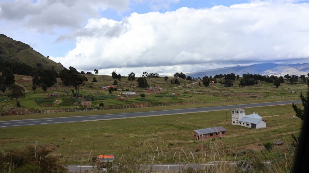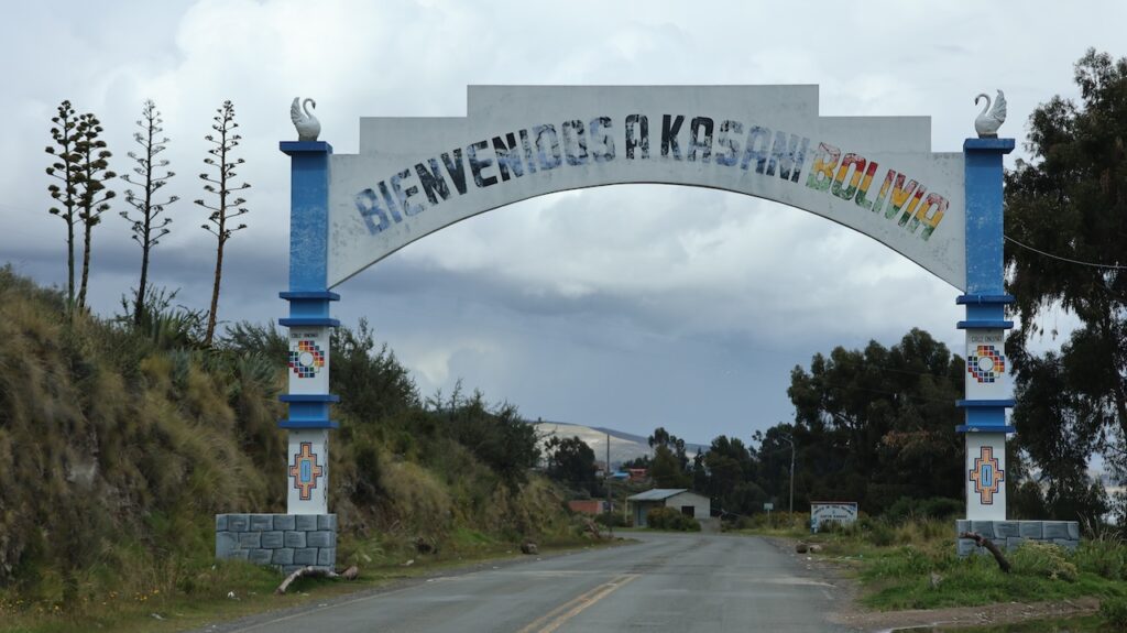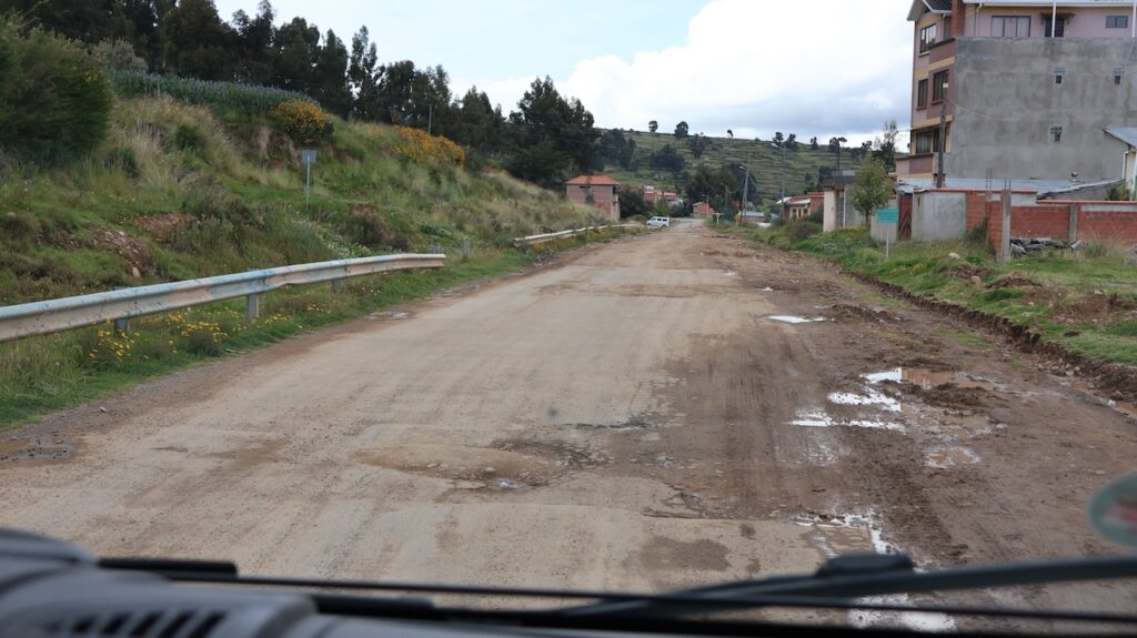 Wir kommen am kleinen Flughafen vorbei. Die Startbahn führt zum See. Die Strasse wird immer schlechter. Schon bald erreichen wir die Grenze. Die Strasse ist mit Fässern gesperrt. Ein Herr nimmt die Fässer weg und lässt und durchfahren. Dann stehen wir wieder vor einer Absperrung, die mit einem Schloss versehen ist. Wir erledigen die Formalitäten auf der bolivianischen Seite. Das geht sehr speditiv.