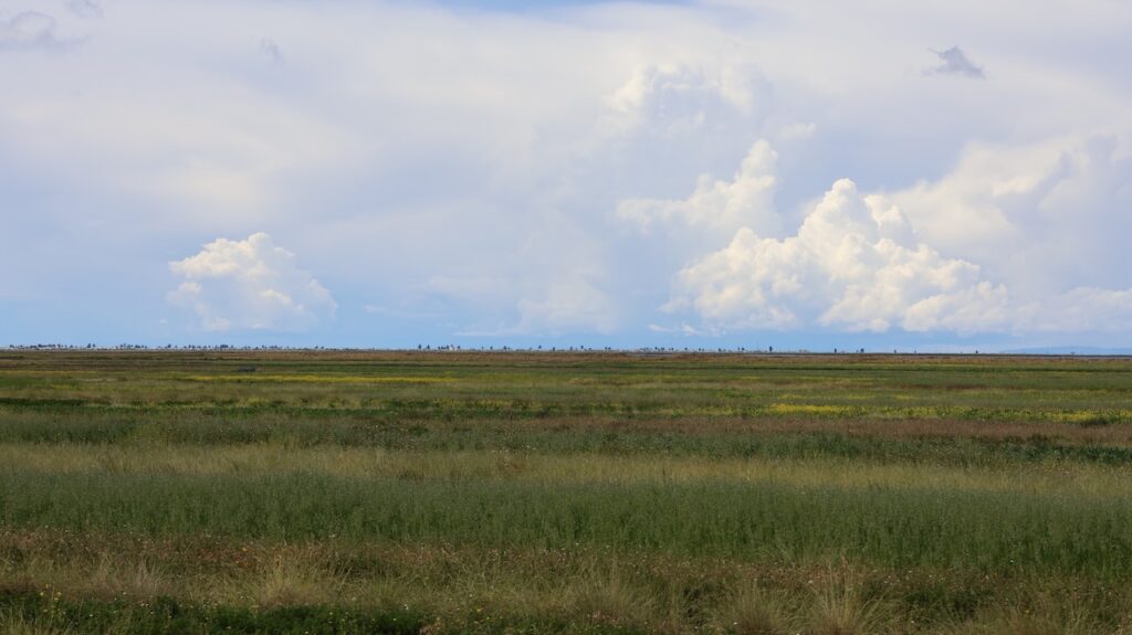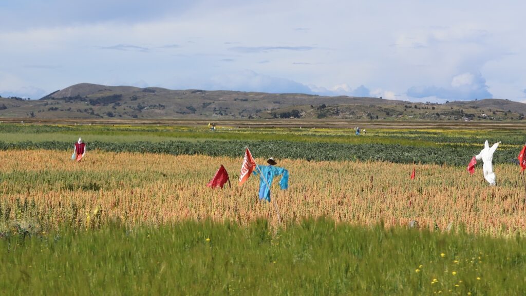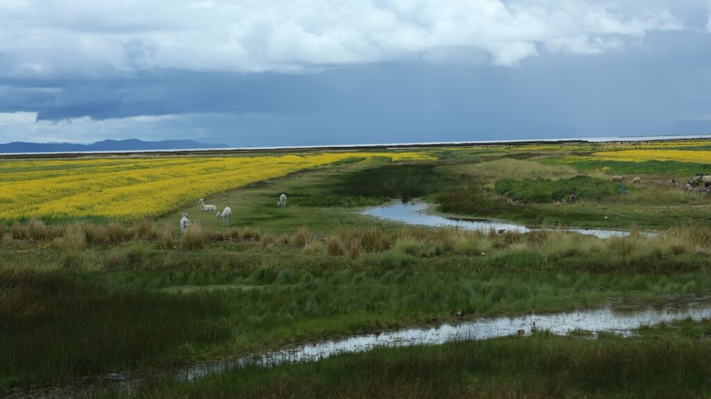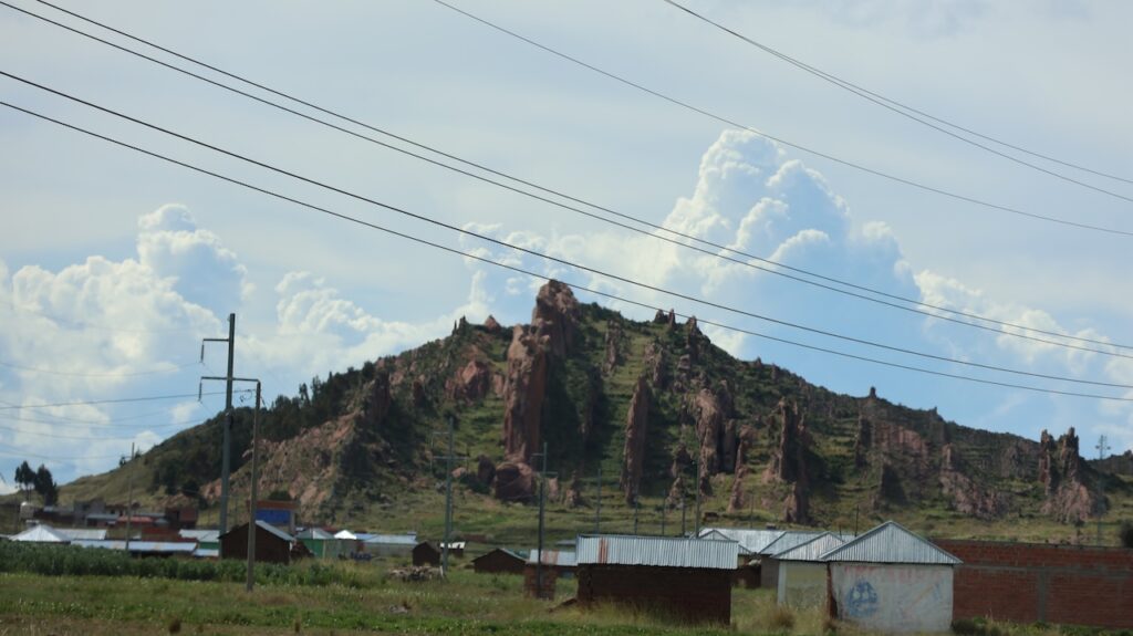 Die Weiterfahrt geht zuerst dem See entlang und danach ins Innere. Die Landschaft ist flach und mit vielen kleinen Feldern übersät. Zwischen den Bohnen und Kartoffeln stecken Vogelscheuchen. Manchmal tauchen bizarre Felsen auf.