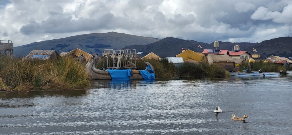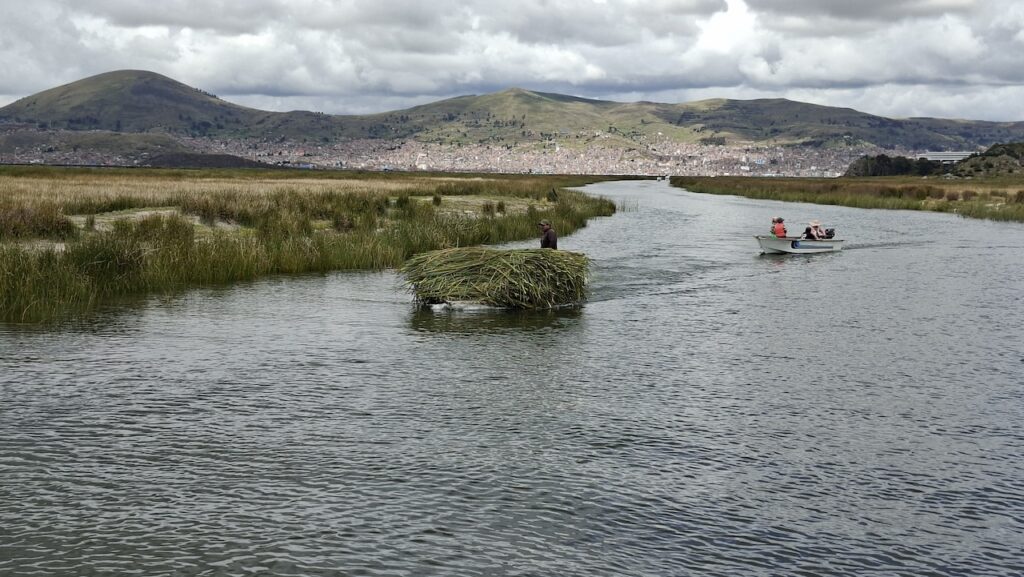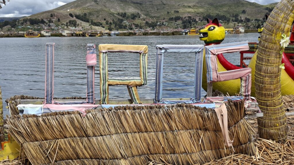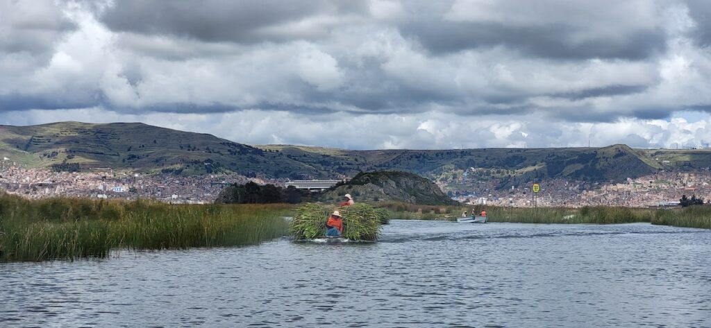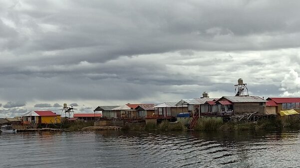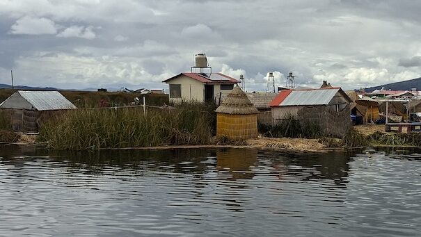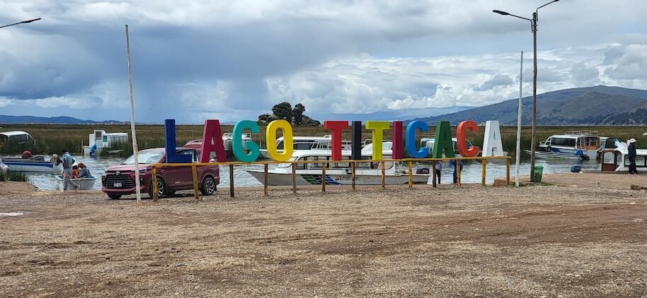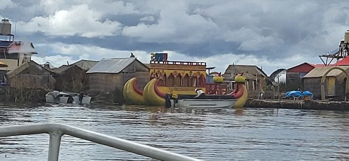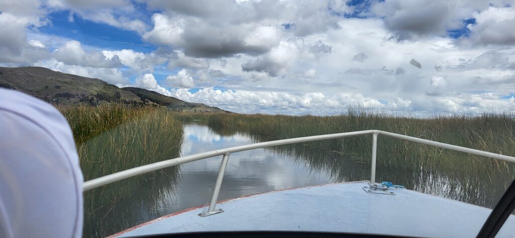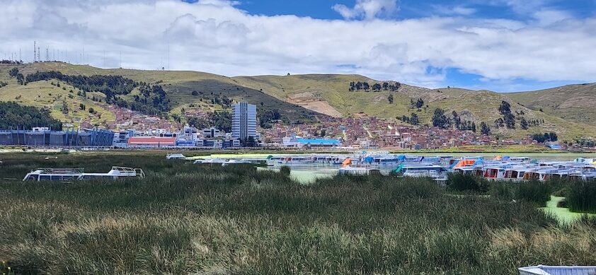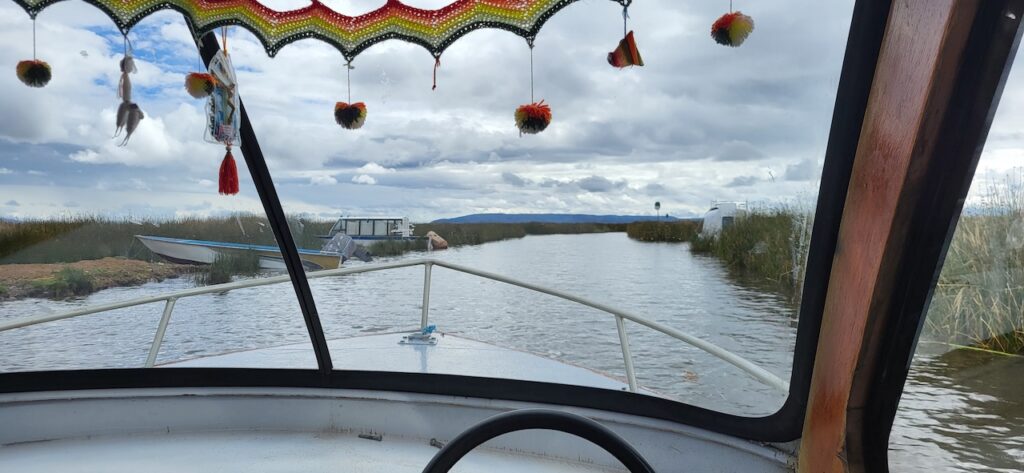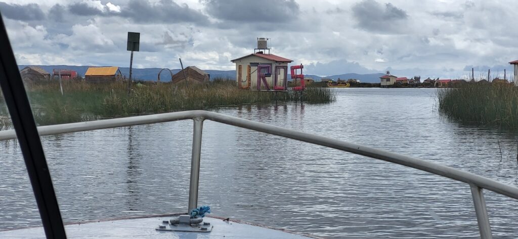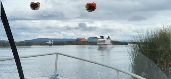 Wir haben auf dem Parkplatz gut geschlafen. Allerdings hat uns der Verkehr schon früh am Morgen geweckt. Um 9 Uhr fahren wir mit einem Boot zu den schwimmenden Inseln der Uros. Wenn man in Büchern nachschaut, oder im Internet, dann sahen diese Inseln vor ein paar Jahren noch ganz anders aus. Die Häuser waren noch wie die Boote aus Totora Schilf gebaut. Heute stehen da Wellblechhütten notdürftig mit Schilfmatten umhüllt. Auch die Fischerboote sind heute keine Schilfboote mehr, sondern aus Holz. Jede Gemeinschaft hat einen sogenannten Mercedes. Das ist ein Boot aus Glasfaser, das den Schilfbooten nachgeahmt ist und gelb angestrichen. Mit dem wollen die Familien einen Ausflug mit den Touristen machen, um Geld zu verdienen.
