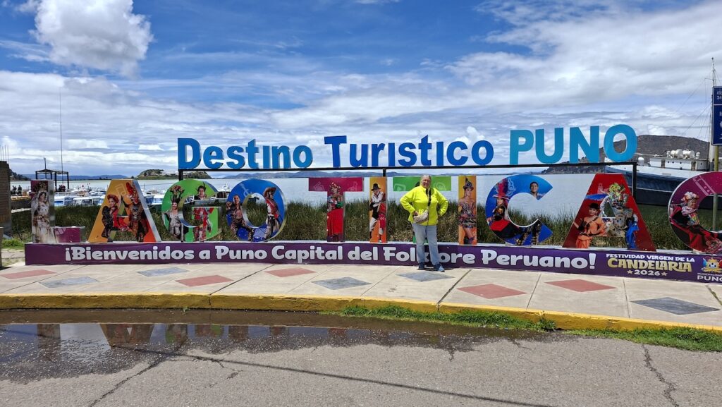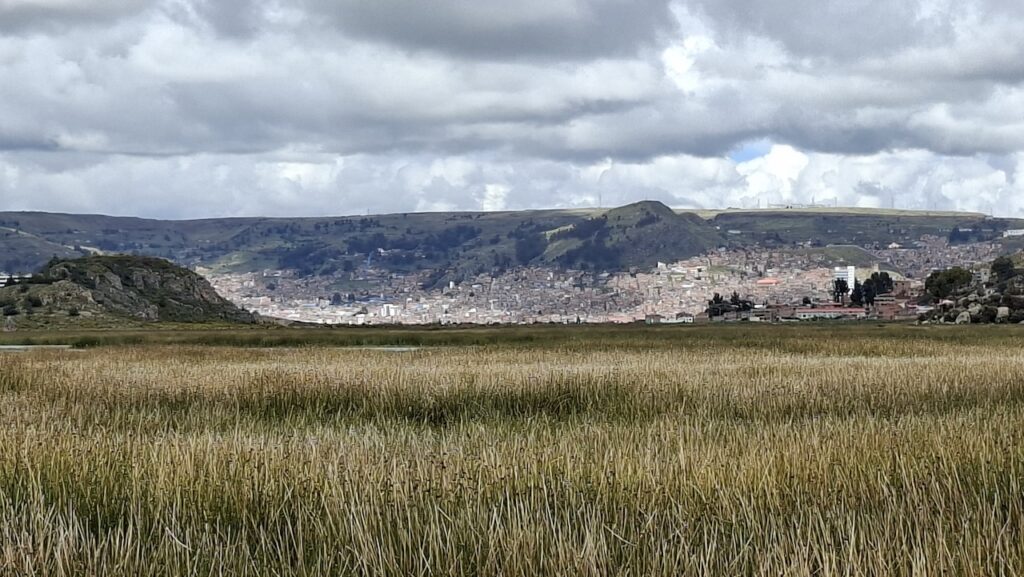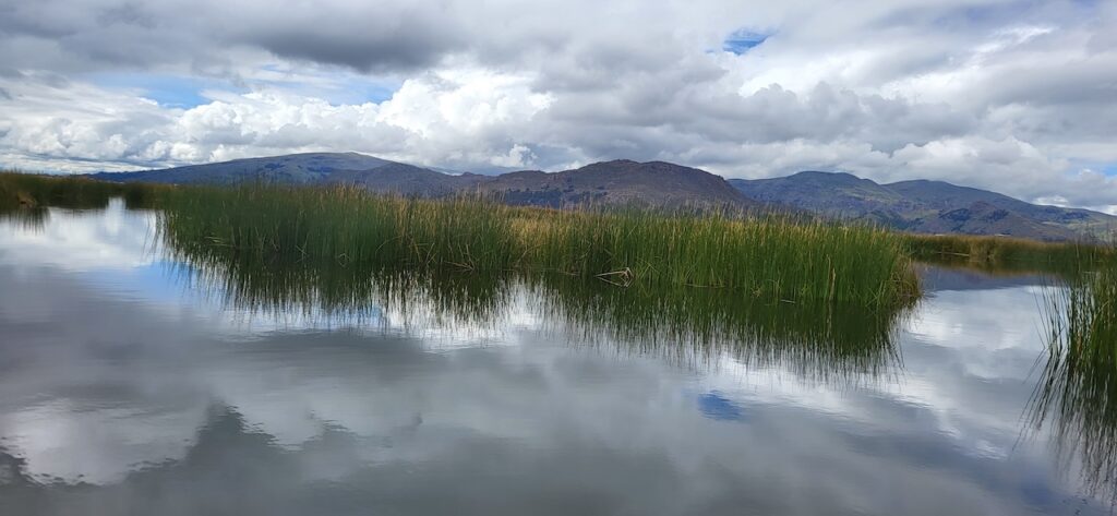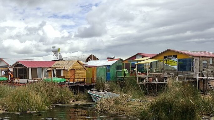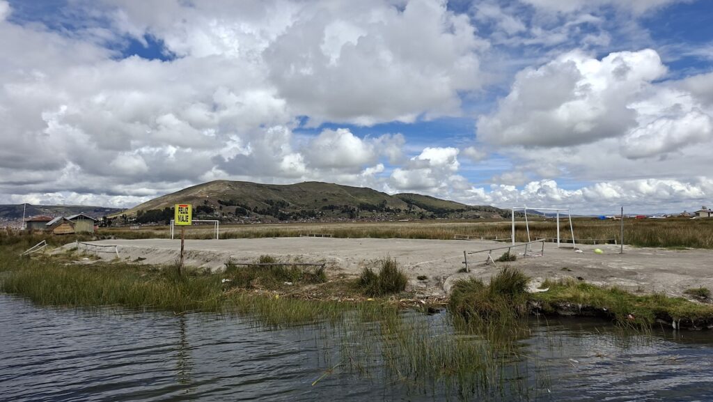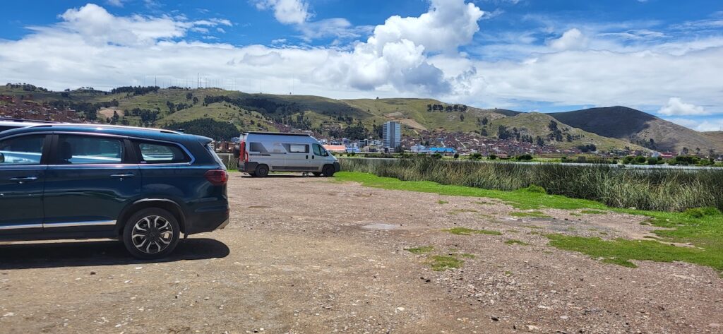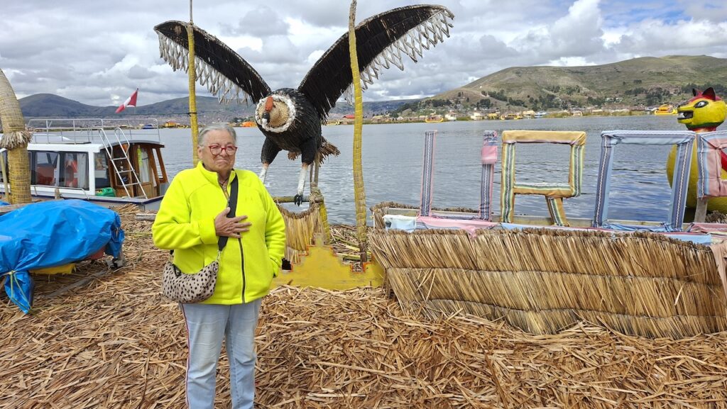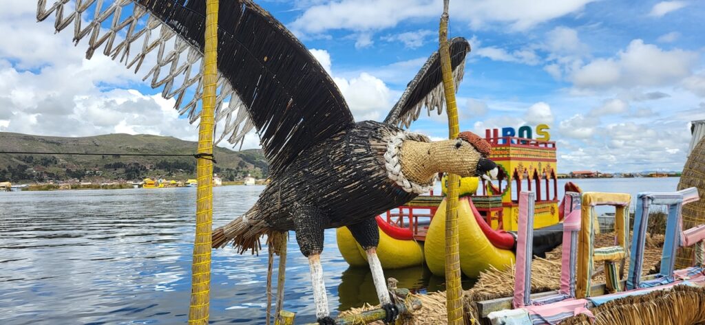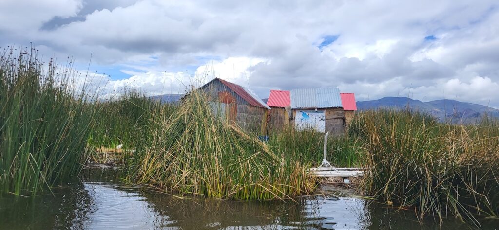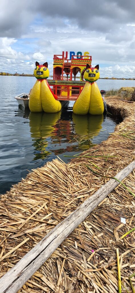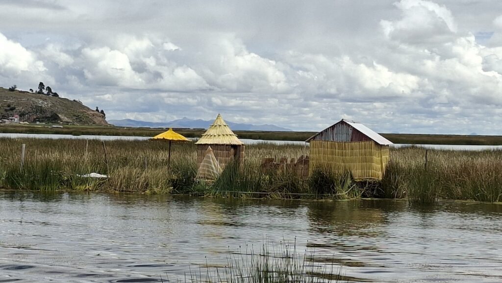 Wir haben auf dem Parkplatz gut geschlafen. Allerdings hat uns der Verkehr schon früh am Morgen geweckt. Um 9 Uhr fahren wir mit einem Boot zu den schwimmenden Inseln der Uros. Wenn man in Büchern nachschaut, oder im Internet, dann sahen diese Inseln vor ein paar Jahren noch ganz anders aus. Die Häuser waren noch wie die Boote aus Totora Schilf gebaut. Heute stehen da Wellblechhütten notdürftig mit Schilfmatten umhüllt. Auch die Fischerboote sind heute keine Schilfboote mehr, sondern aus Holz. Jede Gemeinschaft hat einen sogenannten Mercedes. Das ist ein Boot aus Glasfaser, das den Schilfbooten nachgeahmt ist und gelb angestrichen. Mit dem wollen die Familien einen Ausflug mit den Touristen machen, um Geld zu verdienen.