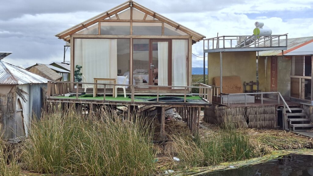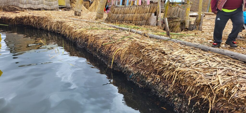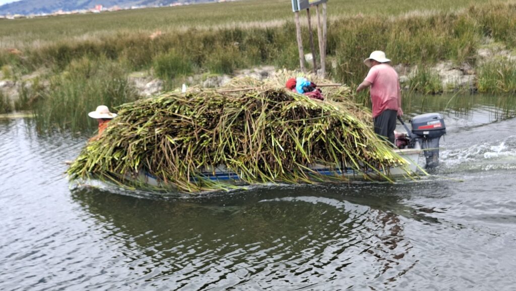 Auf der zweiten Insel geht es auch vor allem um das Verkaufen. Die Inseln sind hier alle hintereinander zusammengezurrt. Sie stehen in einem Halbkreis, wie ein Dorf. Nirgends sieht man noch ein Schilfhaus, höchstens zu Anschauungszwecken. Neben der zweiten Insel stehen zwei Hotelzimmer auf Holzpfählen. Man kann also auch als Tourist dort übernachten. Ich habe mir das Ganze anders vorgestellt. Wir fahren wieder in den Hafen und begegnen Booten, die mit einer Ladung Schilf zurückkommen.