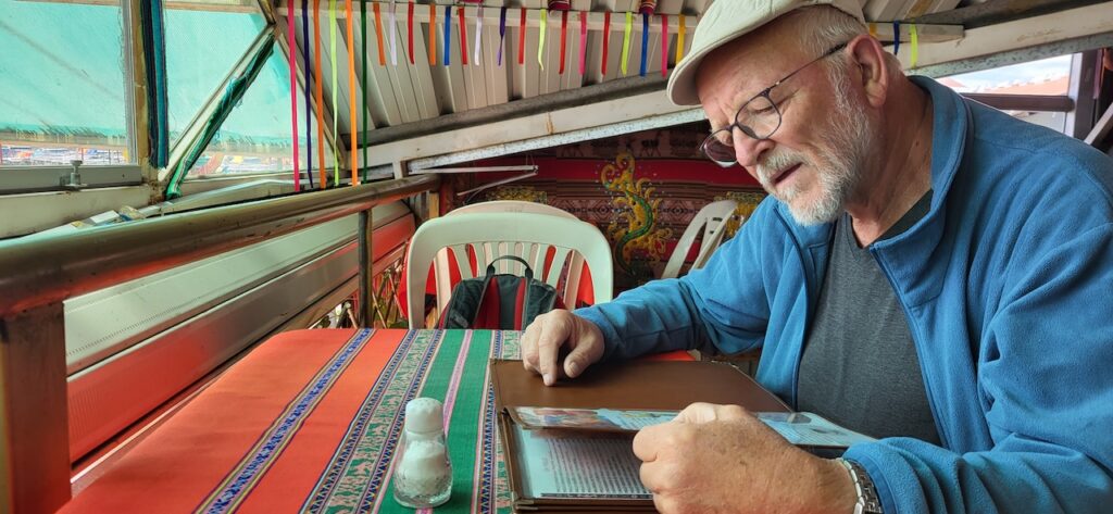 Am Wasser essen wir unser Mittagsessen. Es ist immer harte Arbeit, das Essen auszusuchen. Mein Magen verträgt hier nicht mehr alles, vor allem widersteht ihm das Frittierte. Zum ersten Mal steht auf der Menukarte Meerschwein. Auf das habe ich bestimmt keine Lust. Wir entscheiden uns für Lamm, das sich als Schaf herausstellt. Es war aber trotzdem gut.