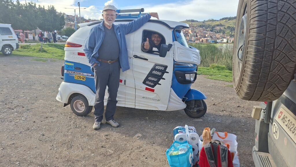 Am Nachmittag können wir endlich peruanisches Geld holen. In der Altstadt gibt es ein grosses Einkaufszentrum, wo wir mal wieder so richtig unsere Nahrungsmittel aufstocken können. Ein Kleintaxi fährt unseren Einkauf und uns direkt zum Camper. Der Taxifahrer hat richtig den Plausch an den Touris aus Übersee.