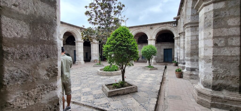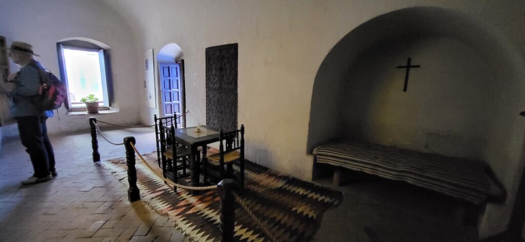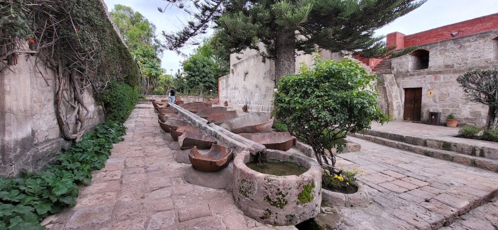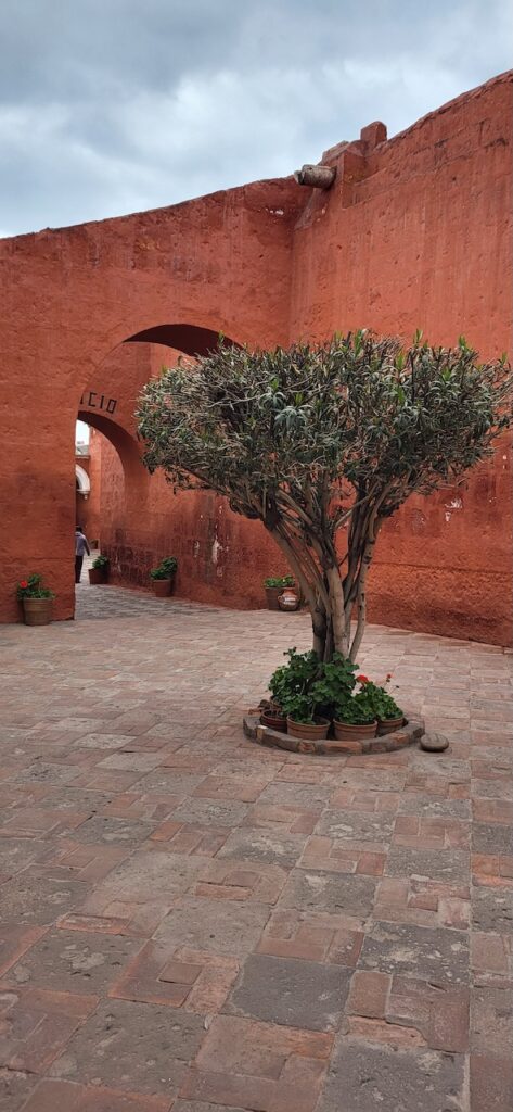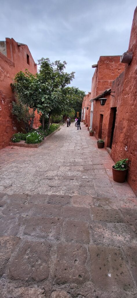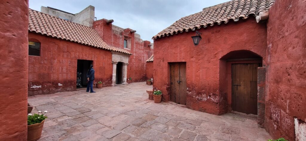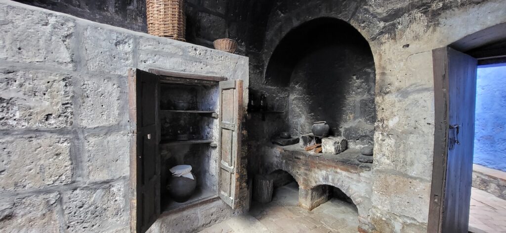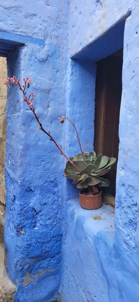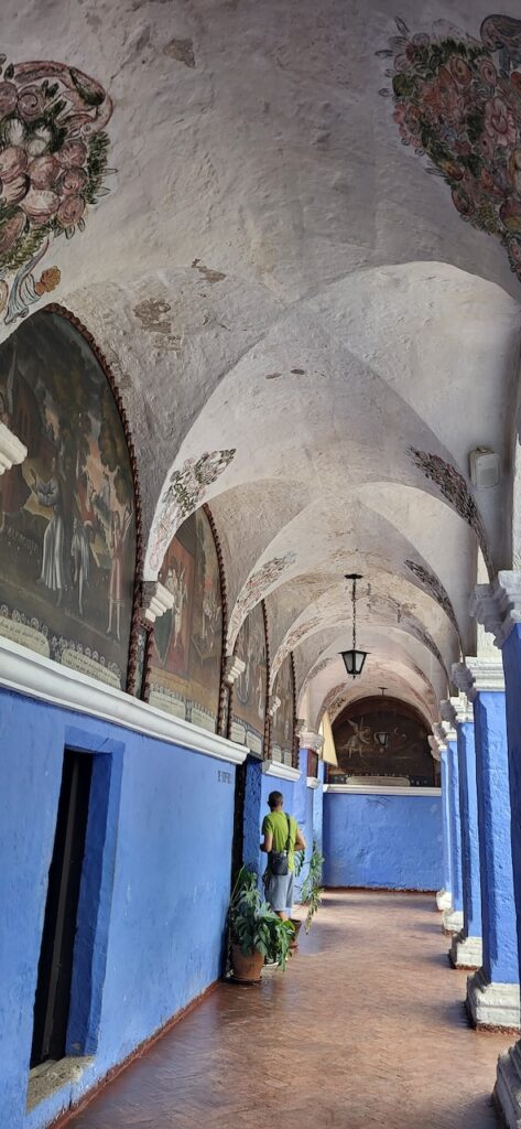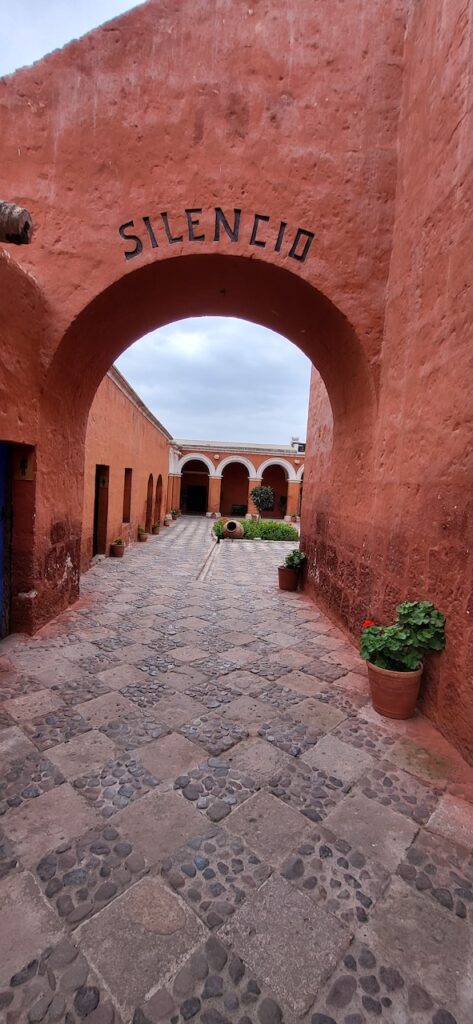 Wir suchen uns ein Restaurant und versuchen das Fleisch von Alpaka. Es ist sehr zart. Danach machen wir einen Verdauungsspaziergang zum Kloster Santa Catalina aus dem 16. Jhd. 350 Jahre war das Kloster geschlossen, bevor es wieder für die Öffentlichkeit zugänglich gemacht wurde. Es ist beeindruckend! Die Nonnen lebten nicht wie bei uns in kleinen Zellen, sondern in Wohnungen oder Häuschen. Sie beinhalteten ein Zimmer mit Bettnische und einem Altar auf der anderen Seite des Bettes, ein Wohn/Esszimmer und eine Kochstelle im eigenen Aussenbereich. Meist waren hier Mädchen von reichen Leuten zur Erziehung untergebracht. Das generierte natürlich Geld für das Kloster. Dazu waren die Nonnen berühmt für ihr Brot und süsses Gebäck. Man kann die verschiedenen Wohnungen ansehen. Auch die Innenhöfe, die Backstube, diverse Gebetsräume und eine Art Museum. Es ist sehr weitläufig.