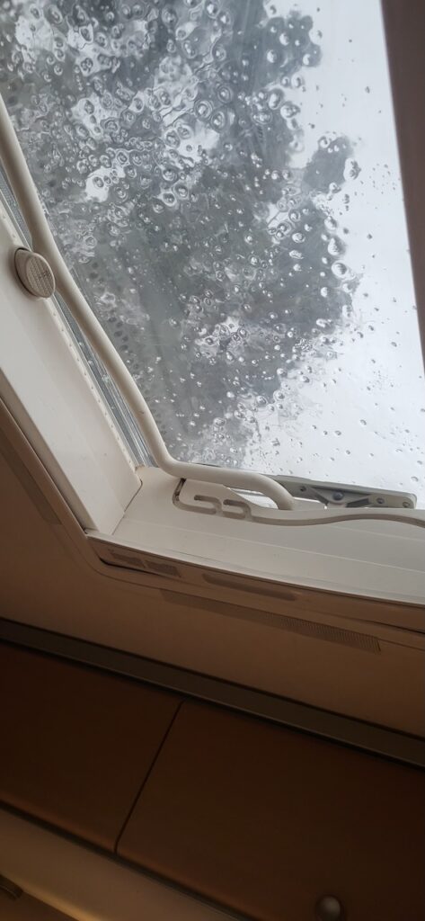 Am Nachmittag zieht ein Gewitter nach dem anderen über uns hinweg. Der koreanische Nachbar bekommt eine neue Windschutzscheibe. Auf einem Campingplatz ist ein Ast darauf gefallen und hat die Scheibe kaputt gemacht.