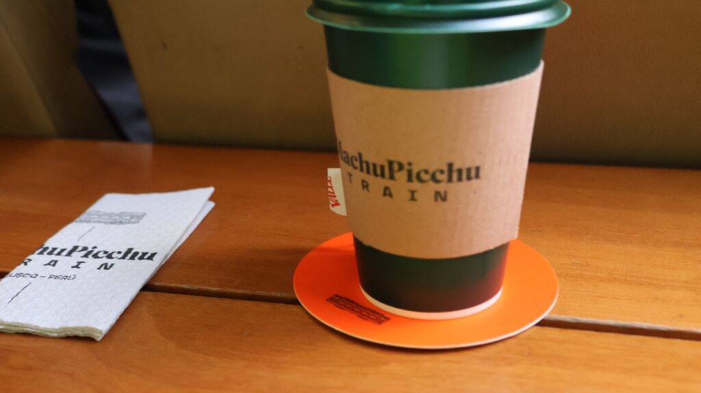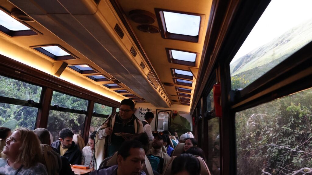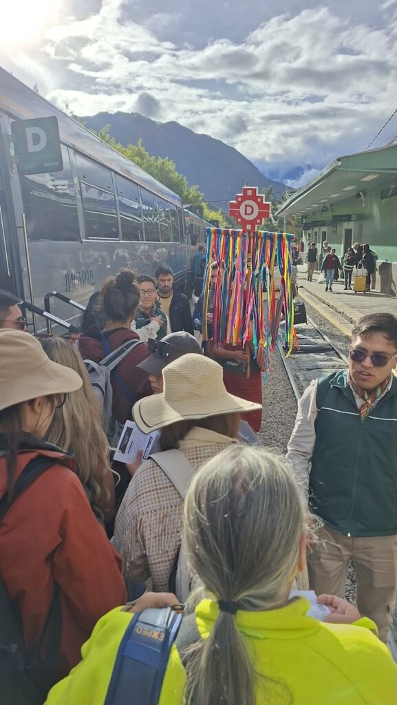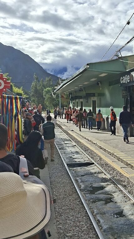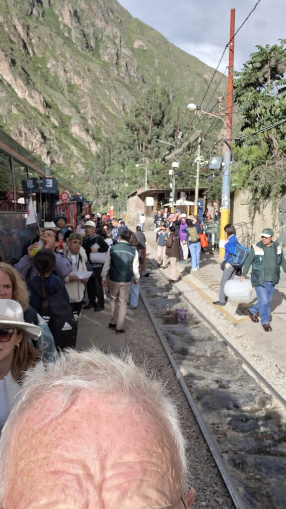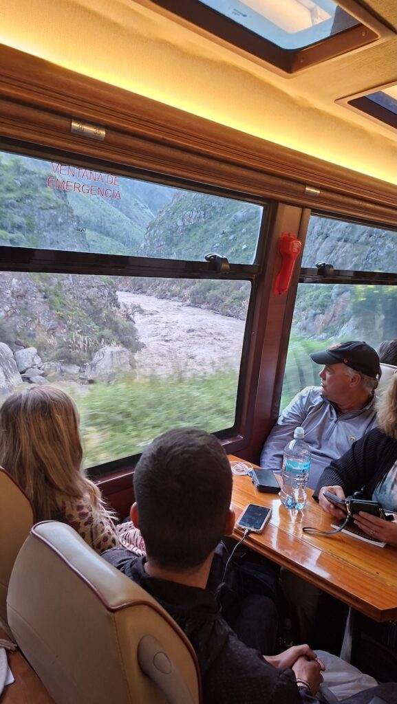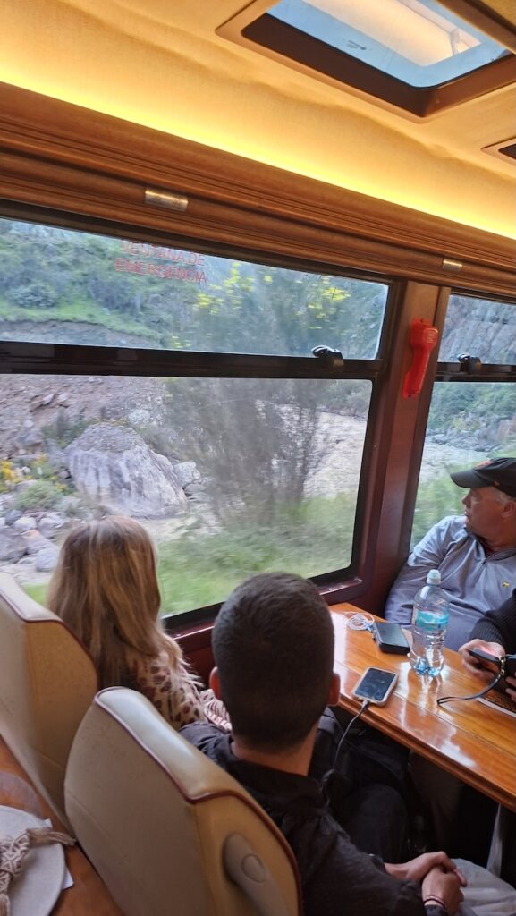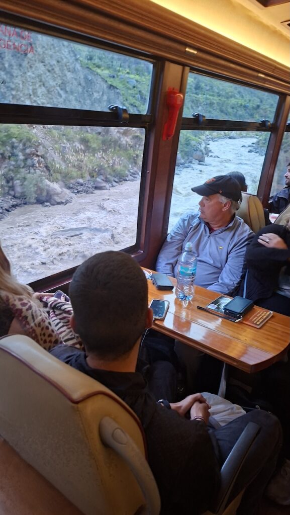 In Ollantaytambo fahren wir zwei Mal am Parkplatz beim Bahnhof vorbei. Es ist aber auch gar nichts angeschrieben und die Strassen sind eng. Beim Bahnhof muss man zuerst das Ticket nach Machu Picchu Dorf oder wie angeschrieben, Agua Caliente lösen, bevor man auf den Parkplatz fahren kann. Wir bekommen noch ein Ticket für den Zug um 16:36 Uhr. Bereitstehen muss man schon eine halbe Stunde zuvor. Mit viel Trara werden wir zum Zug begleitet. Dort sind die Passagiere von Machu Picchu gerade am Aussteigen. Alles ist durchorganisiert. Der Zug fährt pünktlich ab. Er wackelt von einer Seite zur anderen und ich komme mir vor wie auf einem Schiff bei Sturm. Manfred findet es gefährlich, wie die Geleise so nah am reissenden Fluss entlangführen. Ich «nuggele» an meinem Inka Tee und hoffe, dass ich nicht seekrank werde. Bald wird es dunkel. In jedem Bahnhof müssen wir lange auf einen bis zwei Gegenzüge warten. Darum dauert die Fahrt viel länger als vorgesehen. Wir sind 2Stunden und 15 Minuten unterwegs.