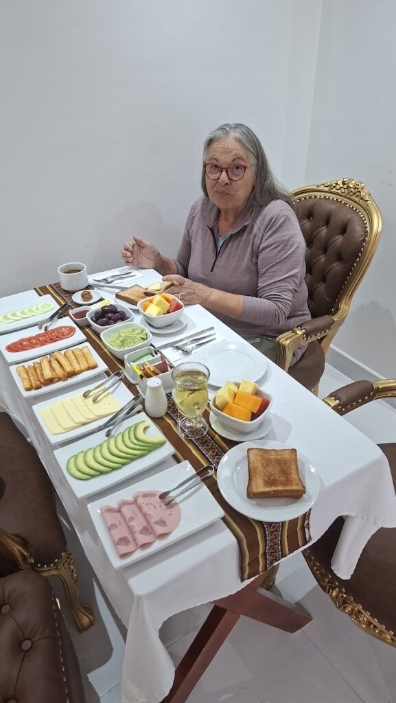 6 Uhr aufstehen, 7 Uhr Frühstück. Der Chef hat uns ein grandioses Frühstück zubereitet. Wir können auch noch Eier und Cereals haben. Aber was da auf dem Tisch steht genügt vollkommen. Der Chef Santiago bietet uns an bis 14 Uhr im Zimmer zu bleiben. Wir können so nach der Besichtigung noch ein Nickerchen machen, meint er.