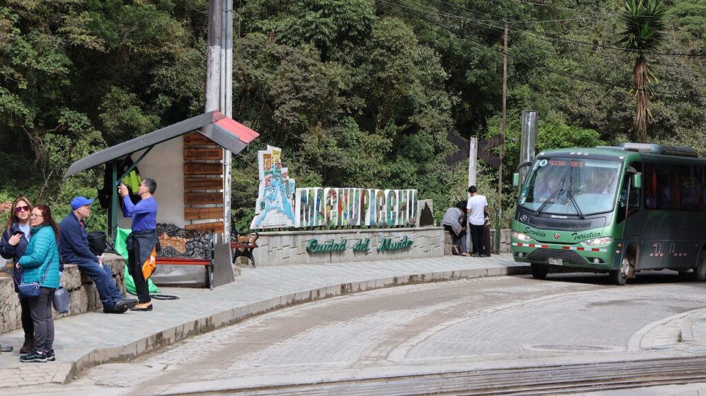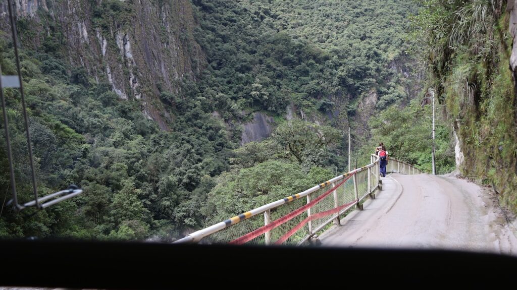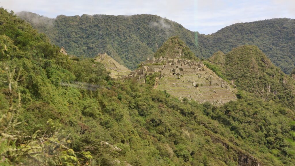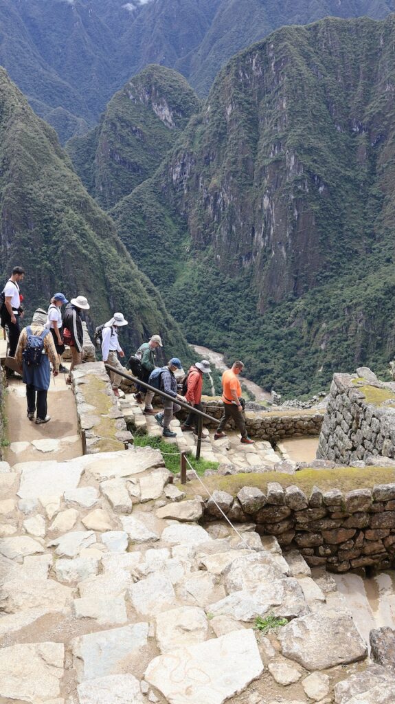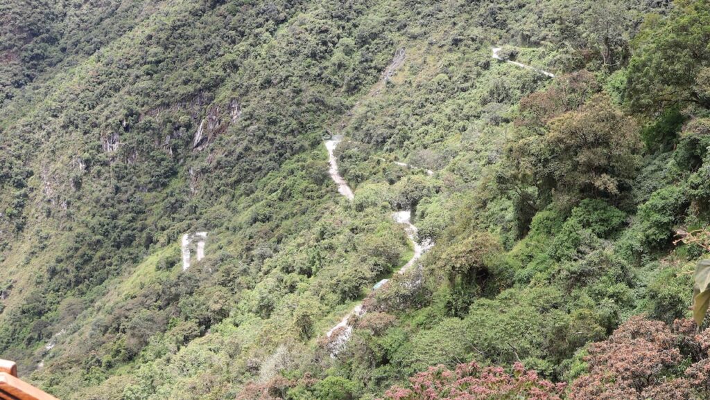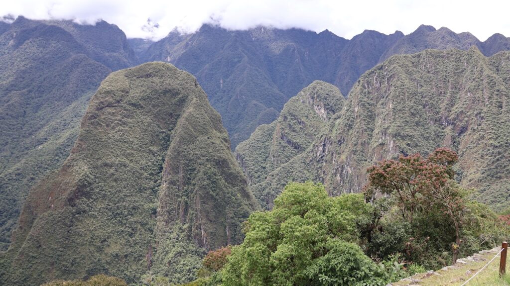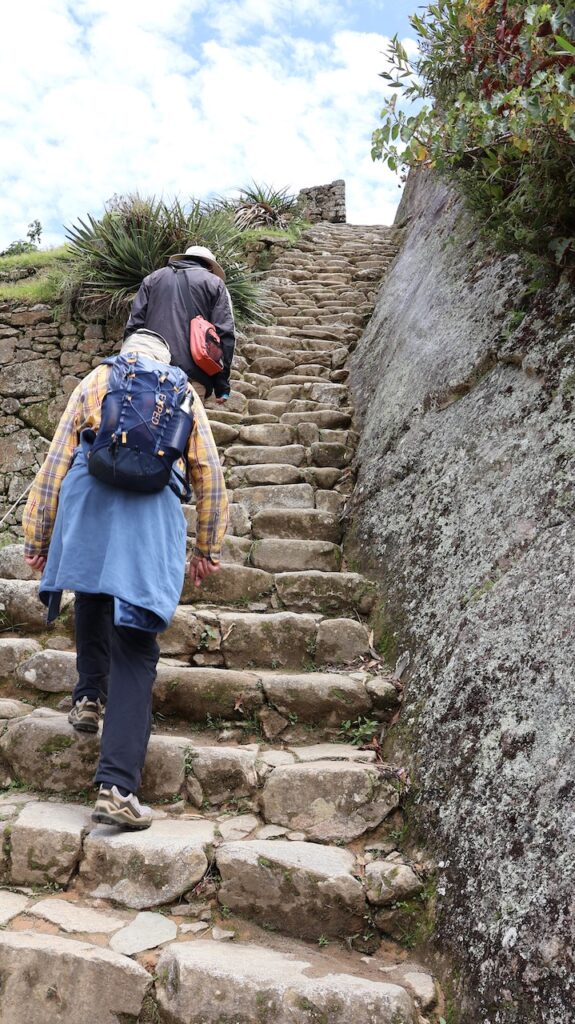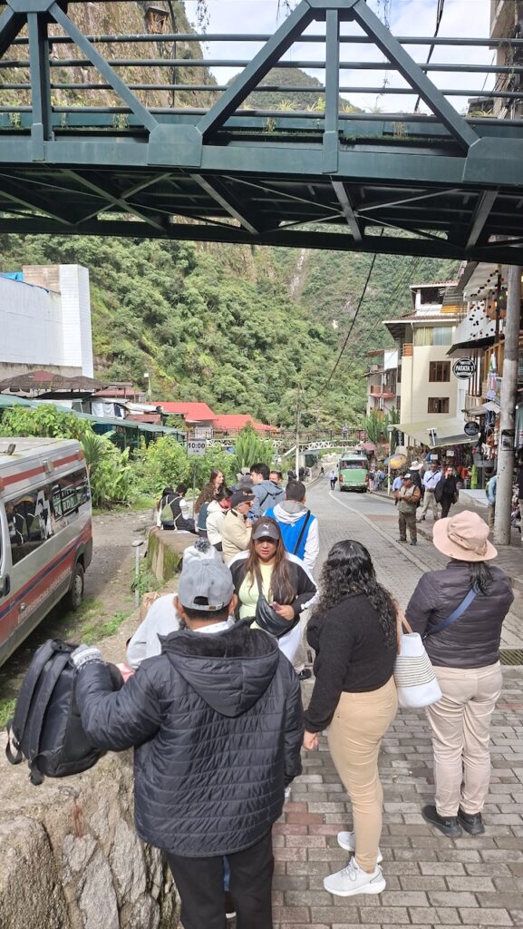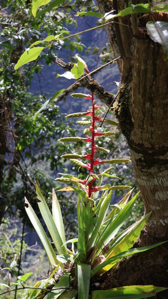 Um 8:30 Uhr in die Warteschlange zum Bus stehen. Viele Führer bieten ihre Dienste an. Wir wählen einen Mann aus und er führt uns durch alles, was wir machen müssen, um in den Bus einzusteigen. Um 9:30 geht’s dann den Berg hoch. Man kann auch nach Machu Picchu laufen. Es geht durch den Urwald, gerade hoch oder hinunter. Unser Führer sagt, es sind ca. 1600 ungleiche Treppenstufen. Vielleicht, wenn ich jünger wäre, wäre es eine Option. Im Bus kann ich die vielen Blumen und Pflanzen nicht fotografieren. Ich sehe aber viele. Auch sehe ich unzählige Bromelien in den Bäumen.
