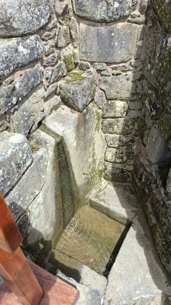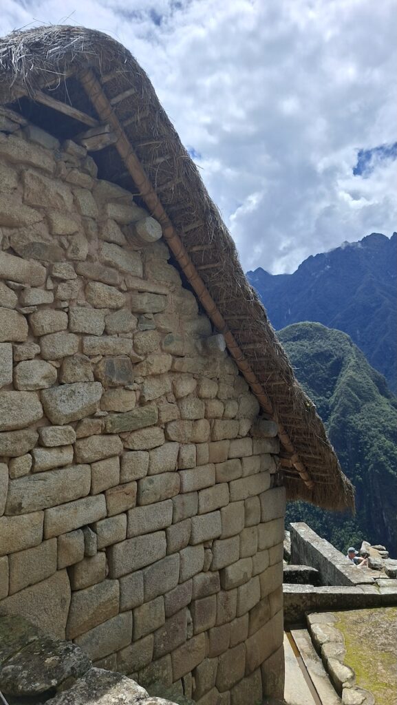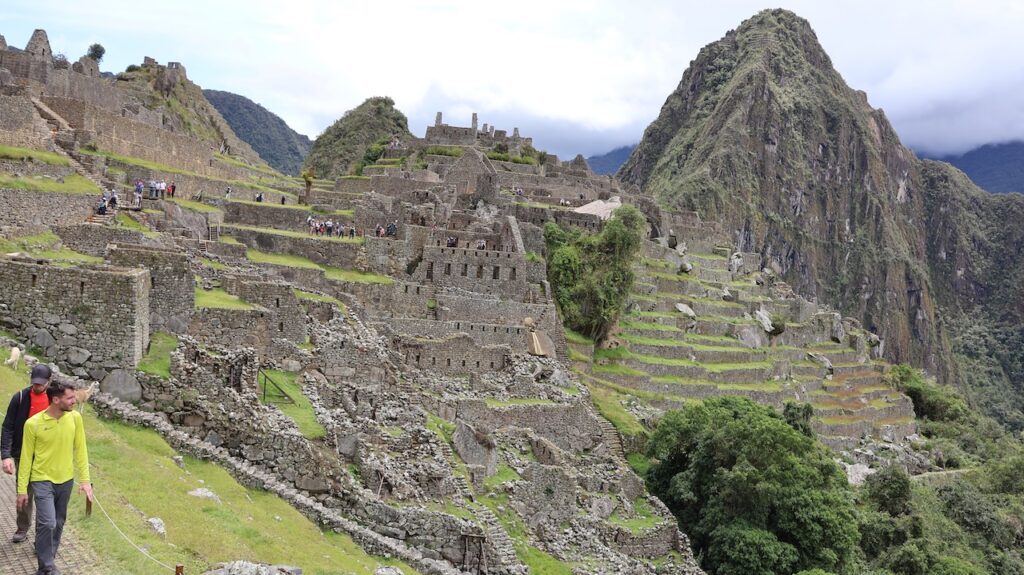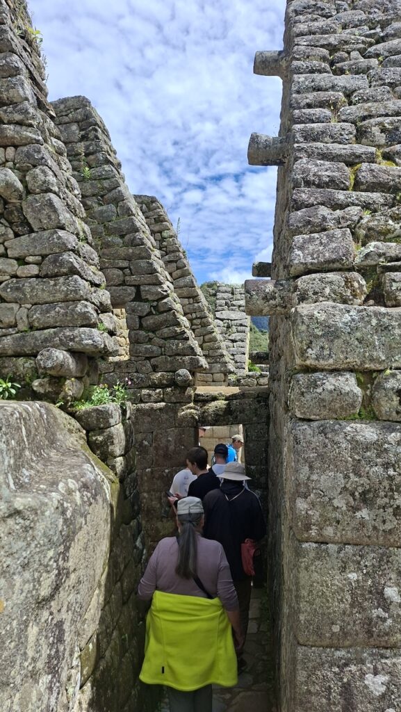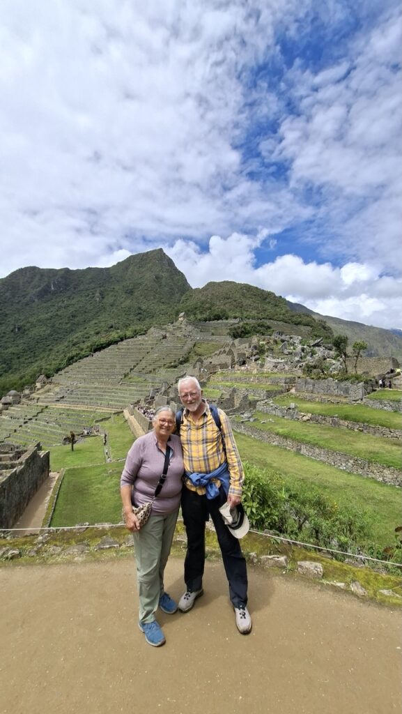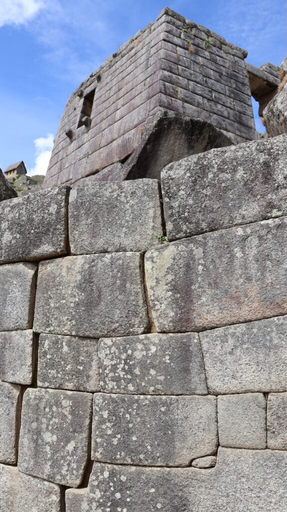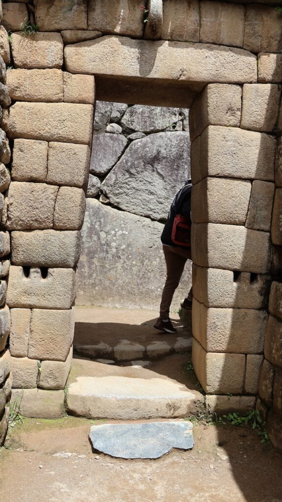 Um 10 Uhr fängt unsere Führung an. Wir bekommen ganz viele Informationen zu hören. Es würde zu weit führen, wenn ich das alles aufschreiben würde. Aber ein paar wenige Details. Ob der Ort mal Machu Picchu hiess oder nicht, weiss man nicht. Er wurde so getauft von den Entdeckern, nach den beiden Bergen links und rechts der Anlage. Es war ein spiritueller, religiöser und astronomischer Ort. Viel weiss man nicht, da von den Inkas keine Schriften erhalten sind. Einige Wissenschaftler sagen, sie hätten gar keine Schrift gehabt und andere beteuern, dass die Spanier alles kaputt gemacht haben. Unser Führer ist der Meinung, dass man keine solche Stadt aufbauen kann, ohne Pläne und dazu braucht es eine Schrift.Es gibt viele Terrassen. Die einen sind zur Befestigung des Hanges und die anderen ergeben Felder. Ungefähr 100 Jahre brauchte es, um die Stadt zu erbauen. 500 Menschen haben hier gewohnt. Aber ein paar tausend waren da, um die Stadt zu erbauen. Die Terrassen wurden unten begonnen. In jeder Terrasse liegen unten grosse Steine, dann Kies. Des weiteren Sand und zuletzt Erde. So wurde gebaut, damit das Wasser abfliessen konnte. Gebaut wurden die Häuser auch Erdbeben sicher. Die Öffnungen wie Fenster und Türen immer in Trapezform. Die wichtigen Häuser, wie Tempel, Königshaus kann man gut daran erkennen, dass die Steine exakt ineinander sich fügen. Bei den normalen Häusern wurden die Steine einfach aufeinandergeschichtet. Innen wurden sie mit Erde verputzt als Schutz vor der Kälte und Nässe.