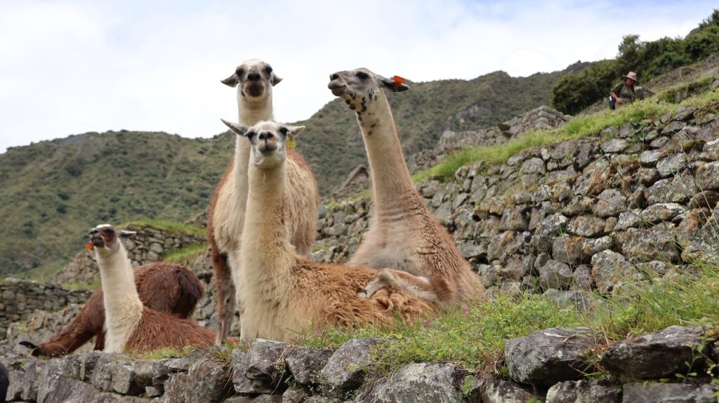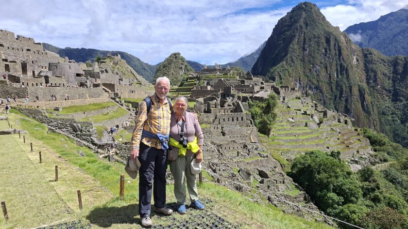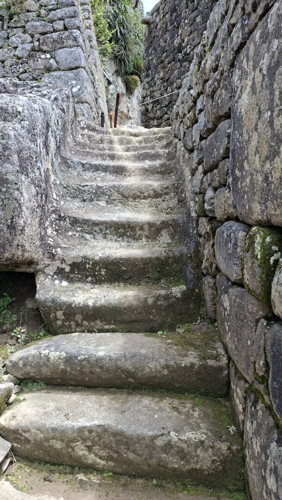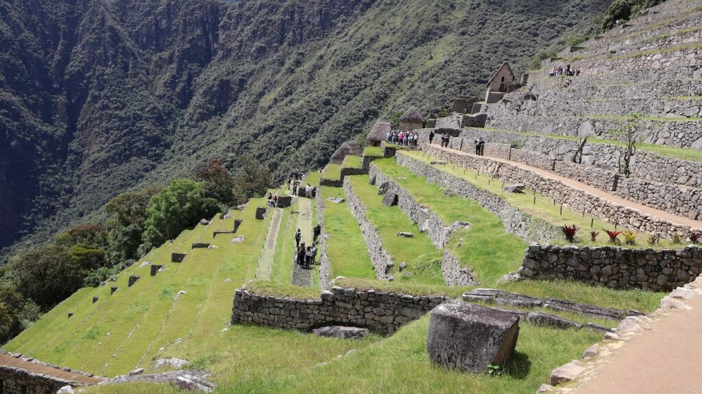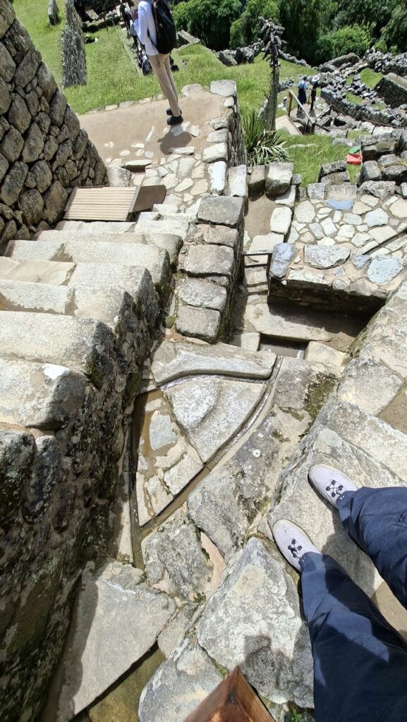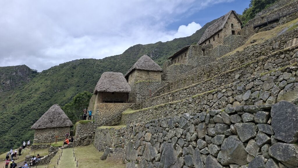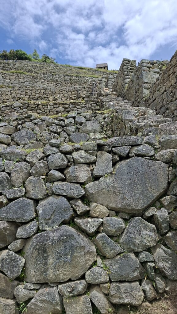 Um 10 Uhr fängt unsere Führung an. Wir bekommen ganz viele Informationen zu hören. Es würde zu weit führen, wenn ich das alles aufschreiben würde. Aber ein paar wenige Details. Ob der Ort mal Machu Picchu hiess oder nicht, weiss man nicht. Er wurde so getauft von den Entdeckern, nach den beiden Bergen links und rechts der Anlage. Es war ein spiritueller, religiöser und astronomischer Ort. Viel weiss man nicht, da von den Inkas keine Schriften erhalten sind. Einige Wissenschaftler sagen, sie hätten gar keine Schrift gehabt und andere beteuern, dass die Spanier alles kaputt gemacht haben. Unser Führer ist der Meinung, dass man keine solche Stadt aufbauen kann, ohne Pläne und dazu braucht es eine Schrift.Es gibt viele Terrassen. Die einen sind zur Befestigung des Hanges und die anderen ergeben Felder. Ungefähr 100 Jahre brauchte es, um die Stadt zu erbauen. 500 Menschen haben hier gewohnt. Aber ein paar tausend waren da, um die Stadt zu erbauen. Die Terrassen wurden unten begonnen. In jeder Terrasse liegen unten grosse Steine, dann Kies. Des weiteren Sand und zuletzt Erde. So wurde gebaut, damit das Wasser abfliessen konnte. Gebaut wurden die Häuser auch Erdbeben sicher. Die Öffnungen wie Fenster und Türen immer in Trapezform. Die wichtigen Häuser, wie Tempel, Königshaus kann man gut daran erkennen, dass die Steine exakt ineinander sich fügen. Bei den normalen Häusern wurden die Steine einfach aufeinandergeschichtet. Innen wurden sie mit Erde verputzt als Schutz vor der Kälte und Nässe.