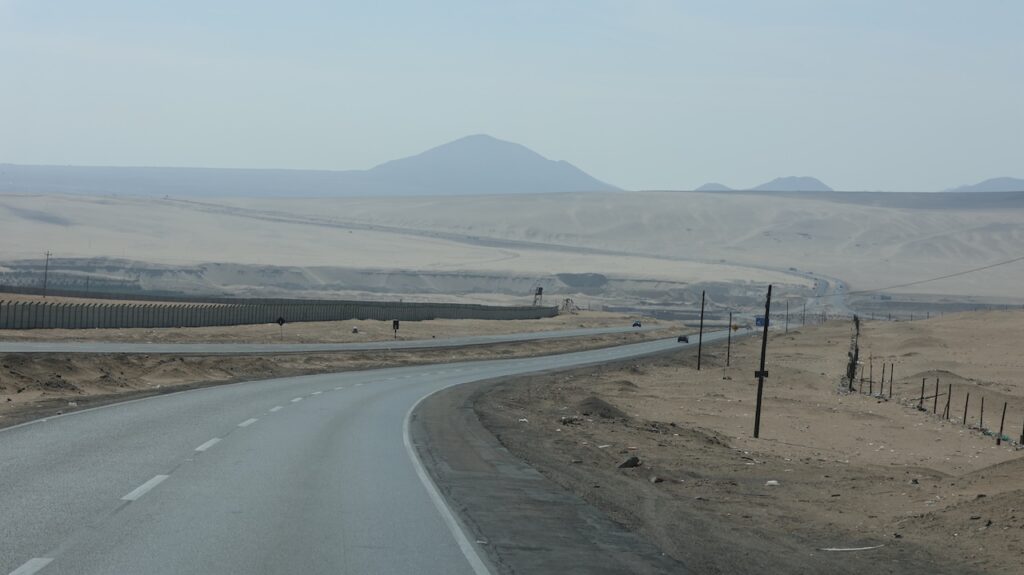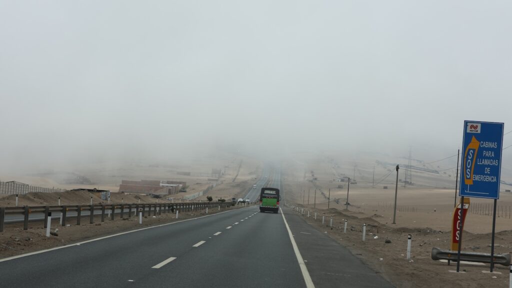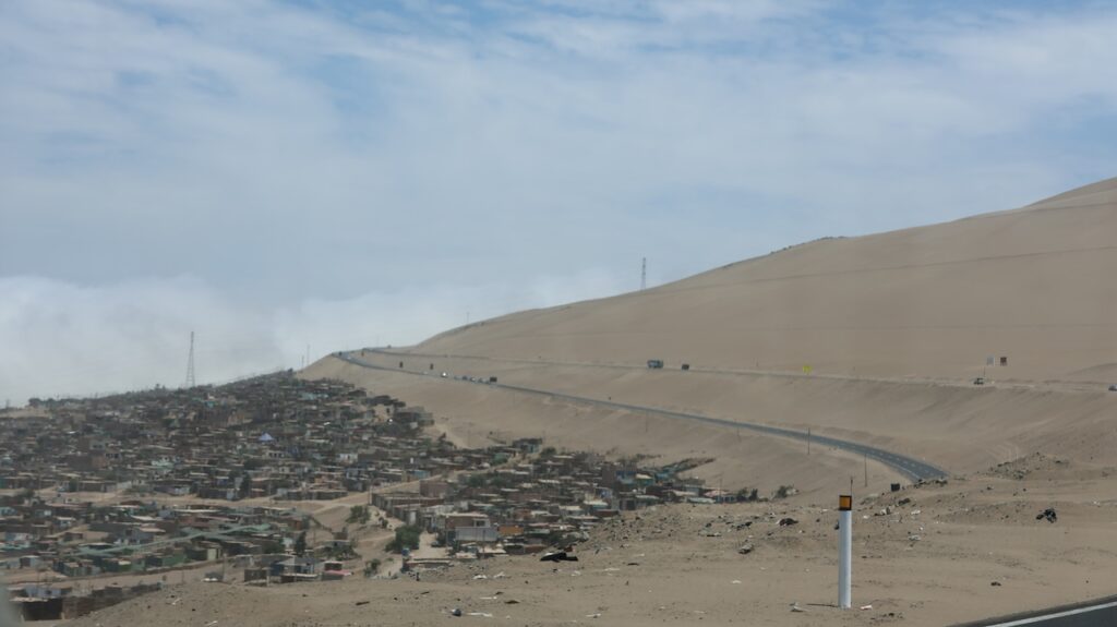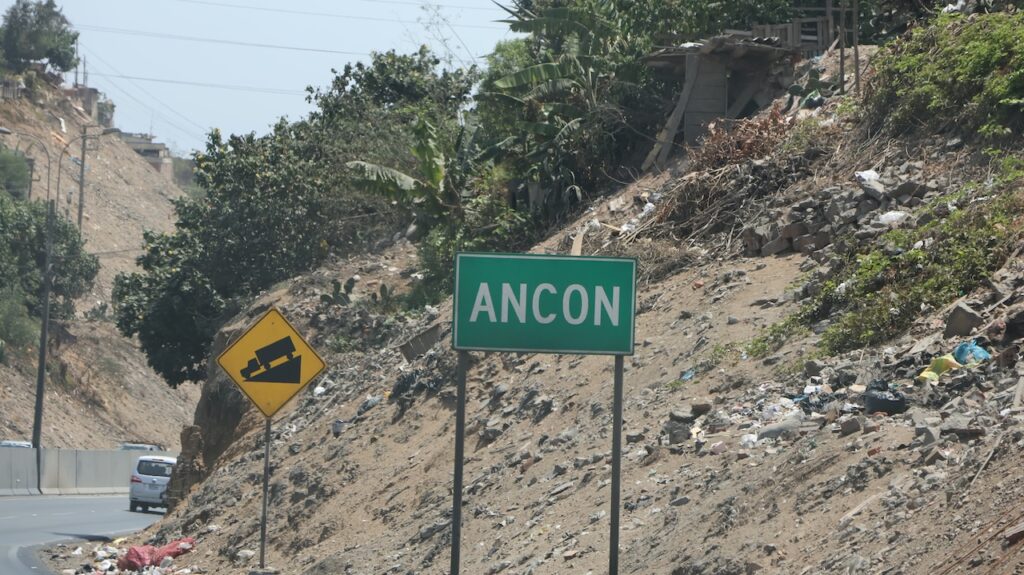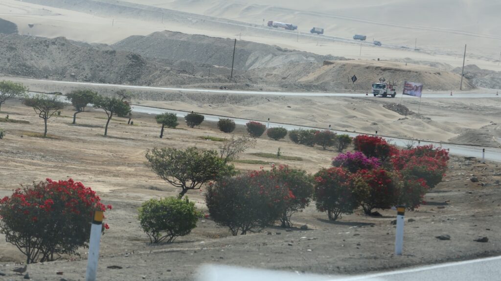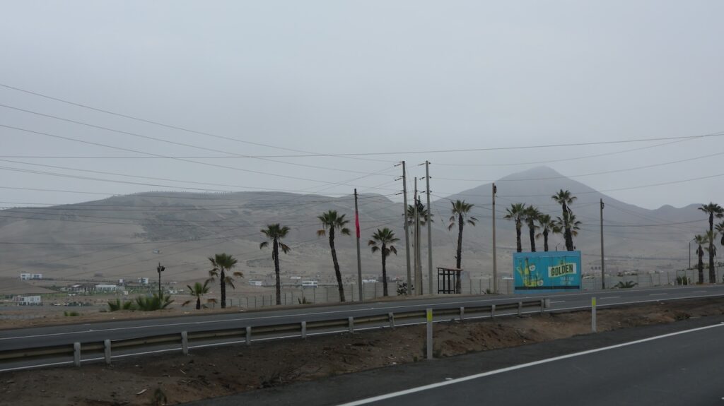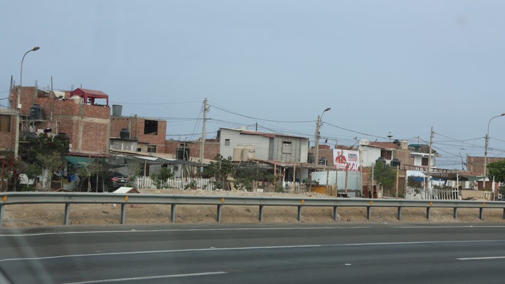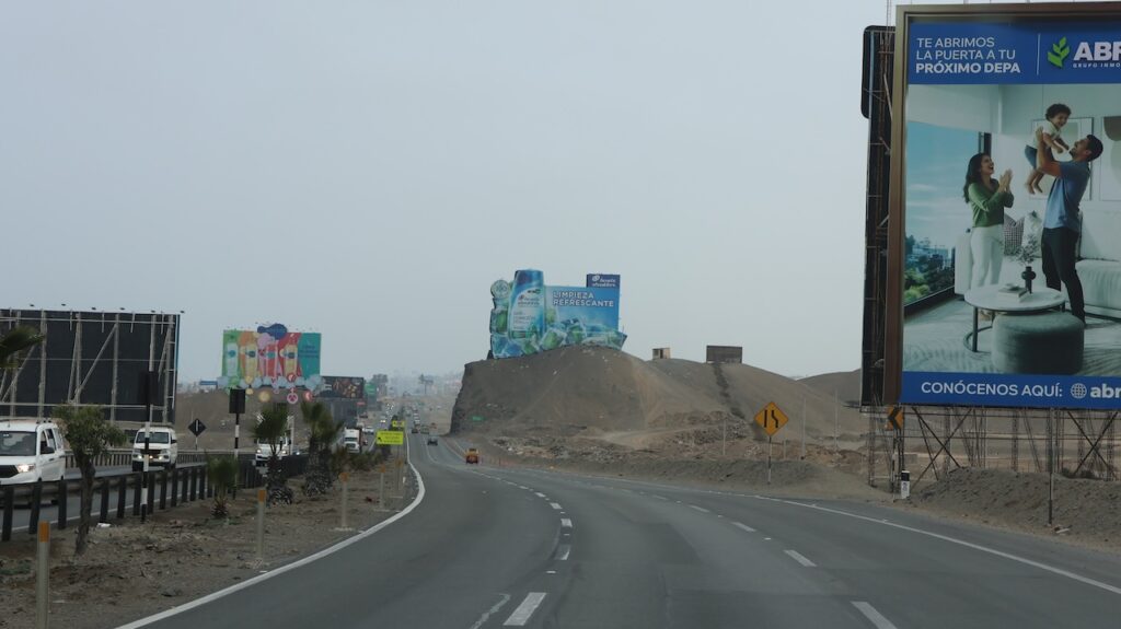 Wir sind schon früh unterwegs, denn heute müssen wir durch Lima fahren und das wird eine Geduldsprobe. Am Strassenrand stehen riesige Werbegebilde. Zum Teil viel grösser als in USA. Von San Antonio bis Ancon kommen wir nicht mehr aus den Häuserschluchten hinaus. Das sind genau 100 Kilometer und dazu brauchen wir 3 Stunden und 15 Minuten. Auf der Strasse ist ein Chaos. Menschen verkaufen Getränke, Früchte und Chips zwischen den Autos auf der dreispurigen Strasse. Motorräder überholen rechts und links. Die Taxis halten überall und stoppen den Verkehr. Wir sind froh, als der Häuserwald sich lichtet, denn dann lichtet sich auch der Verkehr.
