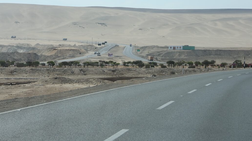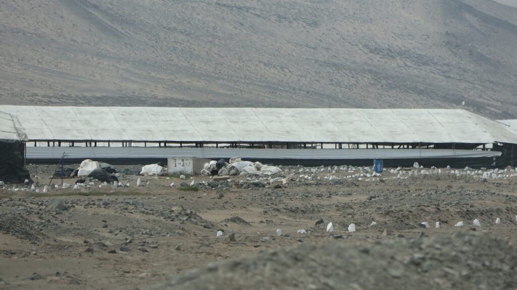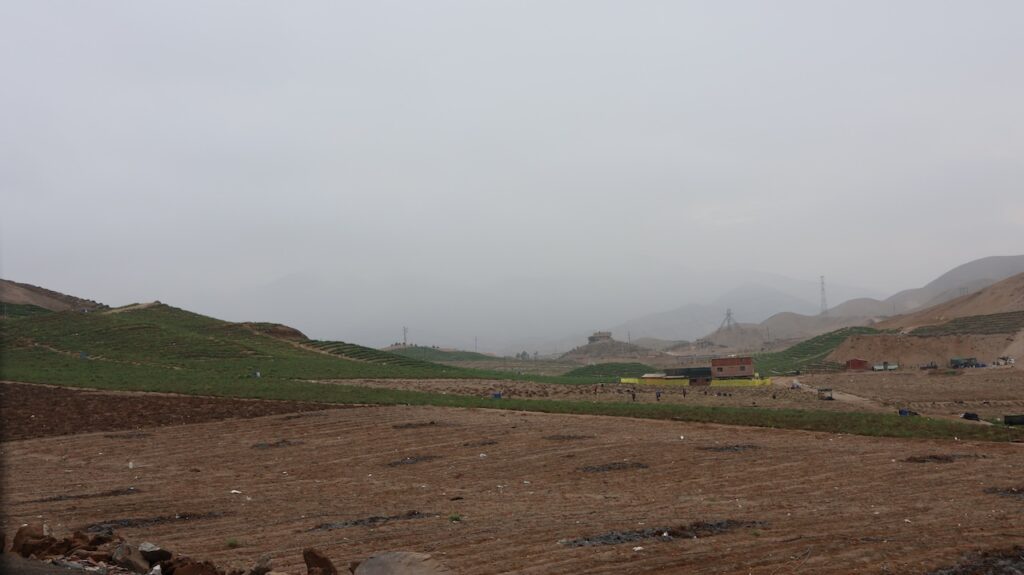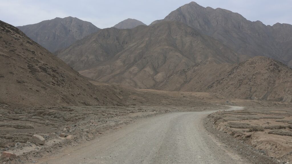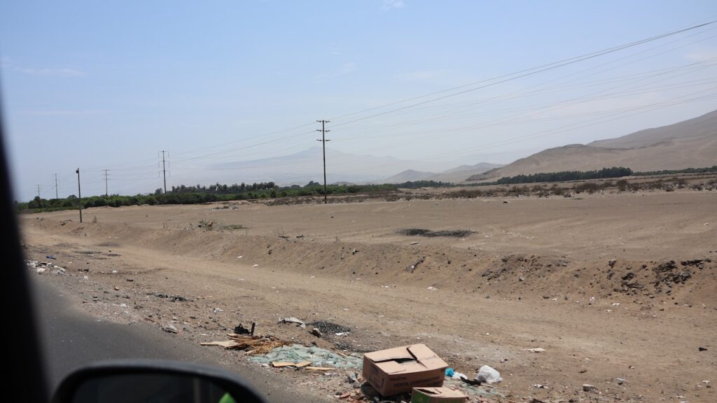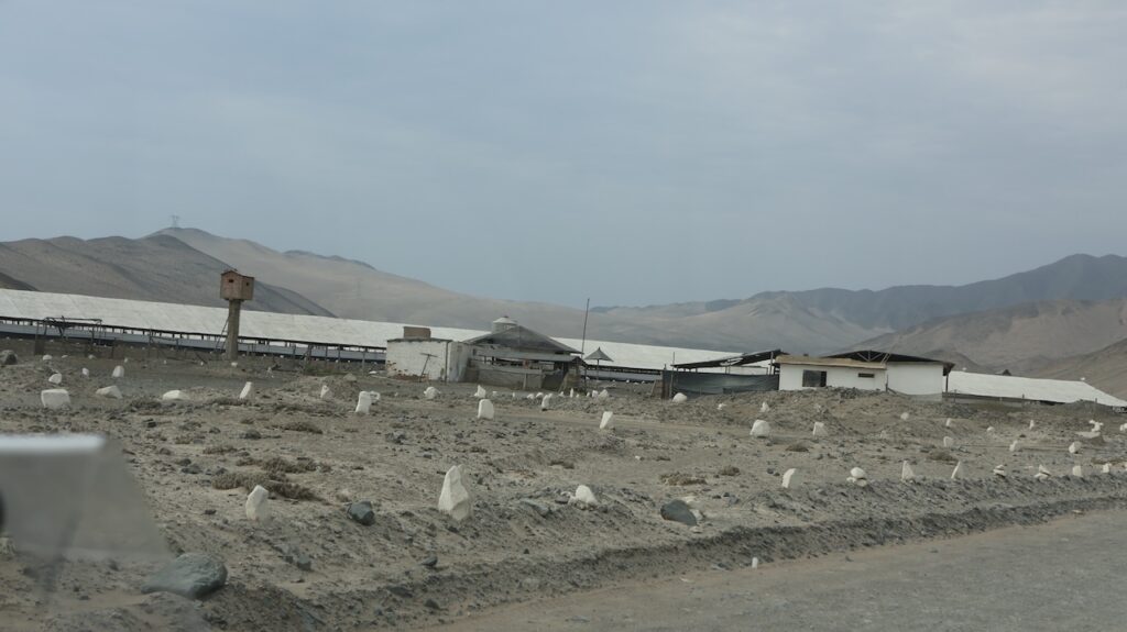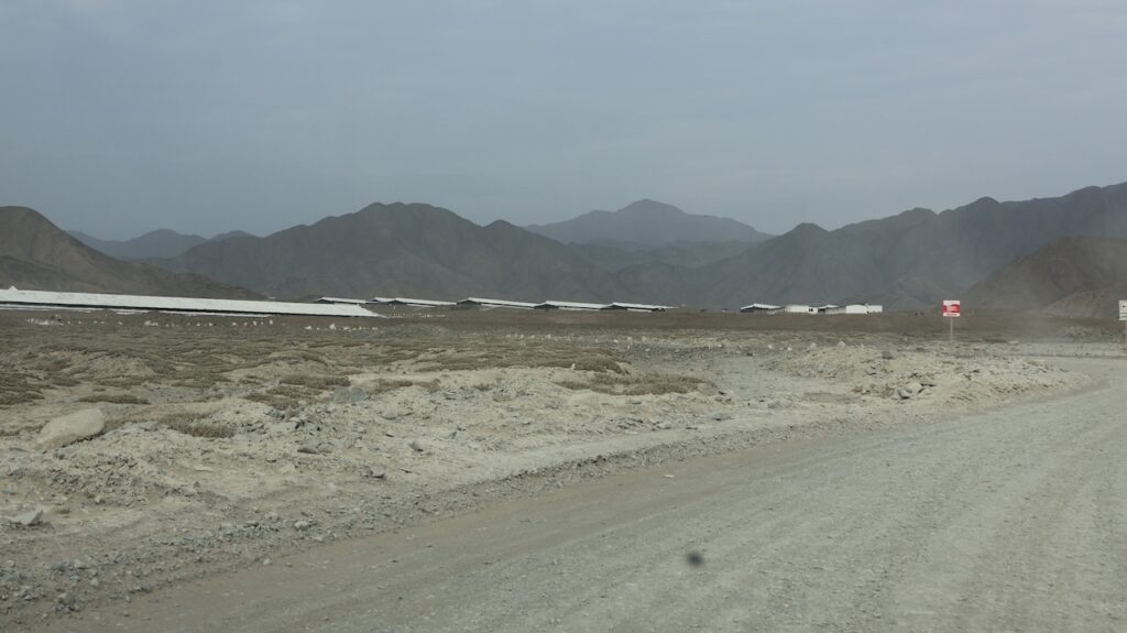 Wir müssen von der Hauptstrasse abzweigen Richtung Caral. Diesen Ort wollen wir morgen besichtigen. Es soll die älteste Stadt Amerikas sein. Es ist eine Schotterstrasse und wir werden plötzlich angehalten. Das Auto wird mit Desinfektionsmittel abgespritzt. Dann können wir weiterfahren. Wir kommen an unzähligen «Hühnerställen» vorbei. Auf Schildern stehen die Nummern der Ställe. Im Internet schaue ich nach, was die Firma produziert. Tatsächlich sind das alles Hühnerställe. Zum Teil sind sie auch leer. Wo was drin ist, sieht man nicht hinein. Dort ist der Bau mit Plastik umwickelt.