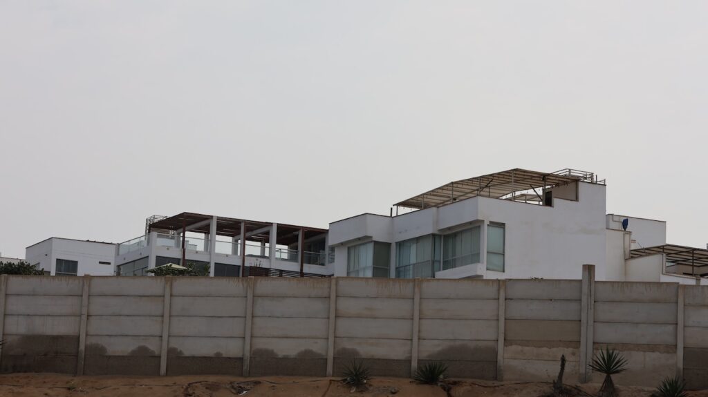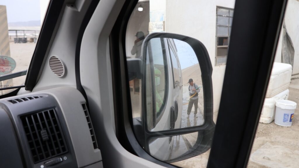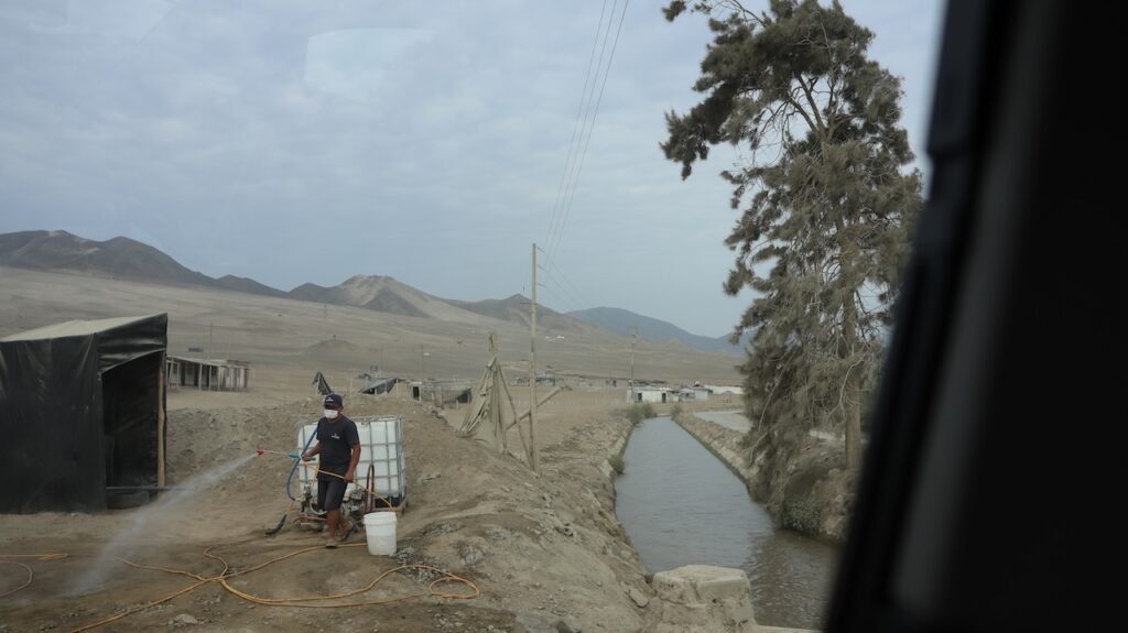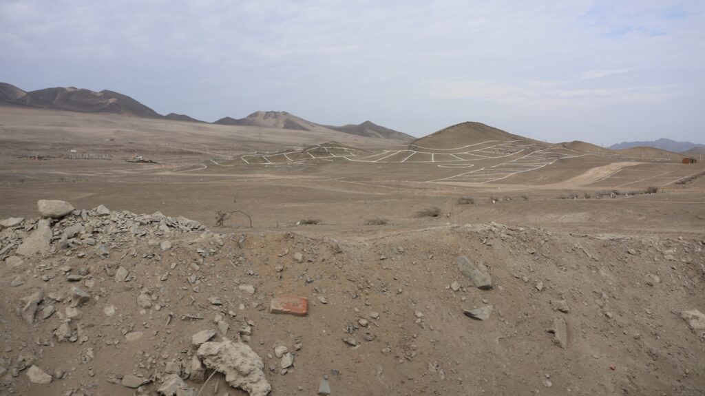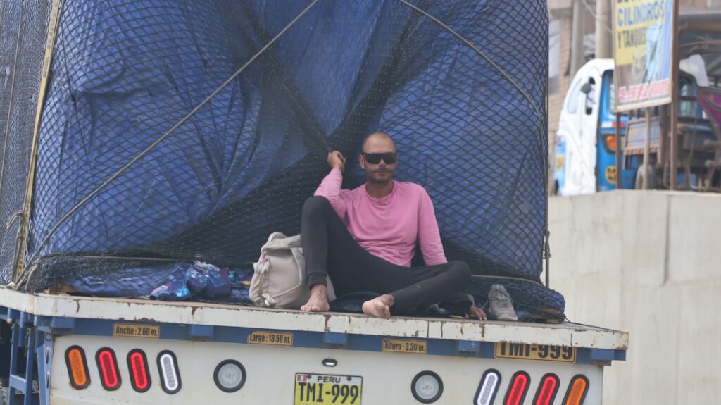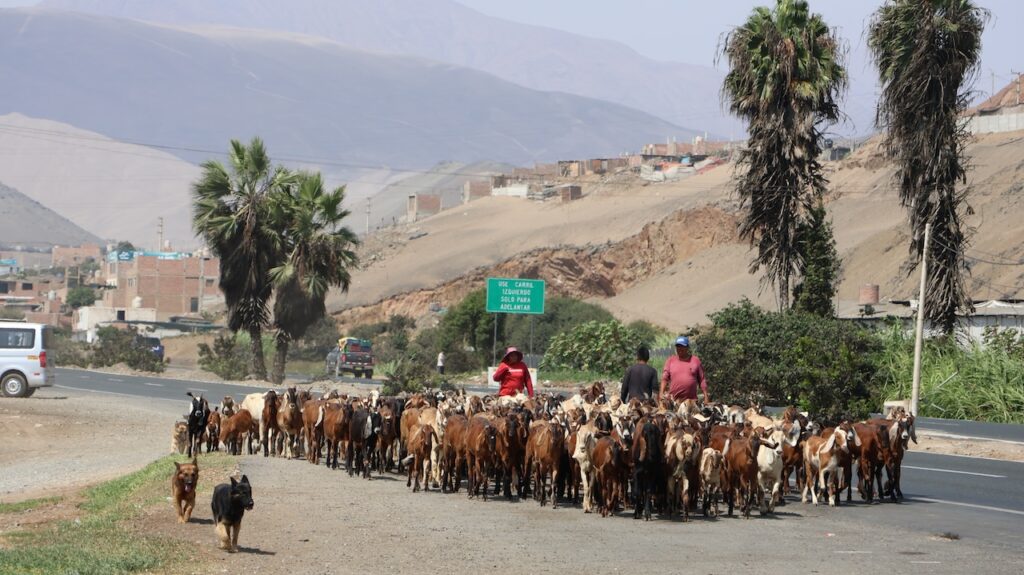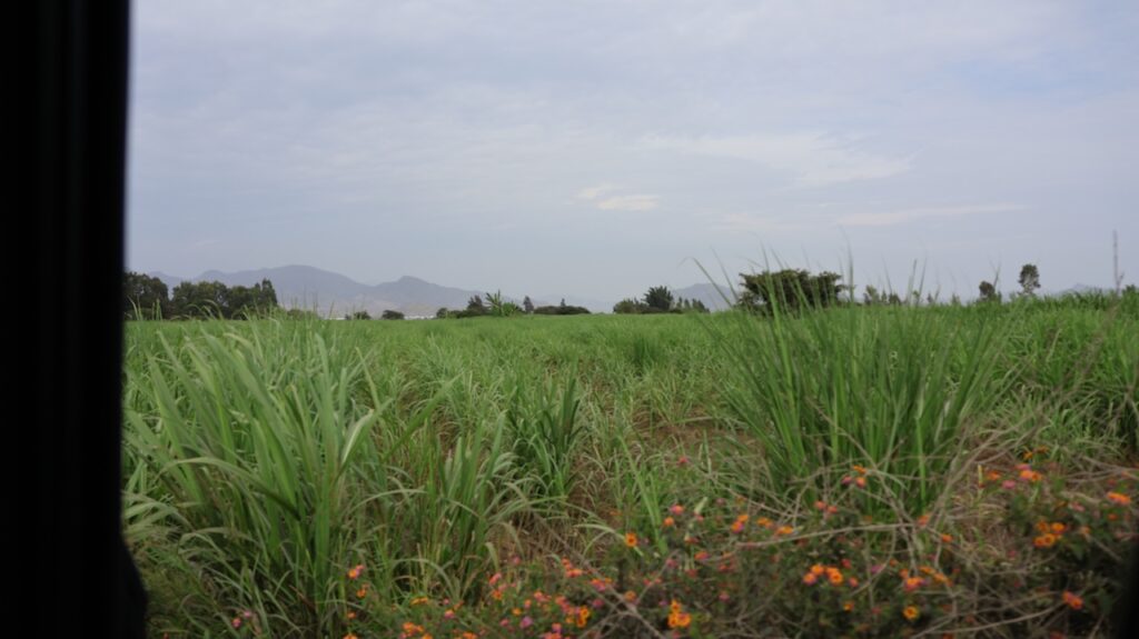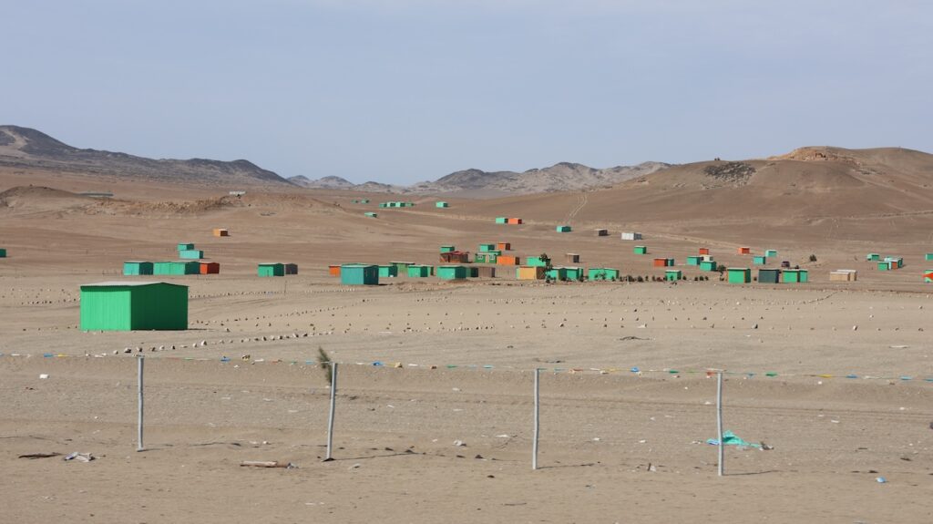 Wir müssen von der Hauptstrasse abzweigen Richtung Caral. Diesen Ort wollen wir morgen besichtigen. Es soll die älteste Stadt Amerikas sein. Es ist eine Schotterstrasse und wir werden plötzlich angehalten. Das Auto wird mit Desinfektionsmittel abgespritzt. Dann können wir weiterfahren. Wir kommen an unzähligen «Hühnerställen» vorbei. Auf Schildern stehen die Nummern der Ställe. Im Internet schaue ich nach, was die Firma produziert. Tatsächlich sind das alles Hühnerställe. Zum Teil sind sie auch leer. Wo was drin ist, sieht man nicht hinein. Dort ist der Bau mit Plastik umwickelt.