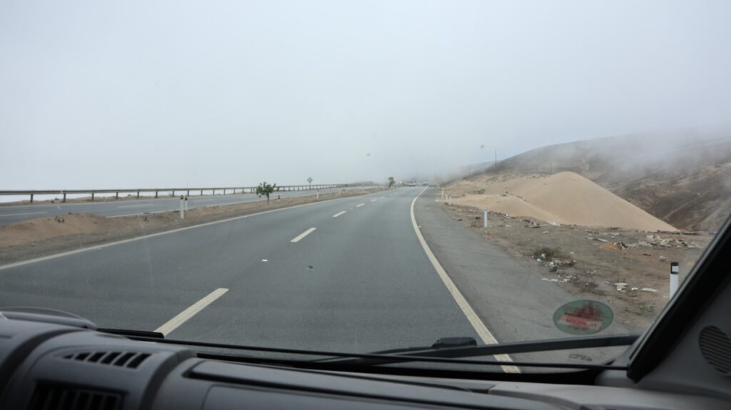 Unterwegs essen wir in einer Bakery unseren Lunch. Das Essen ist gut, aber es gibt kein Brot zu kaufen. Es wird neblig und sandig.