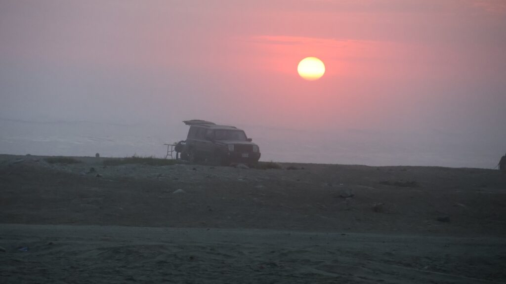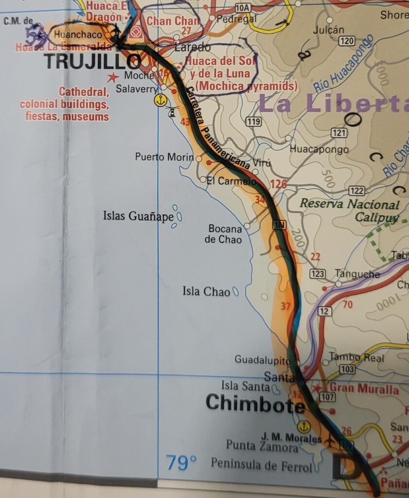 Die Strasse ist sehr gut ausgebaut. Nur durch die Ortschaften wird sie einspurig. Zum Glück führt die zweispurige Strasse um Chimbote herum. In den Ortschaften herrscht immer ein Verkehrschaos. Es zieht sich dann doch noch bis Trujillo. Die Sonne hat sich kurz nach Mittag hinter Wolken versteckt. Kurz vor Trujillo schaut sie noch einmal kurz hervor. Als wir am Strand eintreffen, verabschiedet sie sich glutrot.