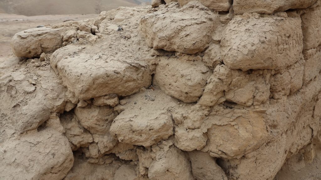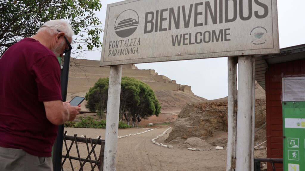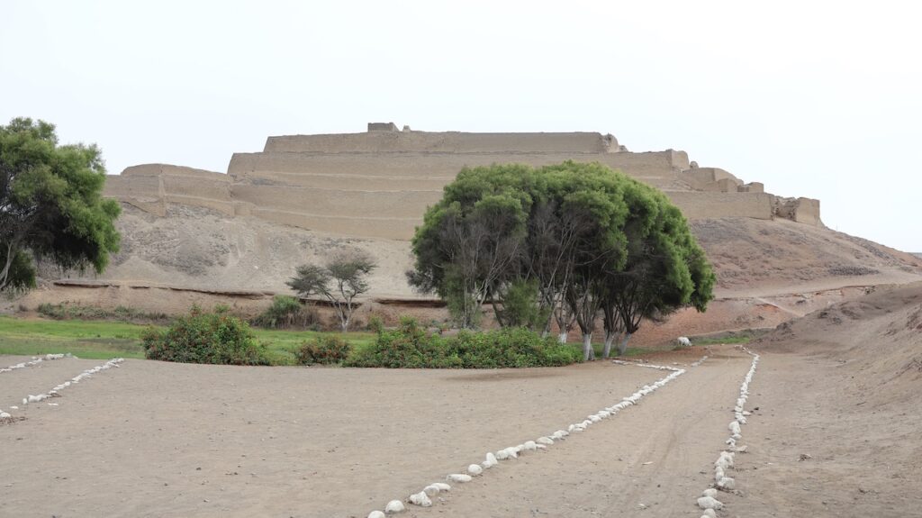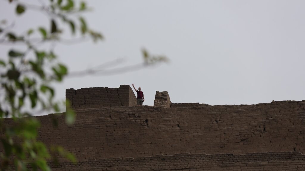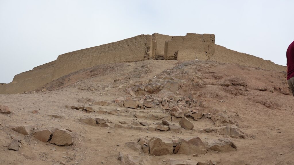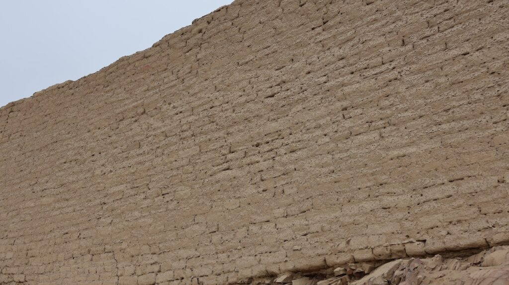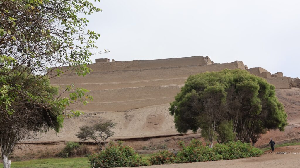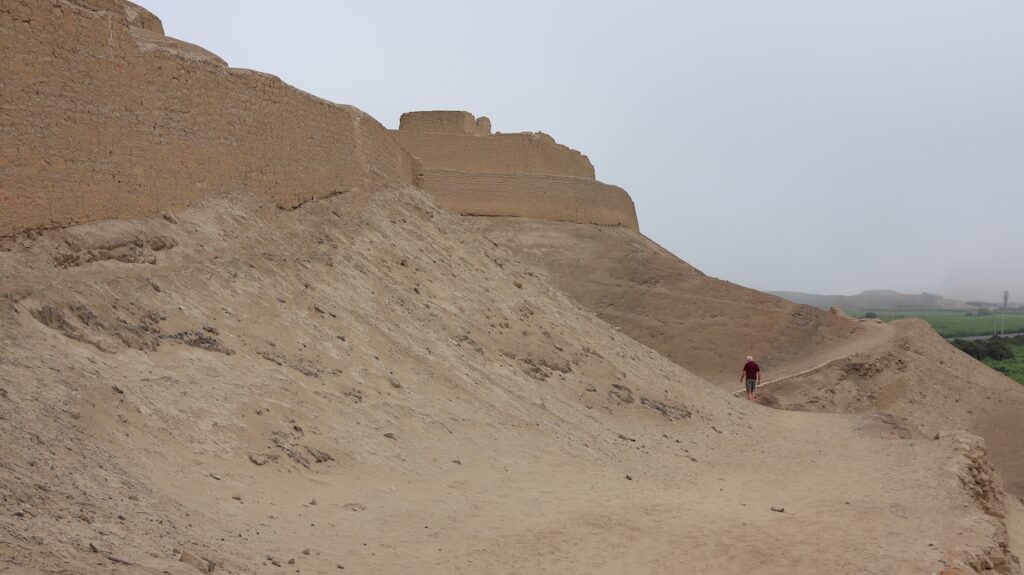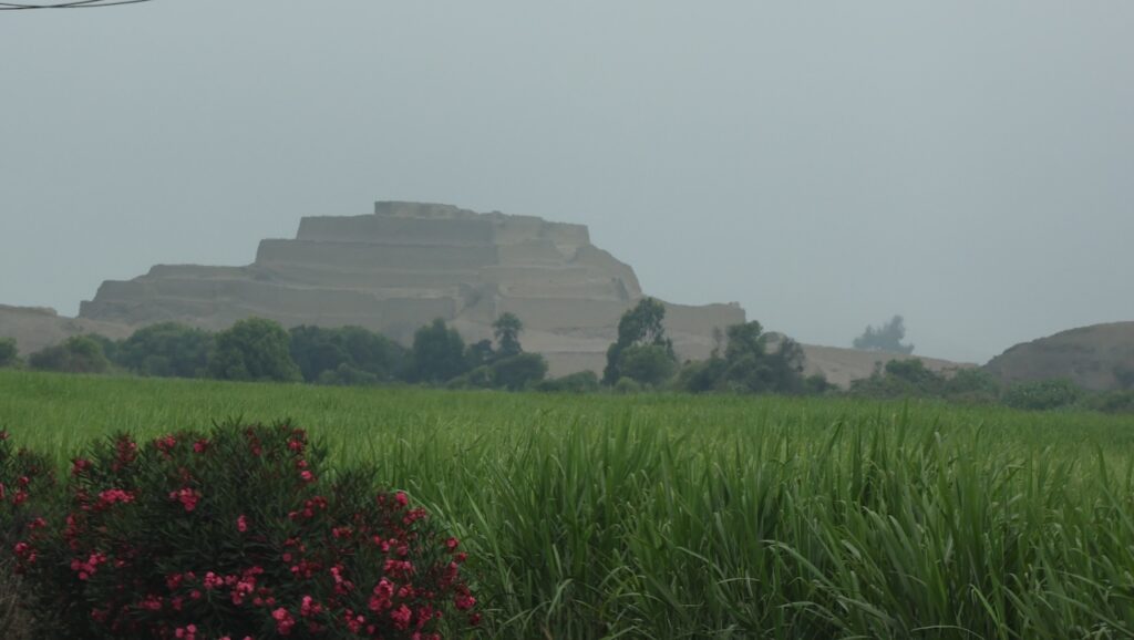 In Paramonga steht eine Burg der Chimu. Sie ist wie eine Pyramide in 4 Stufen mit Lehmziegeln erbaut. Sie ist 30 Meter hoch. Wir halten an und wollen sie besichtigen. Ein Mann tritt unter den Bäumen hervor und verlangt 10 Sol. Wir wollen zuerst besichtigen. Ich laufe bis zur Mitte mit Manfred, dann steige ich wieder ab. Der Mann beginnt mit mir zu reden. Er läuft zu seinem Fahrrad und bringt mir 8 Früchte. Er lacht breit, von einem Ohr zum anderen. Ich weiss nicht wie die Früchte heissen. Ich glaube sie sind noch nicht reif. Morgen werde ich eine aufschneiden, dann weiss ich mehr.