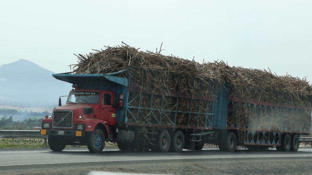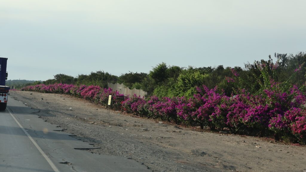 Heute geht’s weiter. Es ist wieder sehr neblig. Die Landschaft besteht aus Bergen und viel Sand. In den Tälern ist es manchmal grün, vor allem wenn ein Wasser führender Fluss durchzieht. Vor allem wird Mais angebaut und vermehrt sehen wir jetzt auch Zuckerrohr.