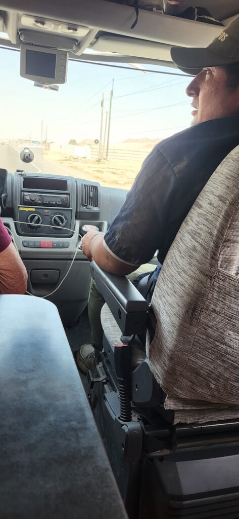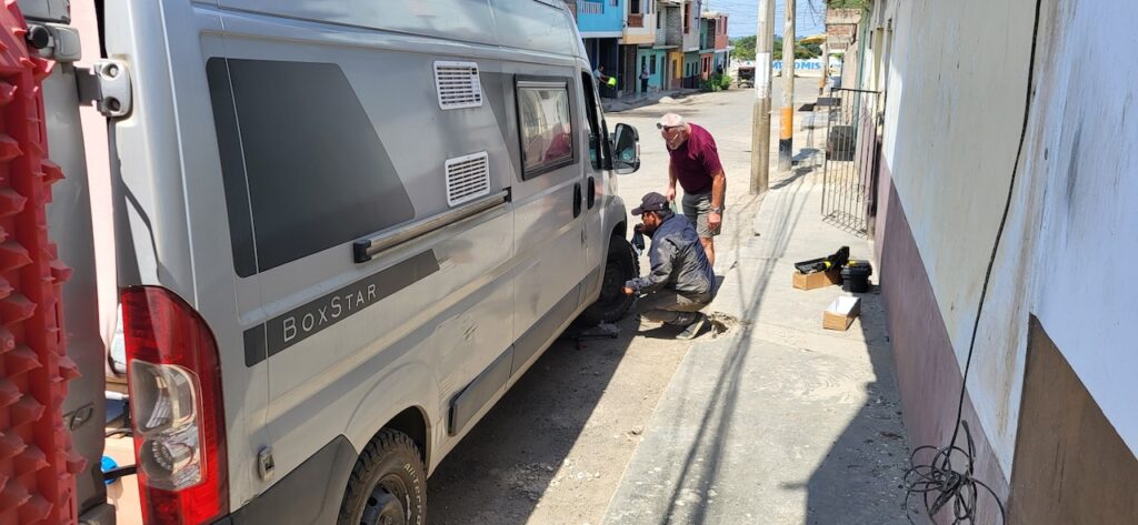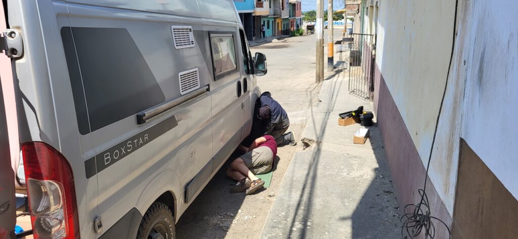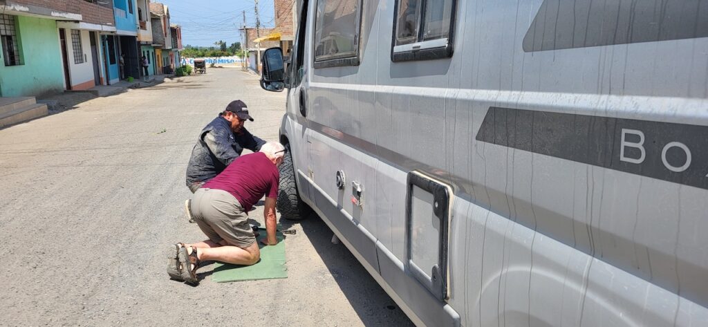 In Paijan hält ein Taxi vor uns. Ein Mann steigt aus. Manfred fährt langsam auf das Taxi zu. Der Mann zeigt auf unser rechtes Vorderrad und macht mit der Hand eine schüttelnde Bewegung. Manfred fährt einfach weiter. Ich will, dass er anhält und nachschaut was da los ist. Er fährt noch ein Weilchen und hält dann doch an. Er läuft um das Auto und meint er sieht nichts. Von vorne kommt ein Mann auf uns zu und meint unsere rechtes Vorderrad wackle. Er könne uns helfen, er sei Mechaniker. Er hat einen Kittel an mit Automarken aufgestickt. Er steigt ein und wir fahren zu ihm nach Hause. Falls es sein Haus ist??? Da kommt auch schon ein zweiter Mann mit demselben Kittel. Er hat einen Werkzeugkoffer bei sich. Der erste Mann schaut unter das Rad und sagt Manfred das die Spurstange kaputt sei. Ob er Originalersatzteil will oder etwas anderes. Manfred will Original. Der Mann meint das wird teuer. Dann ist er auch schon weg. Der zweite Mann, er heisst Jean Carlo fängt an die kaputte Spurstange auszubauen und auch die am linken Rad. Manfred bremst ihn. Halt, halt, ich will zuerst hinter das Rad schauen. Schon ist der erste Mann mit den Ersatzteilen da. Manfred und er sitzen im Auto und versuchen miteinander über das Übersetzerprogramm zu reden. Für Manfred geht alles viel zu schnell. Das Übersetztungsprogramm ist langsam. Schon hat Jean Carlo die neuen Spurstangen montiert und der erste Mann präsentiert die Rechnung. Manfred bekommt beinahe einen Herzschlag. Der will 3400 Dollar!!!!