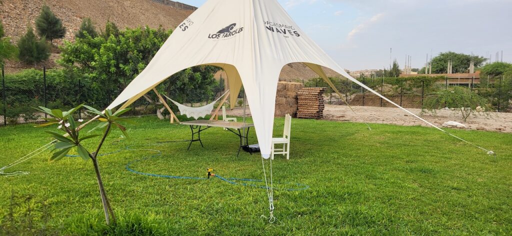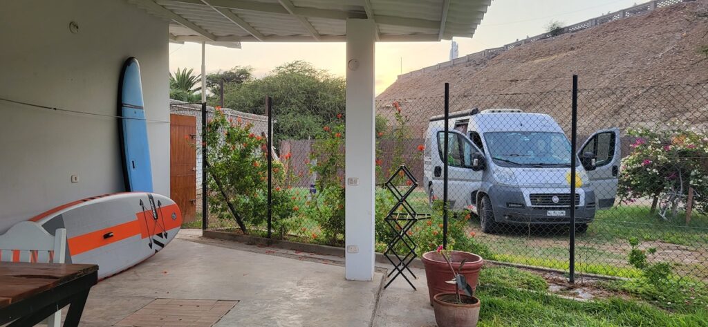 Wir schaffen es noch bis Pacasmayo, wo wir auf einem Hinterhofcamping von einem Hotel übernachten.