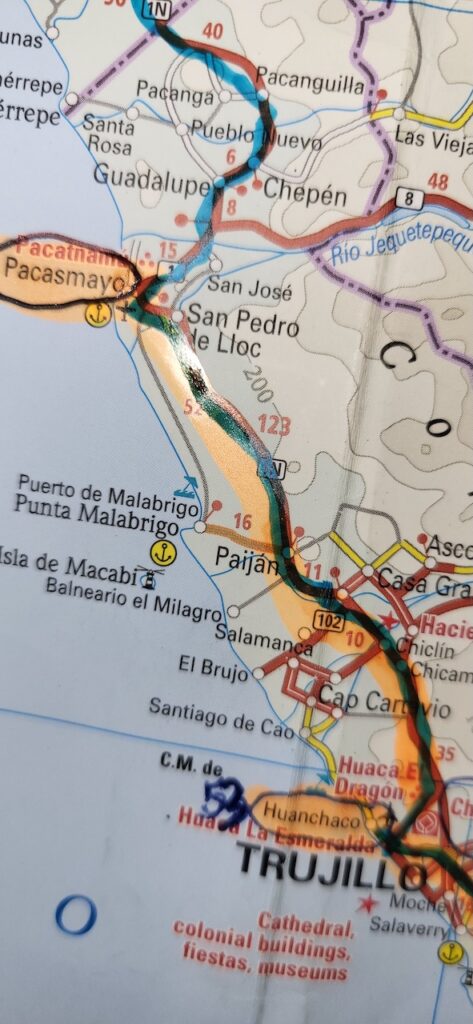 Wir gehen zur Bank. So viel kann ich nicht an einem Tag abheben. Usw…..Manfred drückt den Preis bis 2000 Dollar. Danach fahren wir mit Jean Carlo zurück nach Trujillo, um Geld abzuhaben. Um 14 Uhr übergibt Manfred das Geld. Jean Carlo wünscht uns eine gute Reise und gibt Manfred den guten Rat vorsichtiger über die Pumber und Schlaglöcher zu fahren.