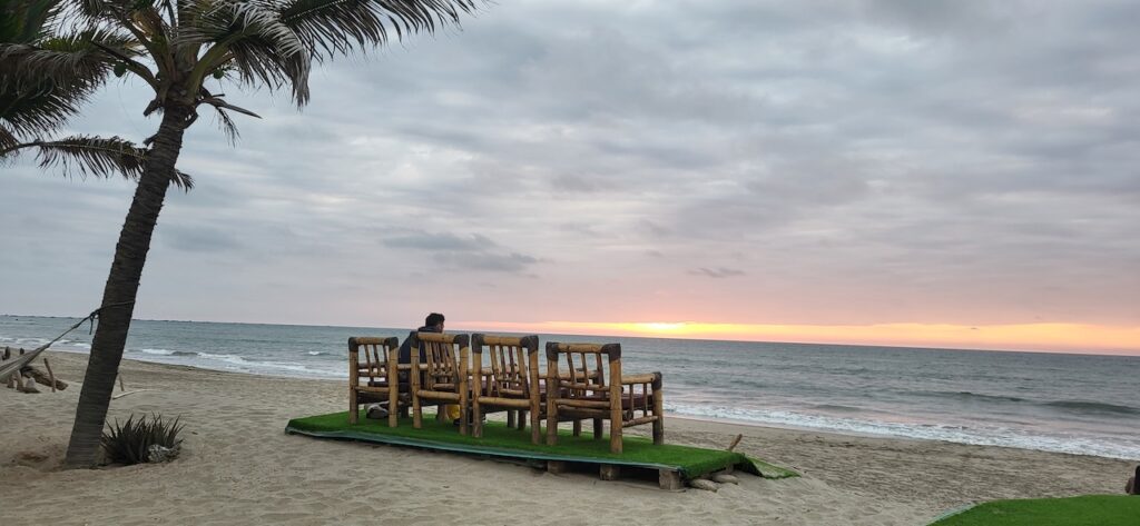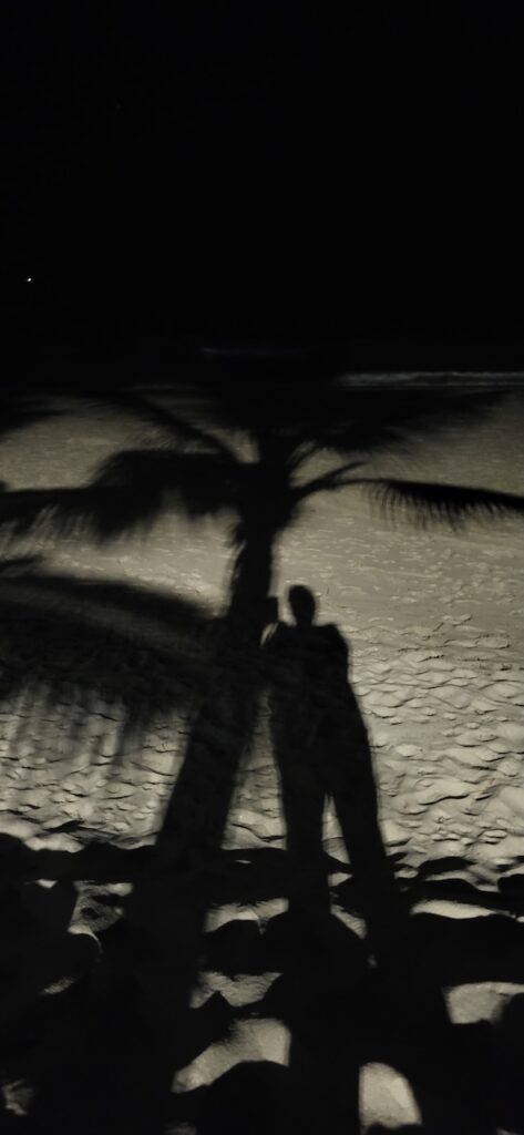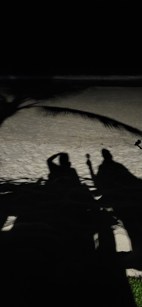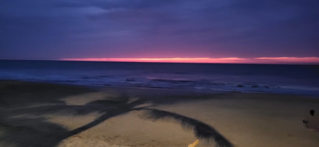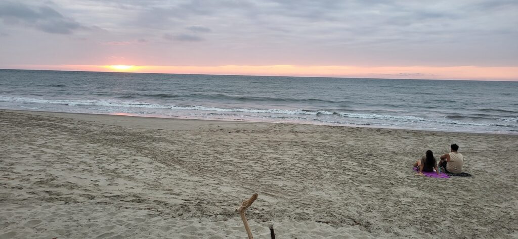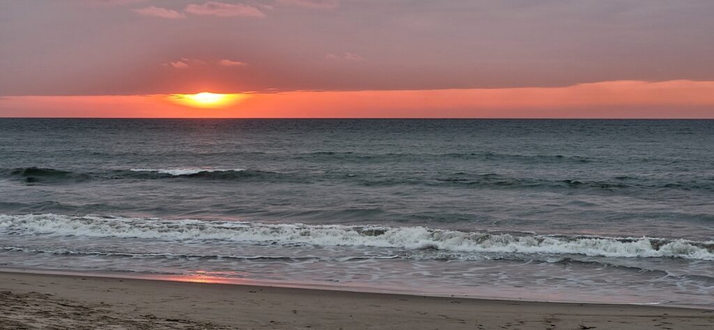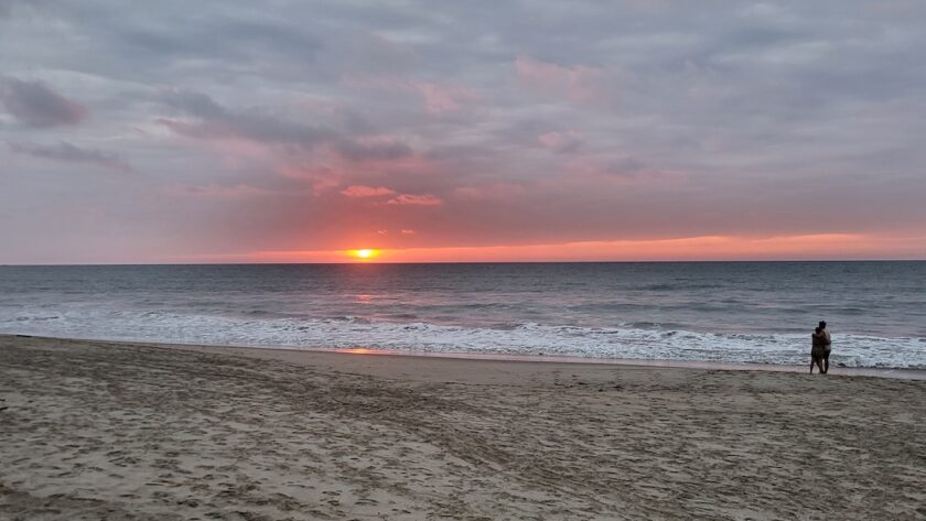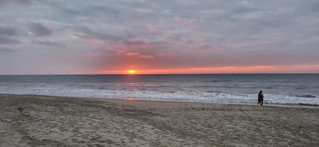 Wir sind genau zum Sonnenuntergang im Campingplatz. Am Strand sitzt ein junges Pärchen. Als sich die Sonne aus der Wolkendecke Richtung Meer schiebt, stehen sie auf und laufen eng umschlungen zum Wasser. Dort kniet er nieder und macht ihr einen Heiratsantrag. Ein romanischer Abschluss dieses Tages.