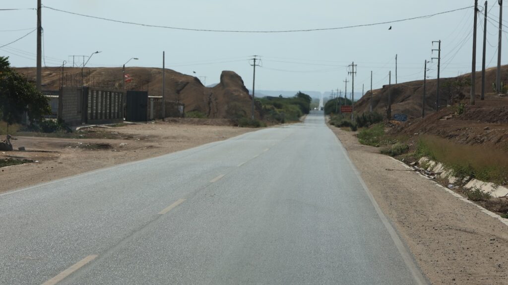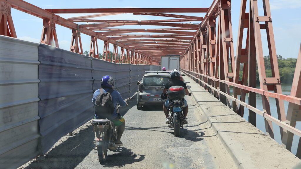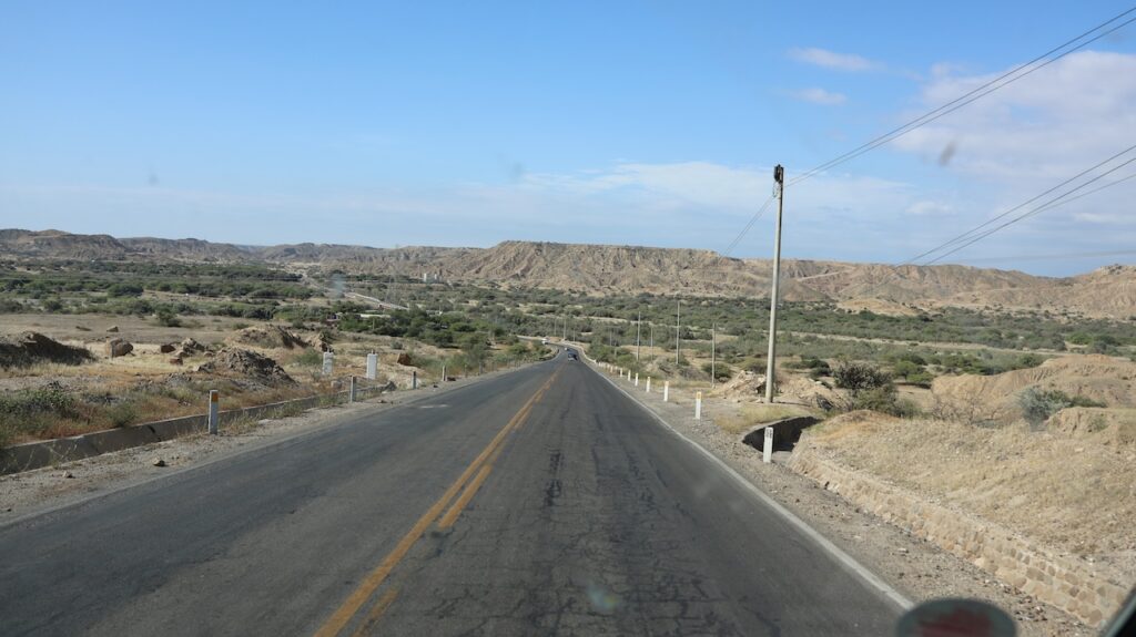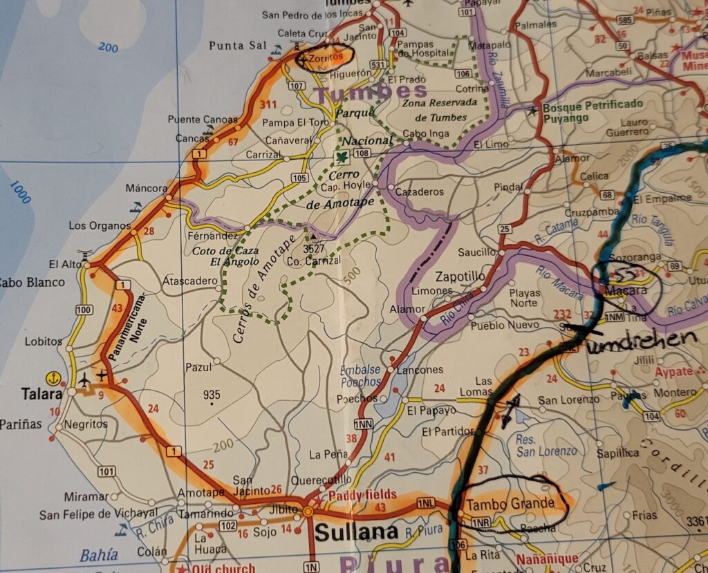 Nach der Ortschaft ist wieder Reis und Zuckerrohr angebaut. Auch viele Obstbäume sehen wir. Wir werden von der Polizei aufgehalten, die uns aber nach Sichtung des Nummernschildes zur Weiterfahrt auffordert. Etwa 10 Kilometer vor der Grenze zu Ecuador ist eine Strassensperre des Zolls. Der Zöllner macht uns höflich darauf aufmerksam, dass die Grenze nach Ecuador seit September 2025 geschlossen ist. Er zeigt Manfred auf der Karte, wo er hinfahren muss, um nach Ecuador zu kommen. Im Amazonasgebiet ist eine Grenze offen, aber in Ecuador vielfach nicht besetzt. Und die Grenze in Aguas Verdes ist auch offen. Das heisst, es ist eigentlich die einzige offene Grenze. Wir müssen umdrehen und Richtung Pazifik fahren, was wir eigentlich vermeiden wollten. Wir haben im Internet nachgesehen und da stand nicht, dass der Grenzübergang nach Macara gesperrt ist. Später habe ich gesehen, dass es im Facebook mehrfach steht. Aber wir haben kein Facebook!!!