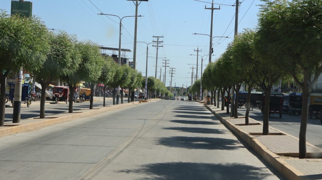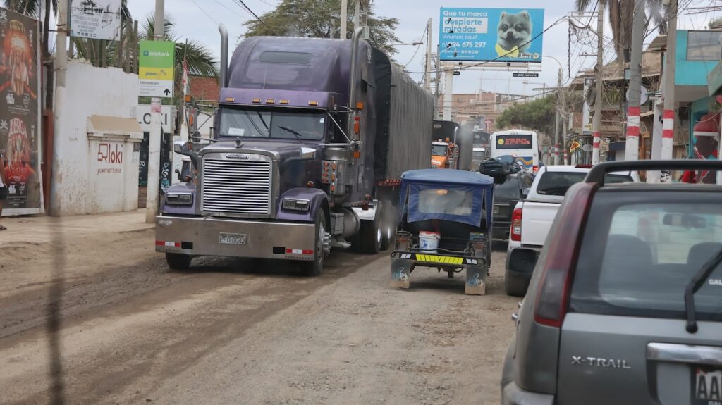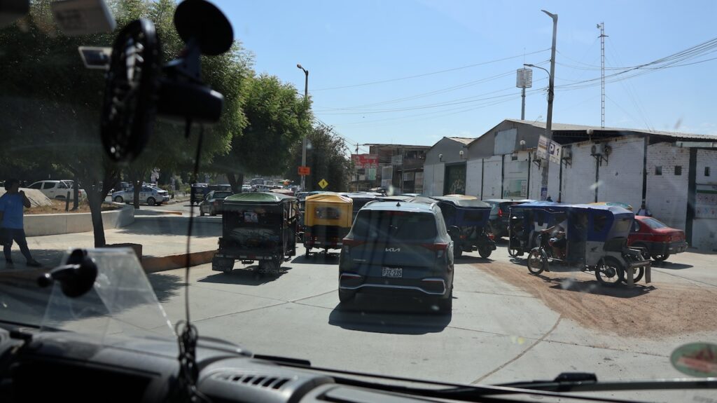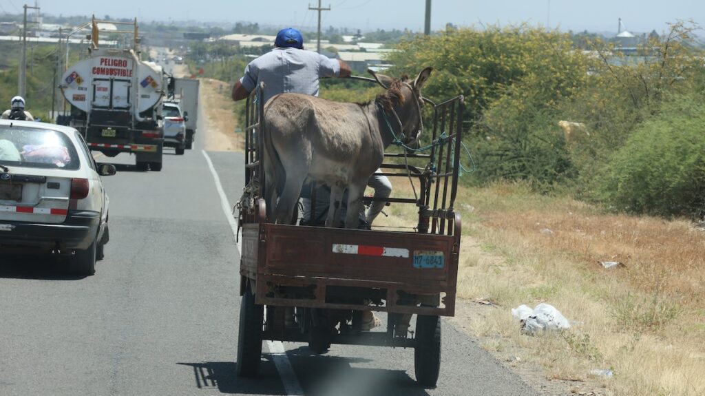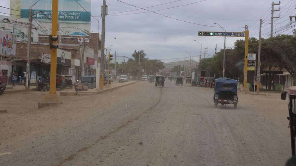 Im Ort Tambo Grande will Manfred, bei der einzigen Bank mit Western Union Geld abheben. Wir haben gestern unser letztes Bargeld für Benzin und den Elektriker ausgegeben. Jetzt haben wir nur noch einige Münzen. Das reicht wahrscheinlich nicht bis zur Grenze, um die Strassengebühr zu bezahlen. Die Dame am Schalter meint, sie könne ihm das Geld nicht bar geben, sondern er müsse es auf ein Konto einzahlen!!! Öfter mal was Neues! Manfred versucht Geld vom Bancomat zu beziehen. Geht auch nicht. 3 Damen stehen um ihn herum und wollen helfen. Manfred sieht sich bedrängt und eine Dame sagt, sie wollen ihn nicht bestehlen, sondern wirklich helfen. Am Schluss wechselt Manfred Dollar in Soles um. Das geht! Mit solchen Sachen geht immer viel Zeit verloren.
