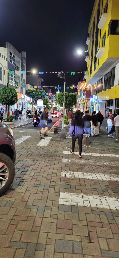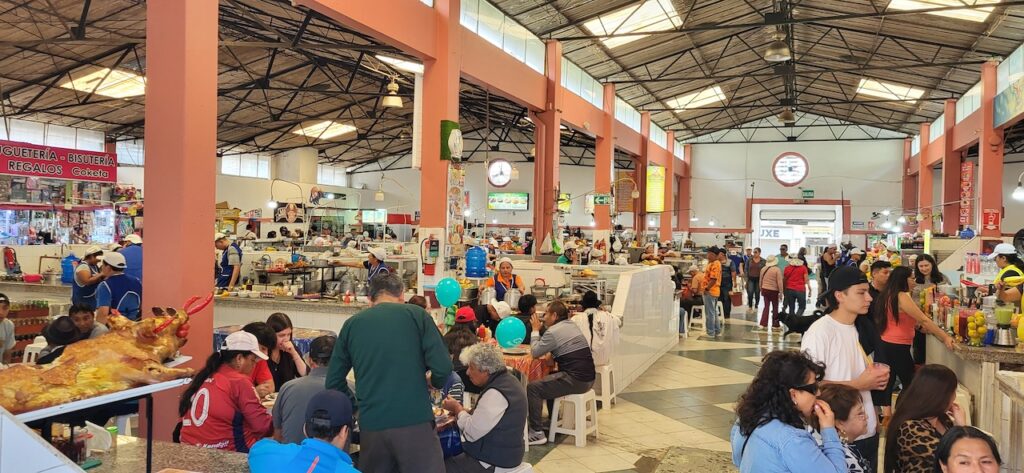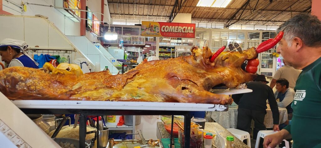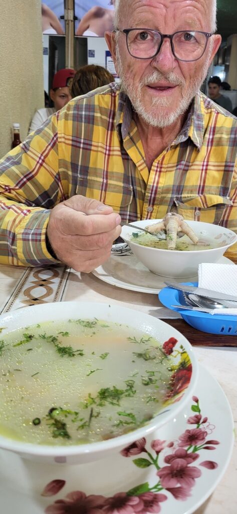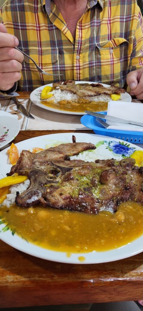 Wir laufen in den Ort, um in der Markthalle noch Gemüse einzukaufen. Wir probieren dann das Menu in einem einheimischen, kleinen Restaurant. Es gibt zuerst Suppe. Eine Bouillon mit Reis, Karotten, grünen Bohnen und noch etwas vom Huhn. Bei Manfred ist es ein Fuss!!! Danach einen Teller randvoll mit Reis, weissen Bohnen an Tomatensause, eine halbe Kochbanane, Salat aus Eisberg, gekochten Karotten und Mais. Obendrauf ein ecuadorianisches Schweinekotelett vom Grill. Will heissen, ganz dünn geschnitten. Mal sehen, was unser Darm und Magen dazu sagt. Dazu ein frisch gepresster Obstsaft. Kosten 3.50 Dollar pro Menu.