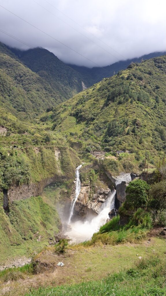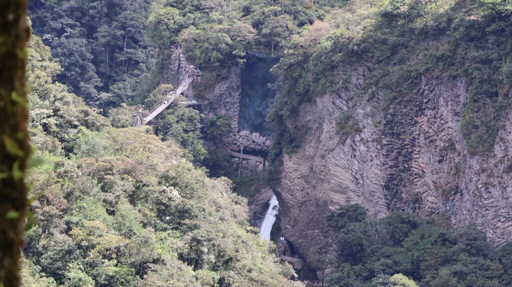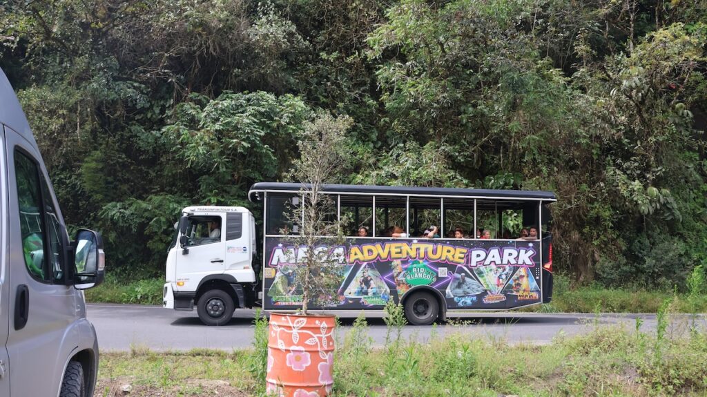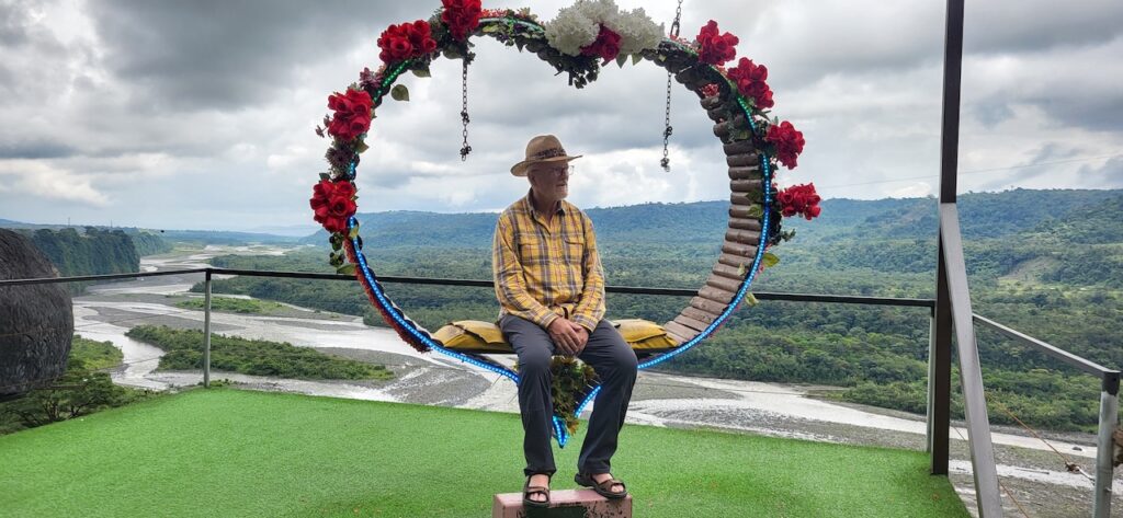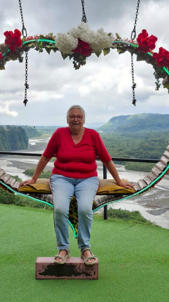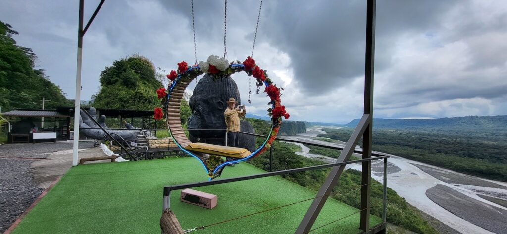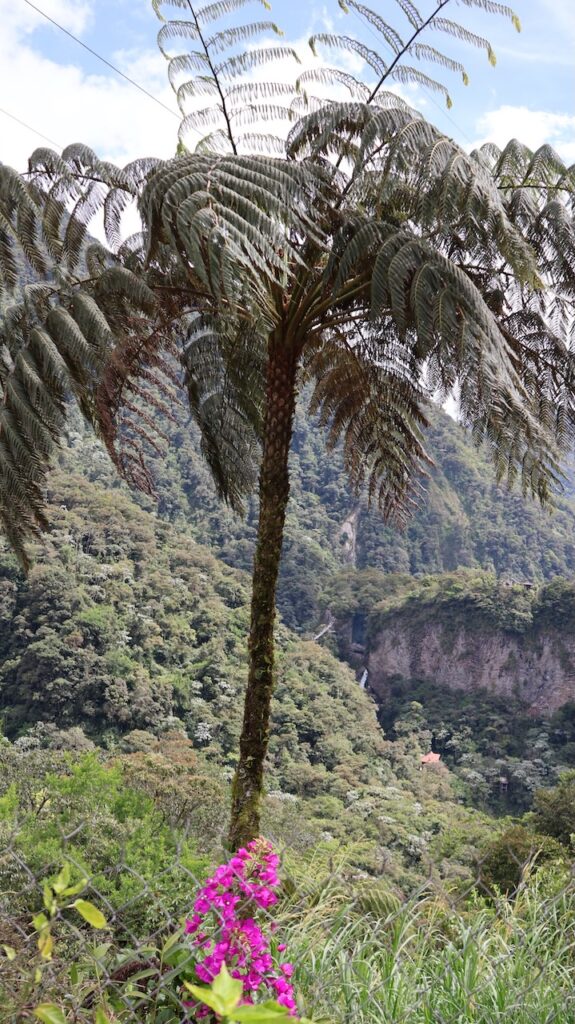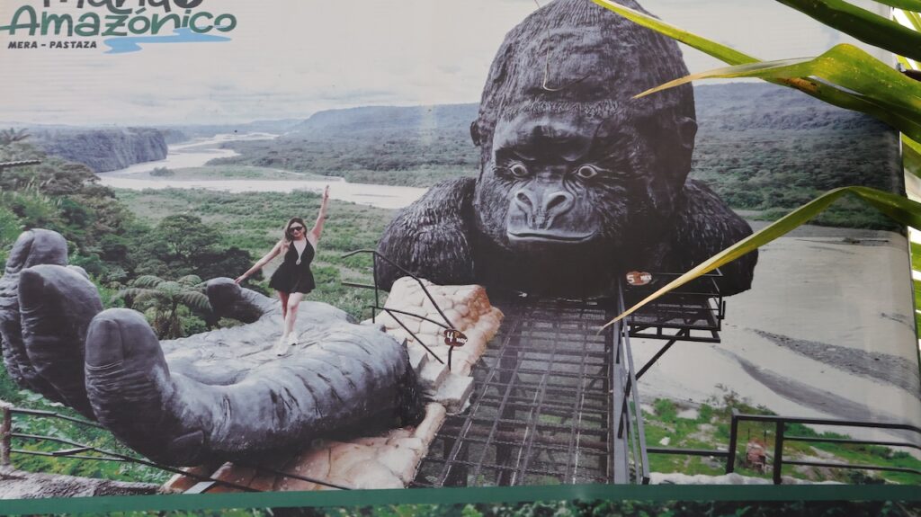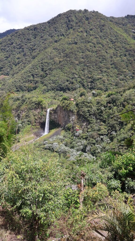 Am Nachmittag sind wir Richtung Osten gefahren. Banos wird auch das Tor zum Amazonas genannt, denn nur 70 Kilometer weiter und das Amazonasgebiet fängt an. Auf der Karte sind keine Strassen mehr eingezeichnet, dafür viele Flüsse. An dieser Strasse kann man einige Wasserfälle besichtigen. Banos ist auch als Abenteuerstadt bekannt. Man kann hier vieles machen, wozu ich definitiv zu alt bin. Gegenüber einem Wasserfall kann man zum Beispiel auf einer riesigen Schaukel über den Abgrund schaukeln. Schon beim Anblick wird mir schlecht. Wir fahren bis zur Mundo Amazonico. In meiner Naivität dachte ich, dem Namen nach müsste das etwas mit der Natur vom Amazonasgebiet zu tun haben. Also mit Flora und Fauna. Schon am Strassenrand dorthin habe ich viele Pflanzen gesehen, die ich gerne fotografiert hätte. Aber es gibt keine Parkplätze, ausser bei den Aussichtspunkten zu den Wasserfällen. Dort wachsen aber nicht die gleichen Pflanzen wie im Wald, den wir durchfahren. Mundo Amazonico ist aber ein Aussichtspunkt auf den Rio Pastaza mit allen möglichen Sujet auf die man sich stellen oder setzen kann. Hat also nichts mit Natur zu tun, ausser dass man im Hintergrund den Fluss sieht.