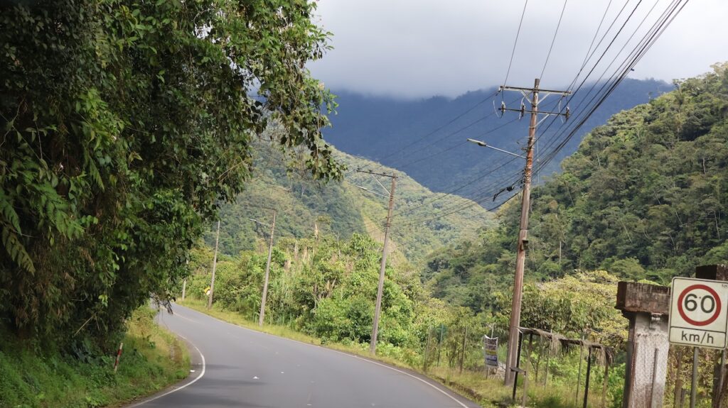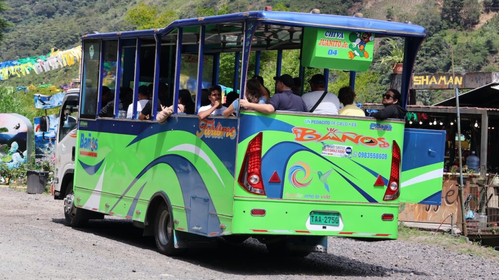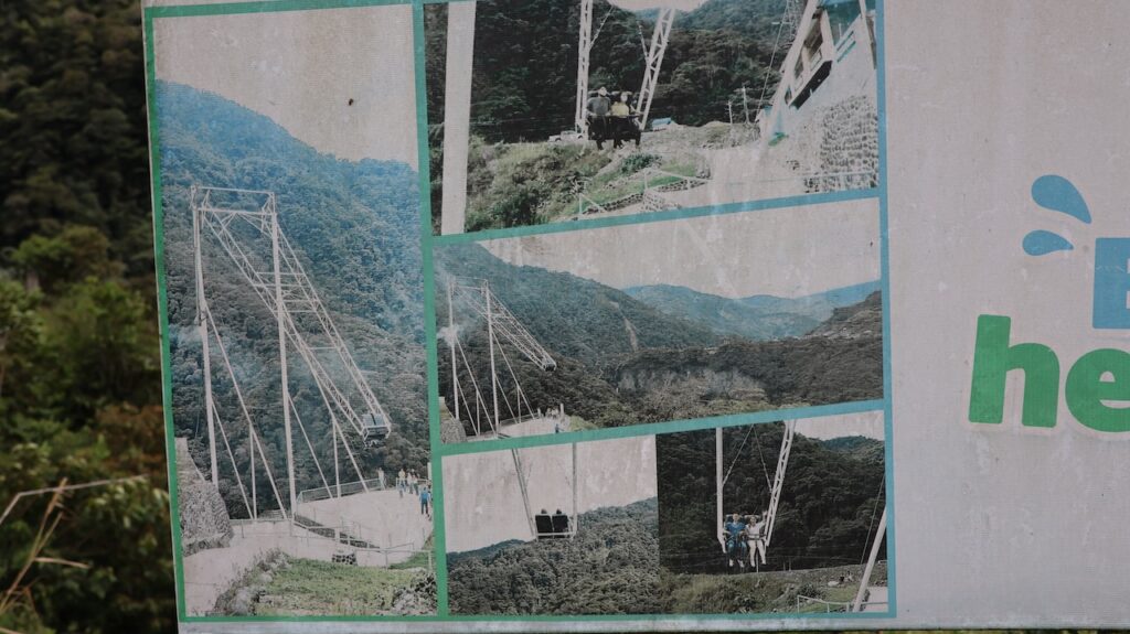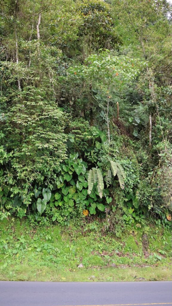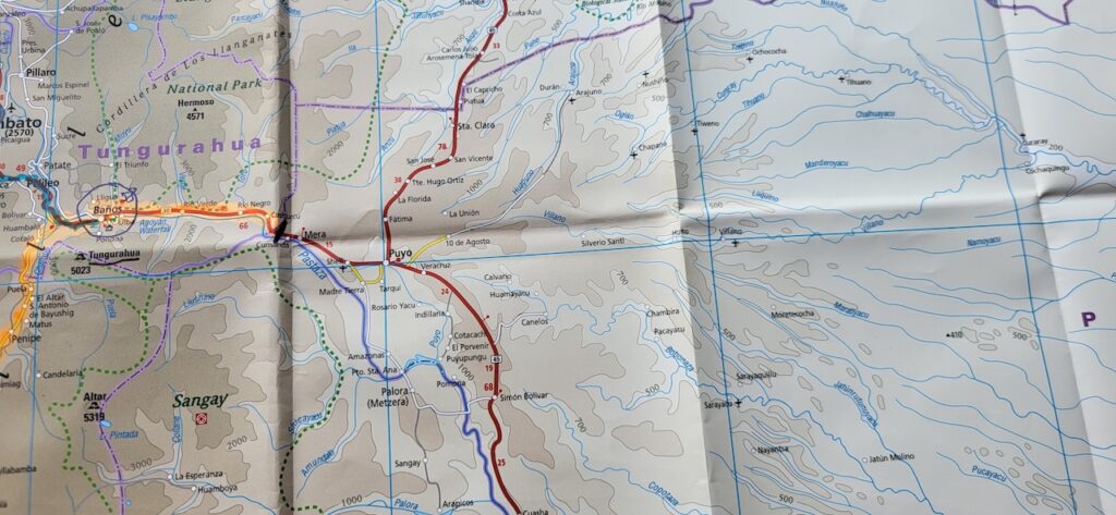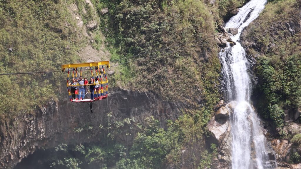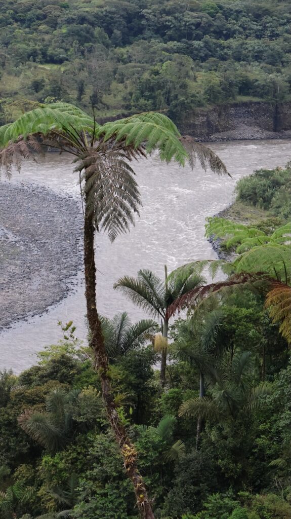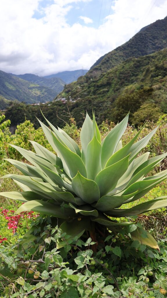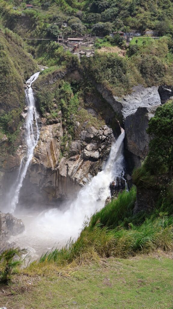 Am Nachmittag sind wir Richtung Osten gefahren. Banos wird auch das Tor zum Amazonas genannt, denn nur 70 Kilometer weiter und das Amazonasgebiet fängt an. Auf der Karte sind keine Strassen mehr eingezeichnet, dafür viele Flüsse. An dieser Strasse kann man einige Wasserfälle besichtigen. Banos ist auch als Abenteuerstadt bekannt. Man kann hier vieles machen, wozu ich definitiv zu alt bin. Gegenüber einem Wasserfall kann man zum Beispiel auf einer riesigen Schaukel über den Abgrund schaukeln. Schon beim Anblick wird mir schlecht. Wir fahren bis zur Mundo Amazonico. In meiner Naivität dachte ich, dem Namen nach müsste das etwas mit der Natur vom Amazonasgebiet zu tun haben. Also mit Flora und Fauna. Schon am Strassenrand dorthin habe ich viele Pflanzen gesehen, die ich gerne fotografiert hätte. Aber es gibt keine Parkplätze, ausser bei den Aussichtspunkten zu den Wasserfällen. Dort wachsen aber nicht die gleichen Pflanzen wie im Wald, den wir durchfahren. Mundo Amazonico ist aber ein Aussichtspunkt auf den Rio Pastaza mit allen möglichen Sujet auf die man sich stellen oder setzen kann. Hat also nichts mit Natur zu tun, ausser dass man im Hintergrund den Fluss sieht.