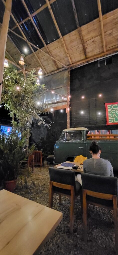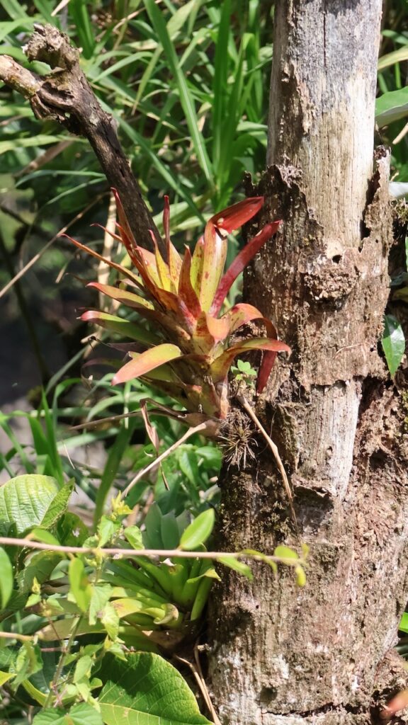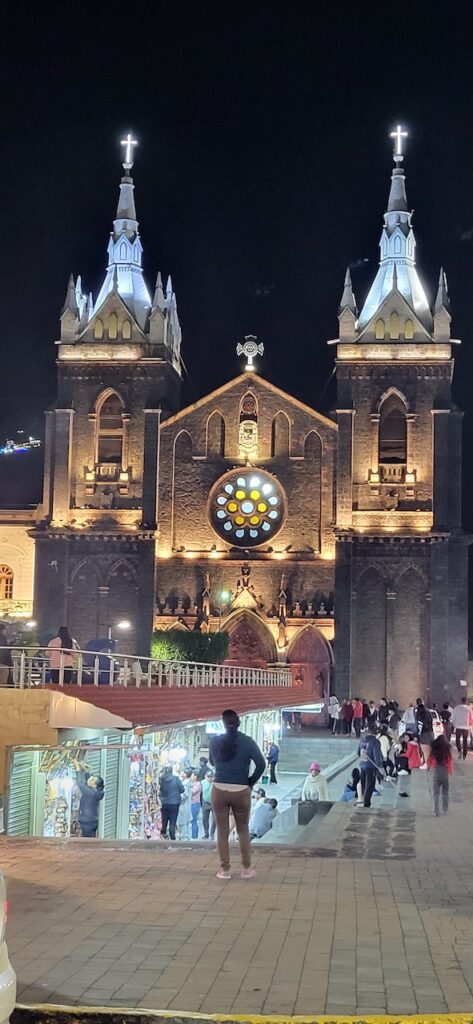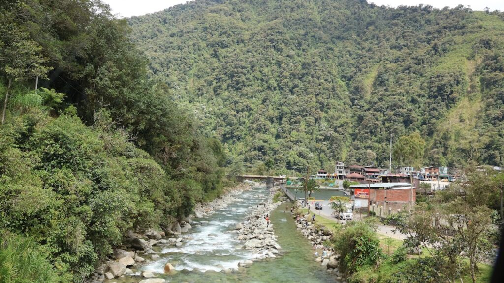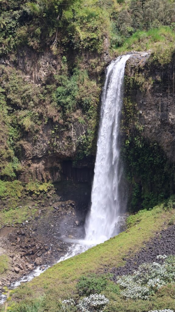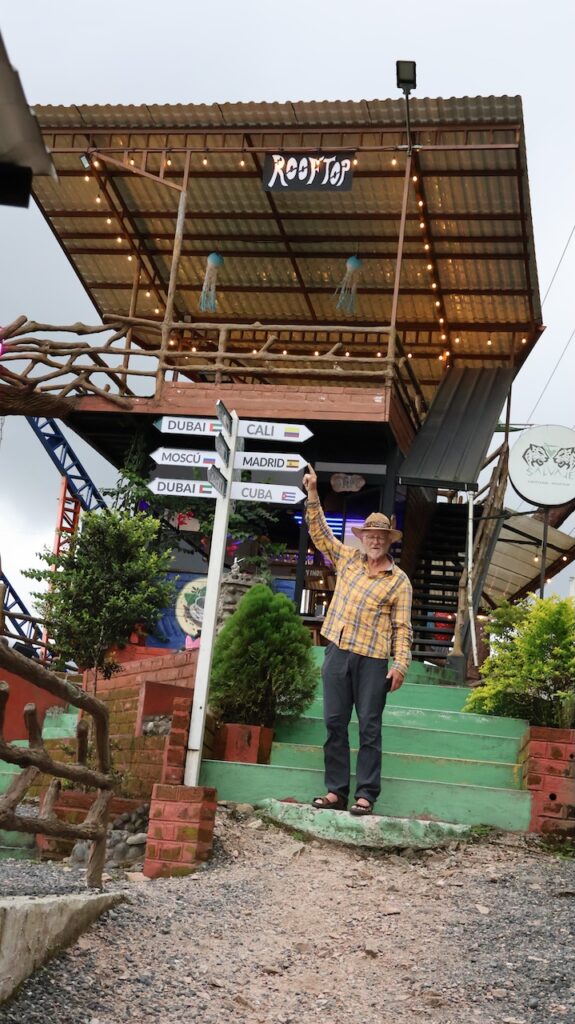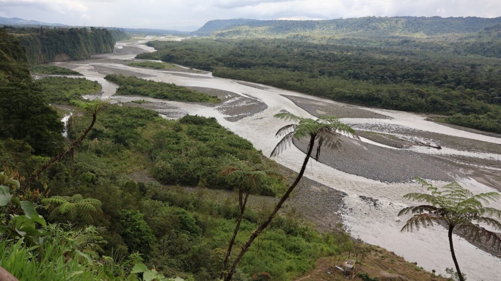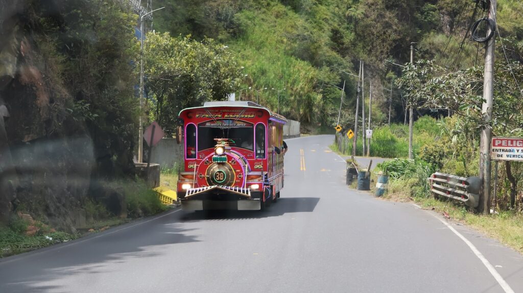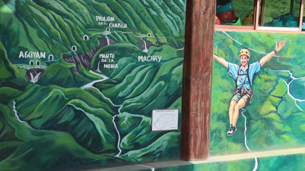Am Nachmittag sind wir Richtung Osten gefahren. Banos wird auch das Tor zum Amazonas genannt, denn nur 70 Kilometer weiter und das Amazonasgebiet fängt an. Auf der Karte sind keine Strassen mehr eingezeichnet, dafür viele Flüsse. An dieser Strasse kann man einige Wasserfälle besichtigen. Banos ist auch als Abenteuerstadt bekannt. Man kann hier vieles machen, wozu ich definitiv zu alt bin. Gegenüber einem Wasserfall kann man zum Beispiel auf einer riesigen Schaukel über den Abgrund schaukeln. Schon beim Anblick wird mir schlecht. Wir fahren bis zur Mundo Amazonico. In meiner Naivität dachte ich, dem Namen nach müsste das etwas mit der Natur vom Amazonasgebiet zu tun haben. Also mit Flora und Fauna. Schon am Strassenrand dorthin habe ich viele Pflanzen gesehen, die ich gerne fotografiert hätte. Aber es gibt keine Parkplätze, ausser bei den Aussichtspunkten zu den Wasserfällen. Dort wachsen aber nicht die gleichen Pflanzen wie im Wald, den wir durchfahren. Mundo Amazonico ist aber ein Aussichtspunkt auf den Rio Pastaza mit allen möglichen Sujet auf die man sich stellen oder setzen kann. Hat also nichts mit Natur zu tun, ausser dass man im Hintergrund den Fluss sieht.