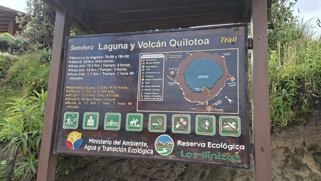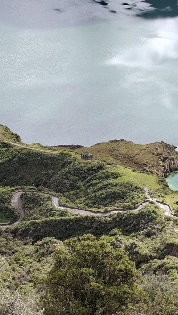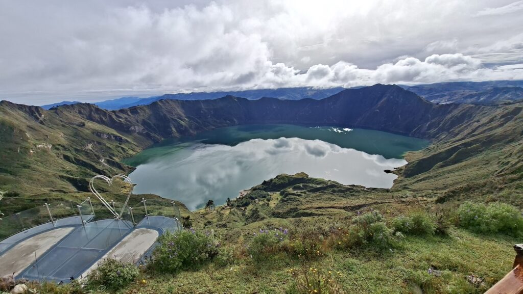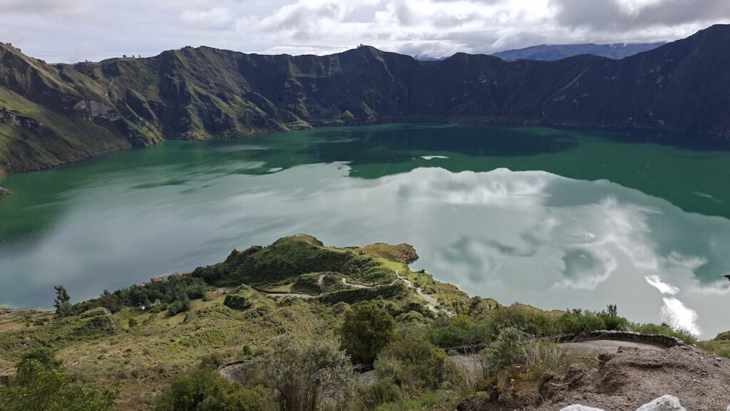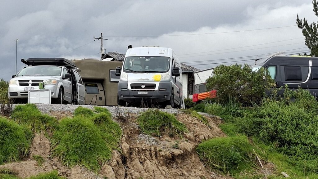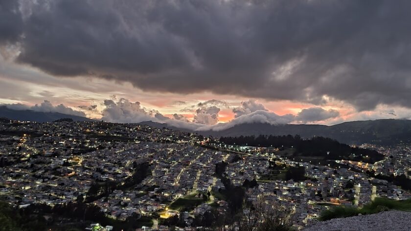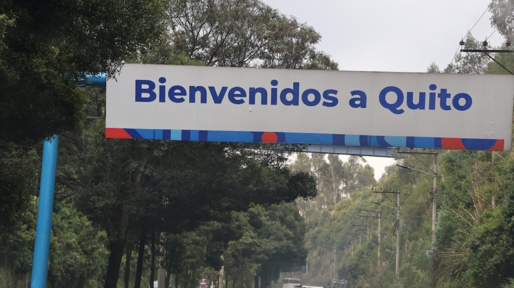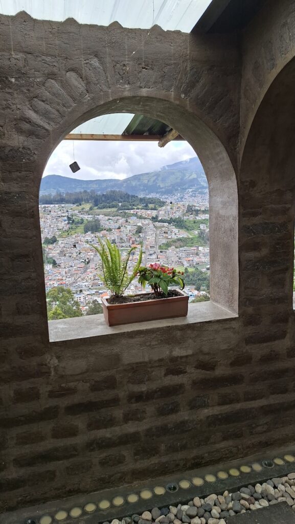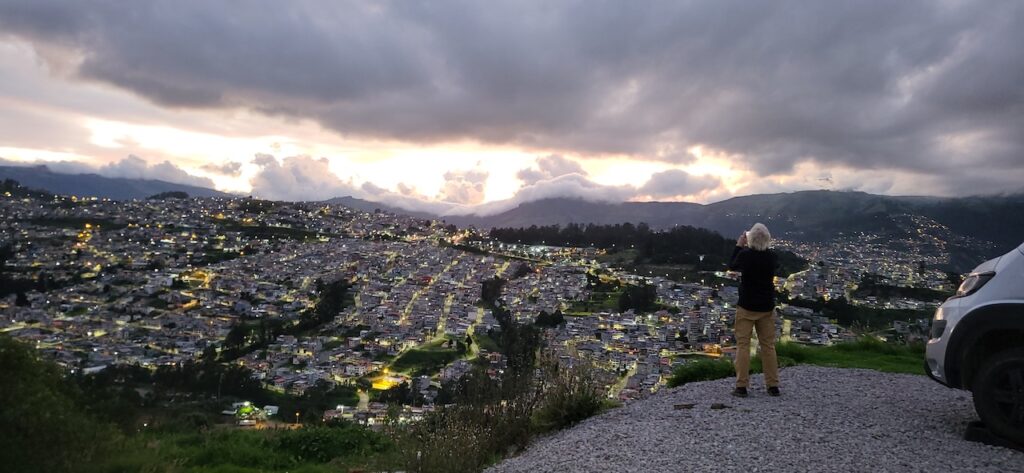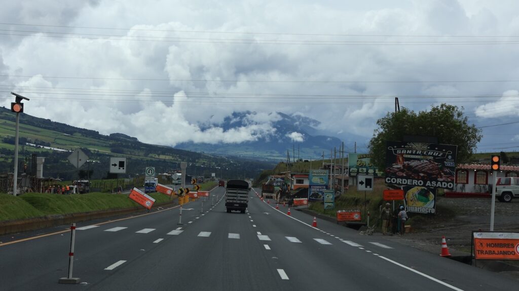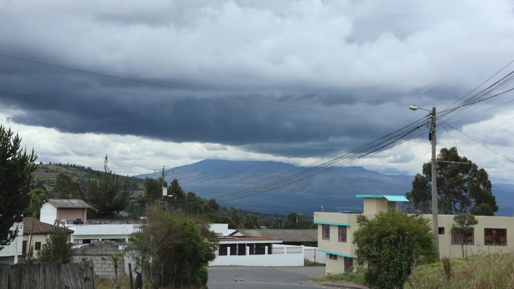 Kurz bevor wir wieder auf die Autobahn kommen, sehen wir noch den unteren Teil des Coxopaxi (5897m). Der obere Teil ist im Nebel verschwunden. Während wir auf der Autobahn fahren, können wir keinen der zahlreichen Vulkane links und rechts sehen. Als wir in Quito einfahren, fängt es an zu regnen. Beim Campingplatz angekommen, hört es wieder auf. Wir geniessen eine wunderbare Aussicht auf Quito.