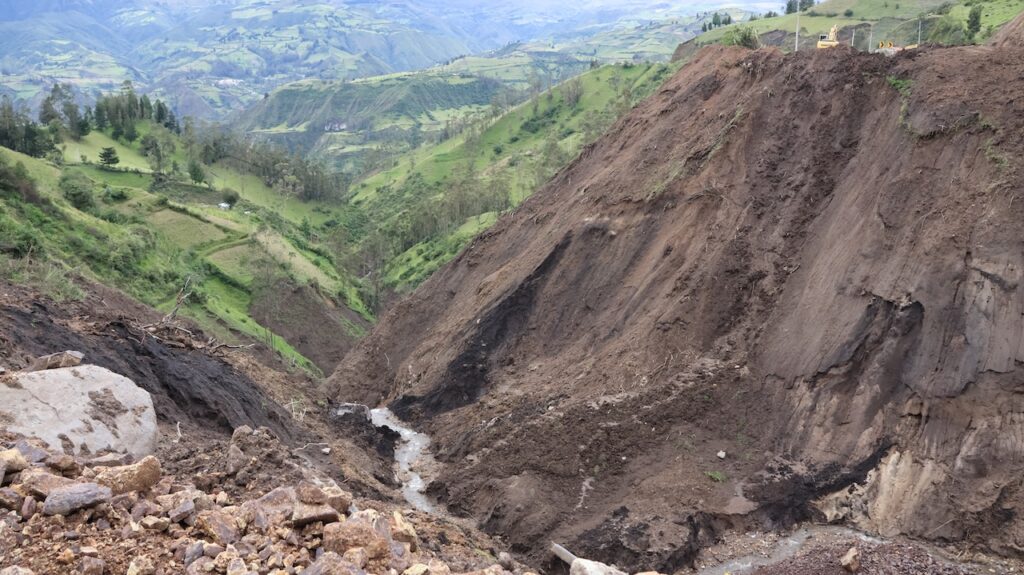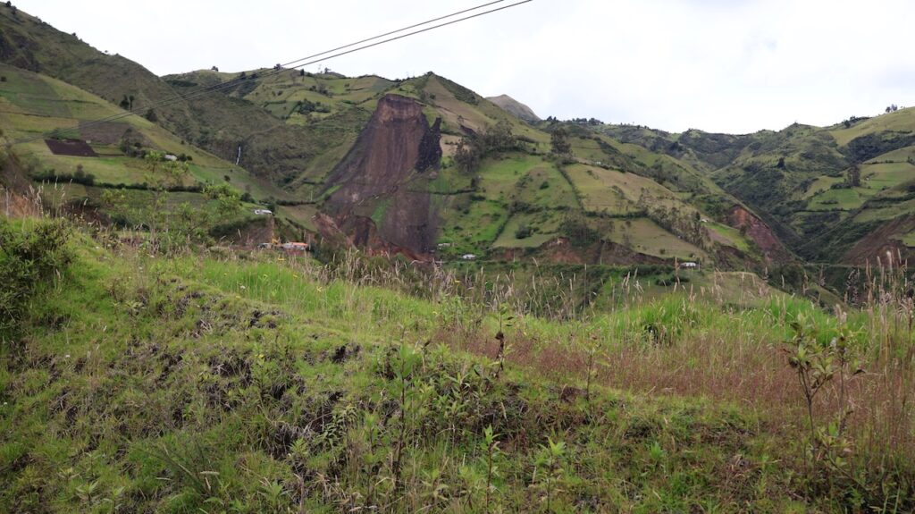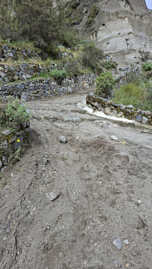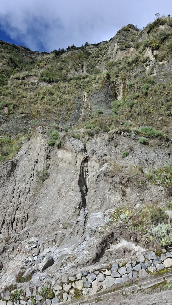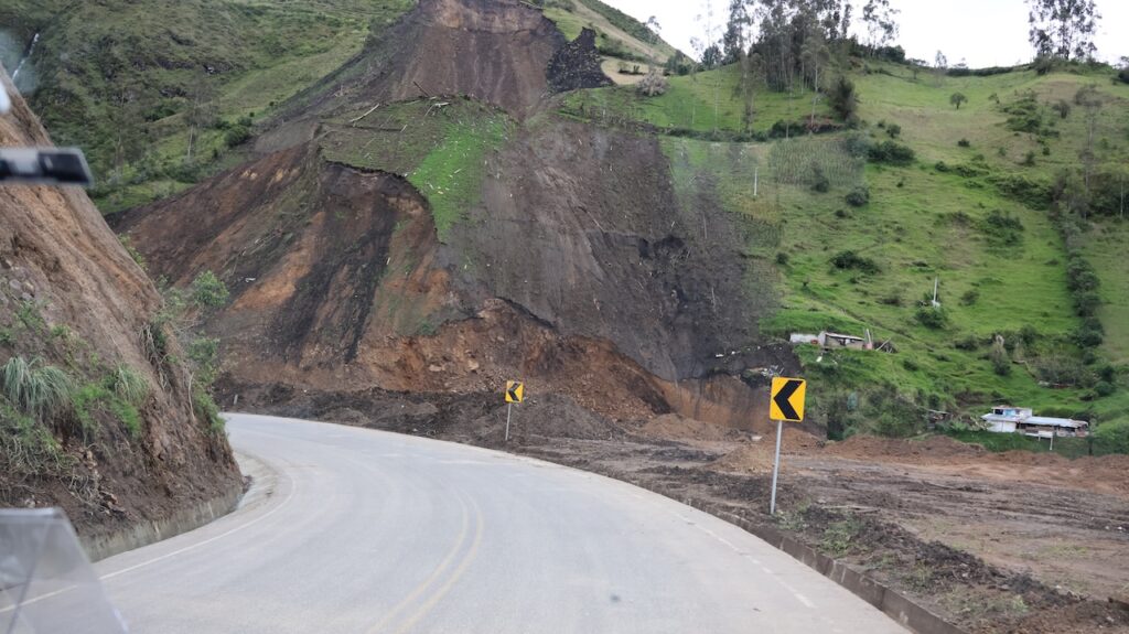 Manfred hat sich wieder in den Kopf gesetzt, die weiss eingezeichnete Strasse zu befahren. Ich finde das keine gute Idee nach den heftigen Regenfällen. Aber er ist der Fahrer. Die Strasse fällt anfangs steil ab und bleibt dann lange auf 3500m. Wir können noch den Ort am Kraterrand sehen. Danach verläuft die Strasse immer einer Schlucht entlang. Sie ist gut in Schuss und geteert. Schon bald haben die ersten Erdlawinen die Strasse getroffen. Es gibt viele kleine und etliche grosse Erdlawinen. Eine ist besonders gross und es ist noch nicht alles weggeräumt. Demnach geschah der Abbruch noch nicht lange. Es sieht immer so aus, als wäre die Erde über die drunterliegende Felswand abgerutscht.