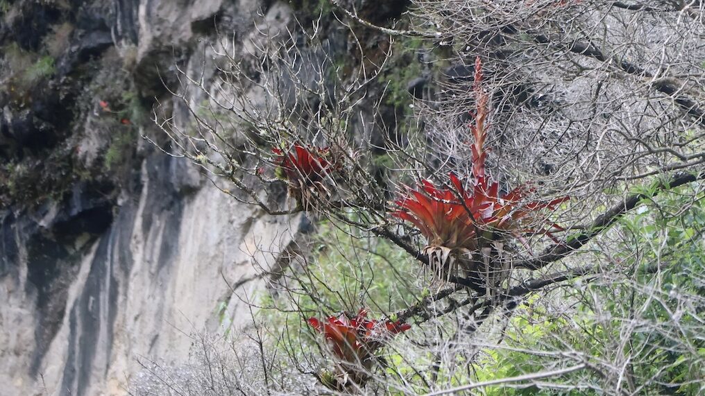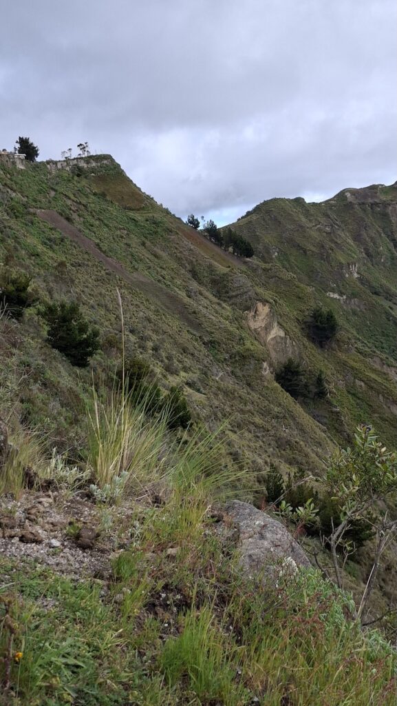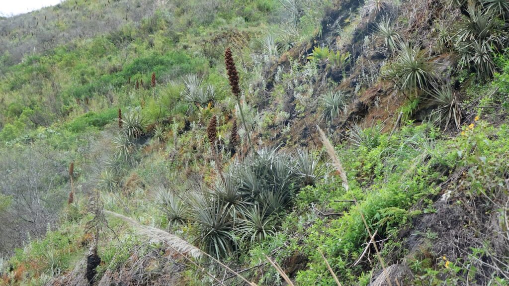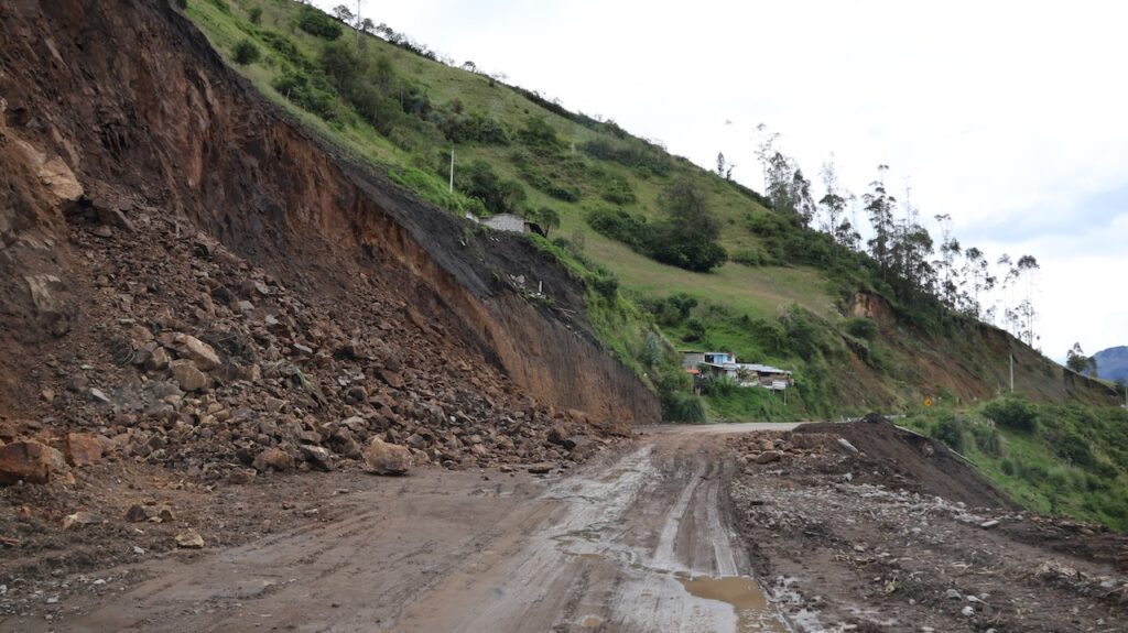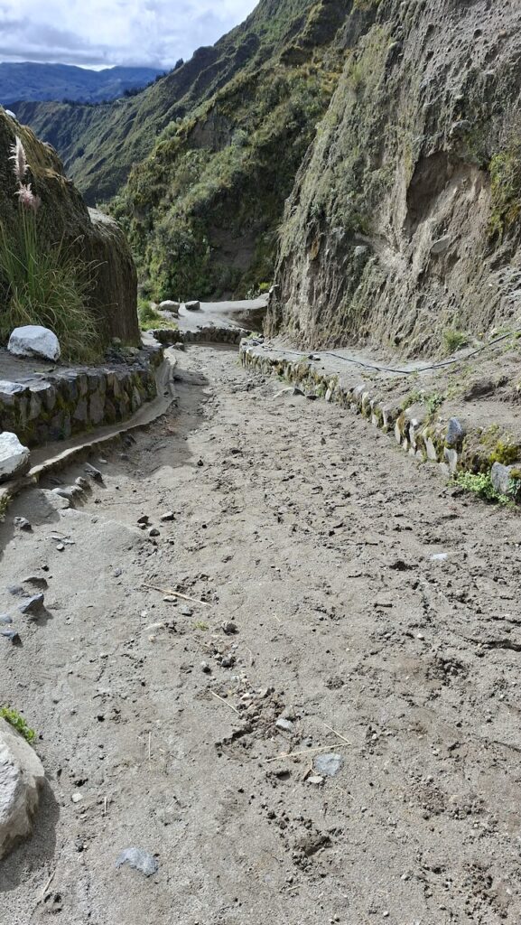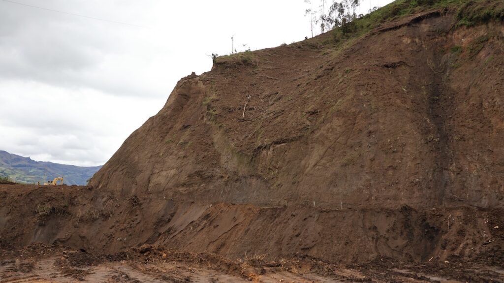 Manfred hat sich wieder in den Kopf gesetzt, die weiss eingezeichnete Strasse zu befahren. Ich finde das keine gute Idee nach den heftigen Regenfällen. Aber er ist der Fahrer. Die Strasse fällt anfangs steil ab und bleibt dann lange auf 3500m. Wir können noch den Ort am Kraterrand sehen. Danach verläuft die Strasse immer einer Schlucht entlang. Sie ist gut in Schuss und geteert. Schon bald haben die ersten Erdlawinen die Strasse getroffen. Es gibt viele kleine und etliche grosse Erdlawinen. Eine ist besonders gross und es ist noch nicht alles weggeräumt. Demnach geschah der Abbruch noch nicht lange. Es sieht immer so aus, als wäre die Erde über die drunterliegende Felswand abgerutscht.