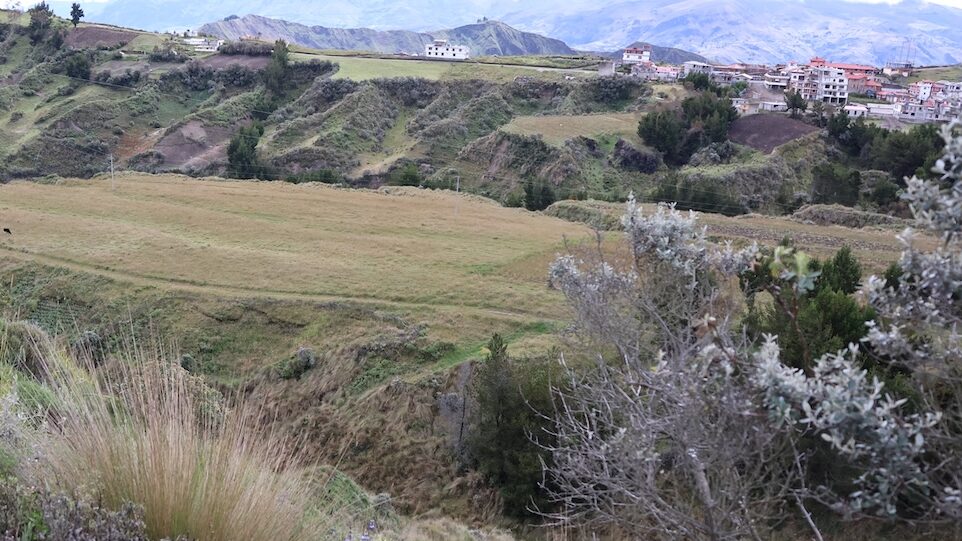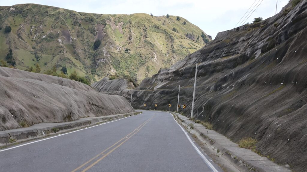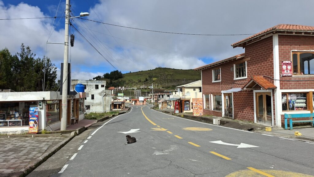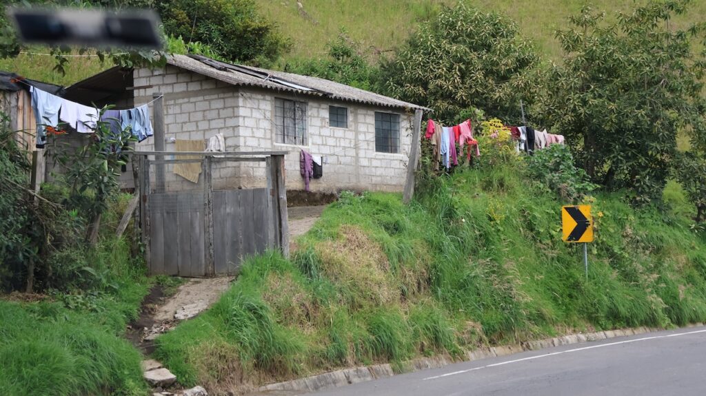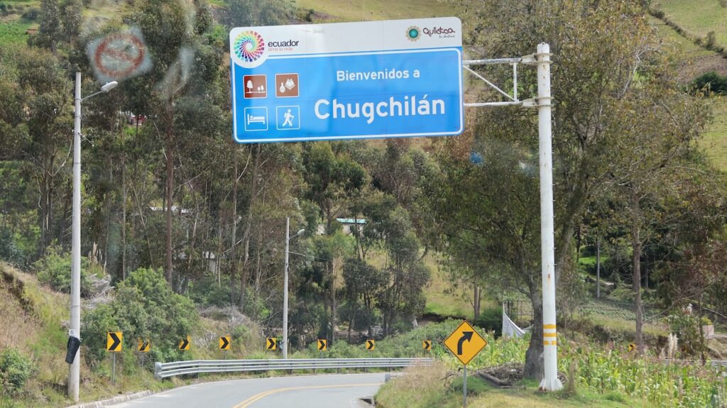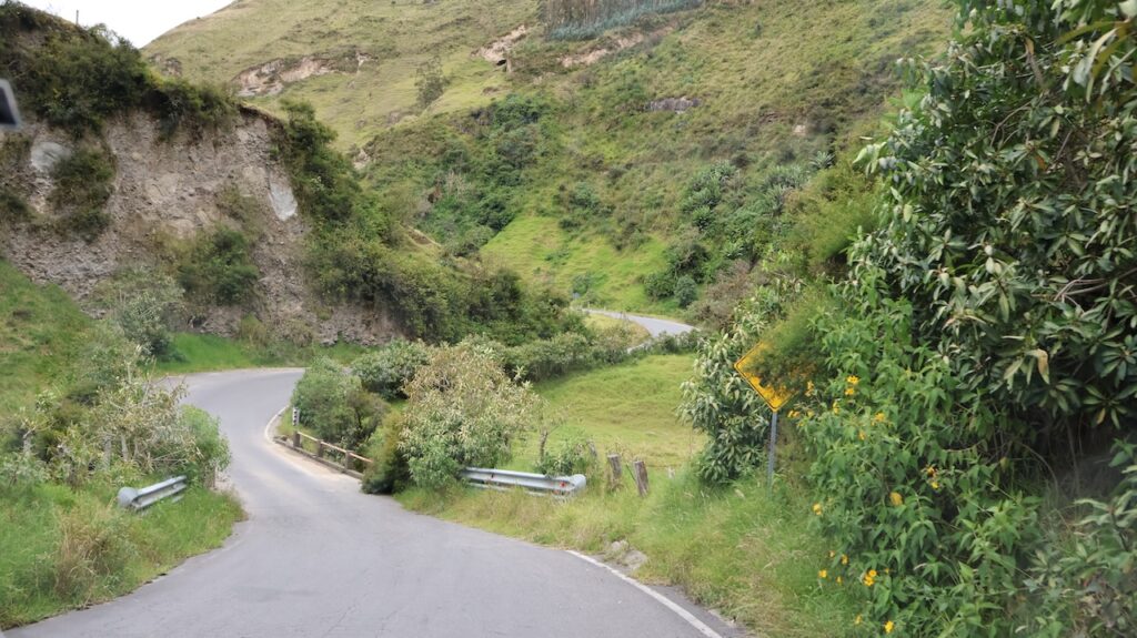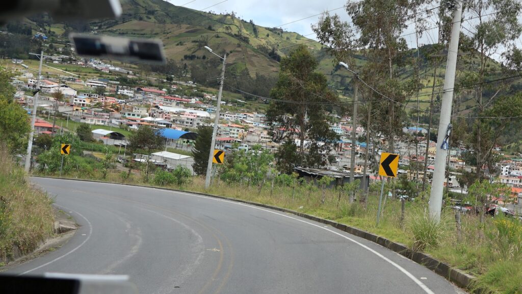 Dörfer gibt es nicht viele. Das Grösste ist Sigchos. Aber auch die zwei kleinen Orte haben überdimensionierte Ortstafeln. Am Strassenrand laufen Gänse herum und Schweine sind angebunden. Auch die Kühe sind angebunden und fressen so die Weide von links nach rechts ab. Die Häuser werden auch wieder schäbiger. Nach der Schlucht geht es einige Male in vielen Serpentinen und Haarnadelkurven hinauf und wieder hinunter. Es sind heute wieder so einige Kurven, die Manfred fahren muss.