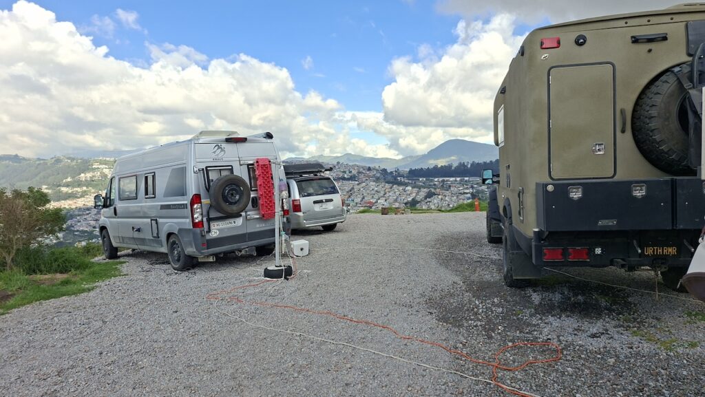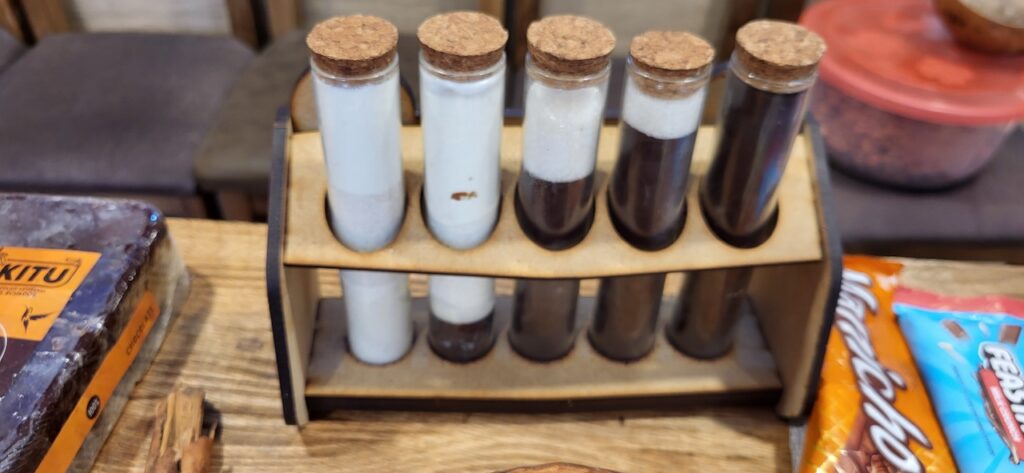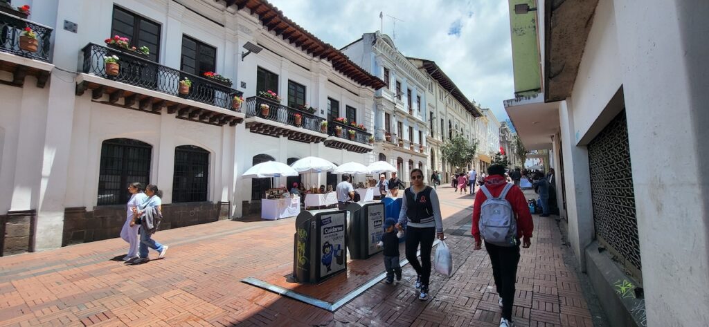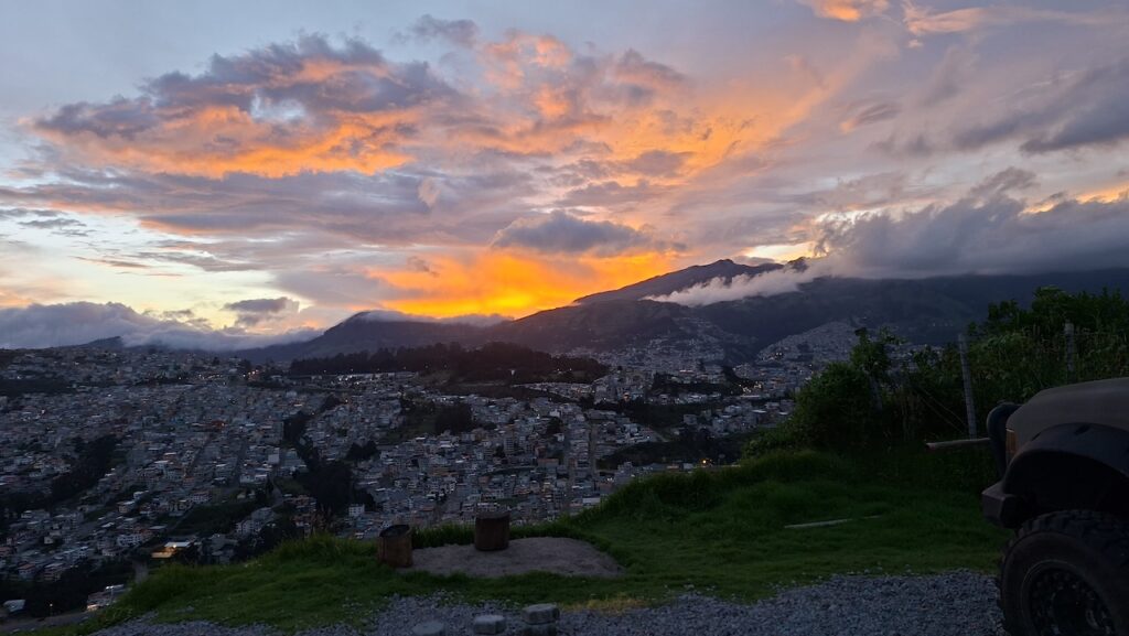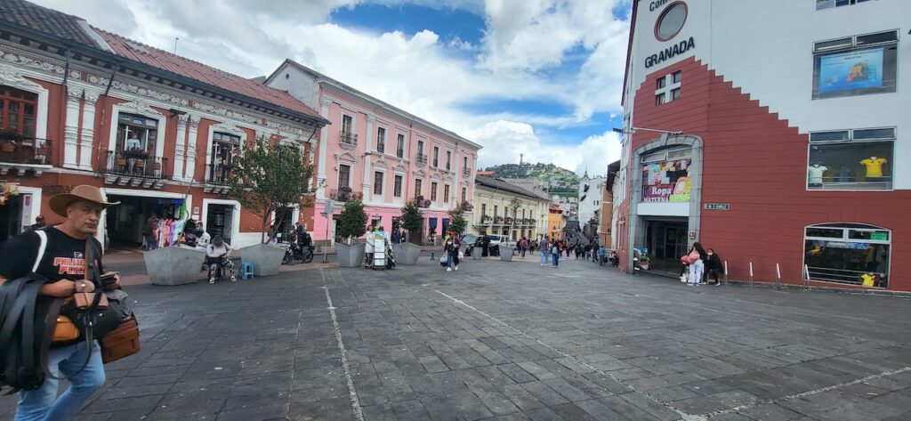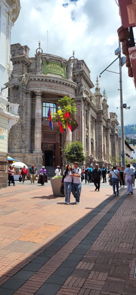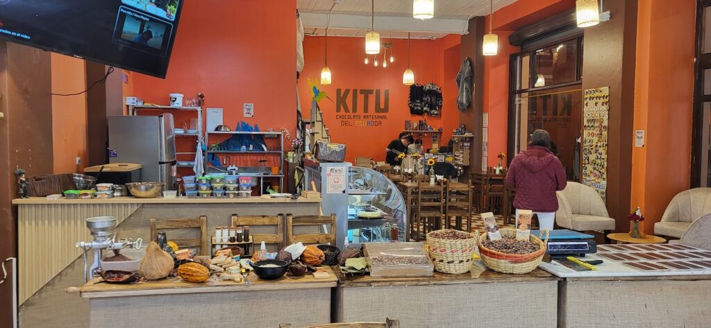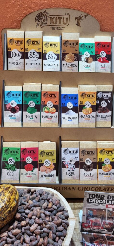 Wir erfahren, dass ein Kakaobaum 3-5 Jahre braucht, um die erste Bohne zu produzieren. Dann kann er aber 40 Jahre lang jedes Jahr 30 bis 50 Bohnen erzeugen. Er sagt, dass der Kakao aus Ecuador und Brasilien viel besser ist als der Kakao aus Afrika. Die Bohne aus Afrika ist eher dunkel und lang, die aus Südamerika gelb und kürzer. Im Familienunternehmen wird nur Schokolade aus 65% oder 85% Kakao hergestellt. Wir sehen in Reagenzgläsern, was in einer Schokolade drinnen ist. So eine Schokolade von Nestlé hat nur wenig Kakao drinnen, viel Milchpulver und Zucker, ausser es ist anders angeschrieben. Hier wird der Kakao in einem kleinen Ofen geröstet. Sieht aus wie ein Microwellenofen bei uns zu Hause. Der Chef persönlich löst dann von Hand die Schale vom Kern. Für ihn sei das wie Mediation. Auch die beiden Conchier Maschinen sind sehr klein. Eine Angestellte haben wir von draussen gesehen Schokoladentafeln von Hand einpacken. Als wir im Geschäft stehen, tabliert sie die Schokoladenmasse auf einem Marmortisch und giesst danach die Tafeln. Nach den vielen Erklärungen dürfen wir alle Geschmacksrichtungen, die sie anbieten probieren. Die Schokolade mit Mandarinen schmeckt mir besonders gut. Wir kaufen natürlich ein paar Tafeln. Sie sind nicht günstig. Eine Tafel mit 85% Kakao kostet 6 Dollar. In Ecuador ist der amerikanische Dollar Staatswährung.